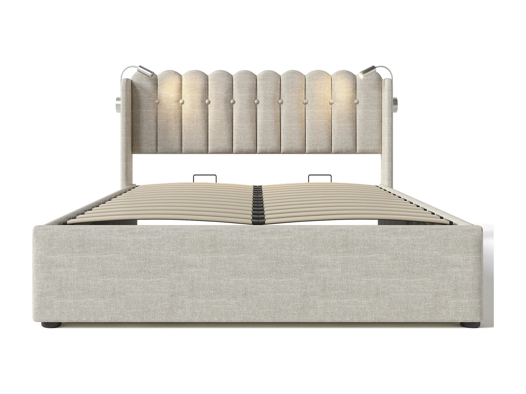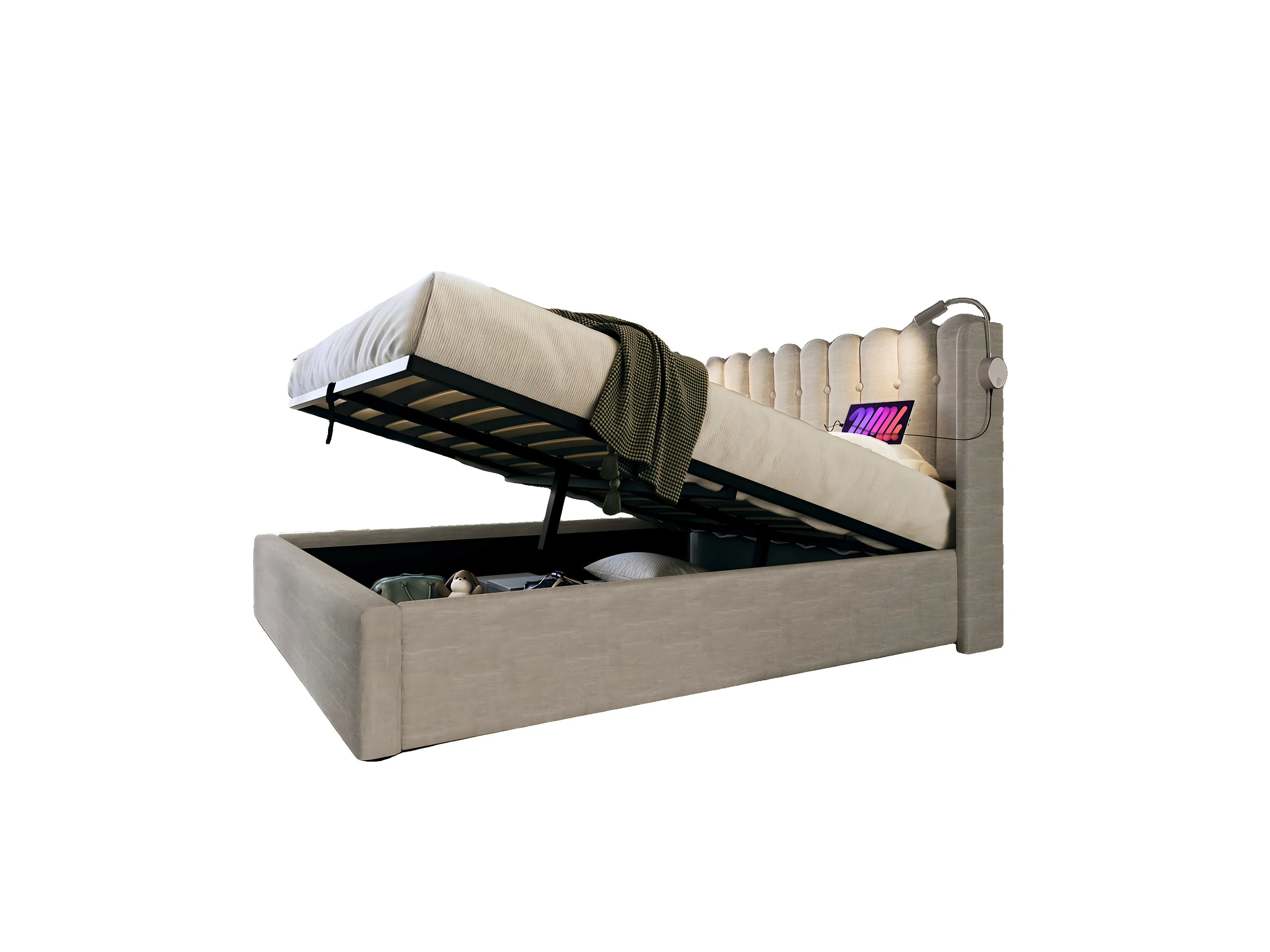 Lit coffre 140x200 cm - avec tête de lit, USB, sommier à lattes - en lin - beige - matelas inclus