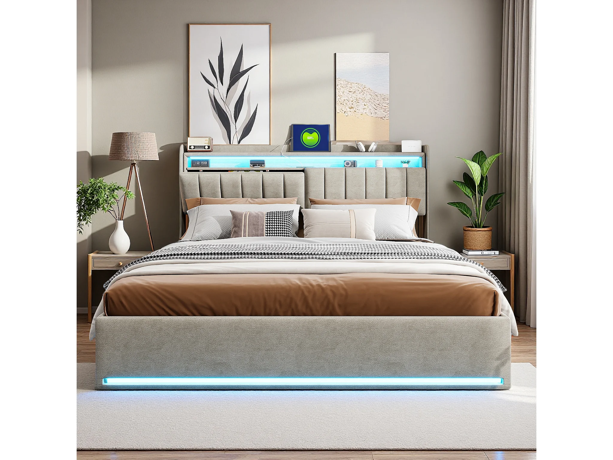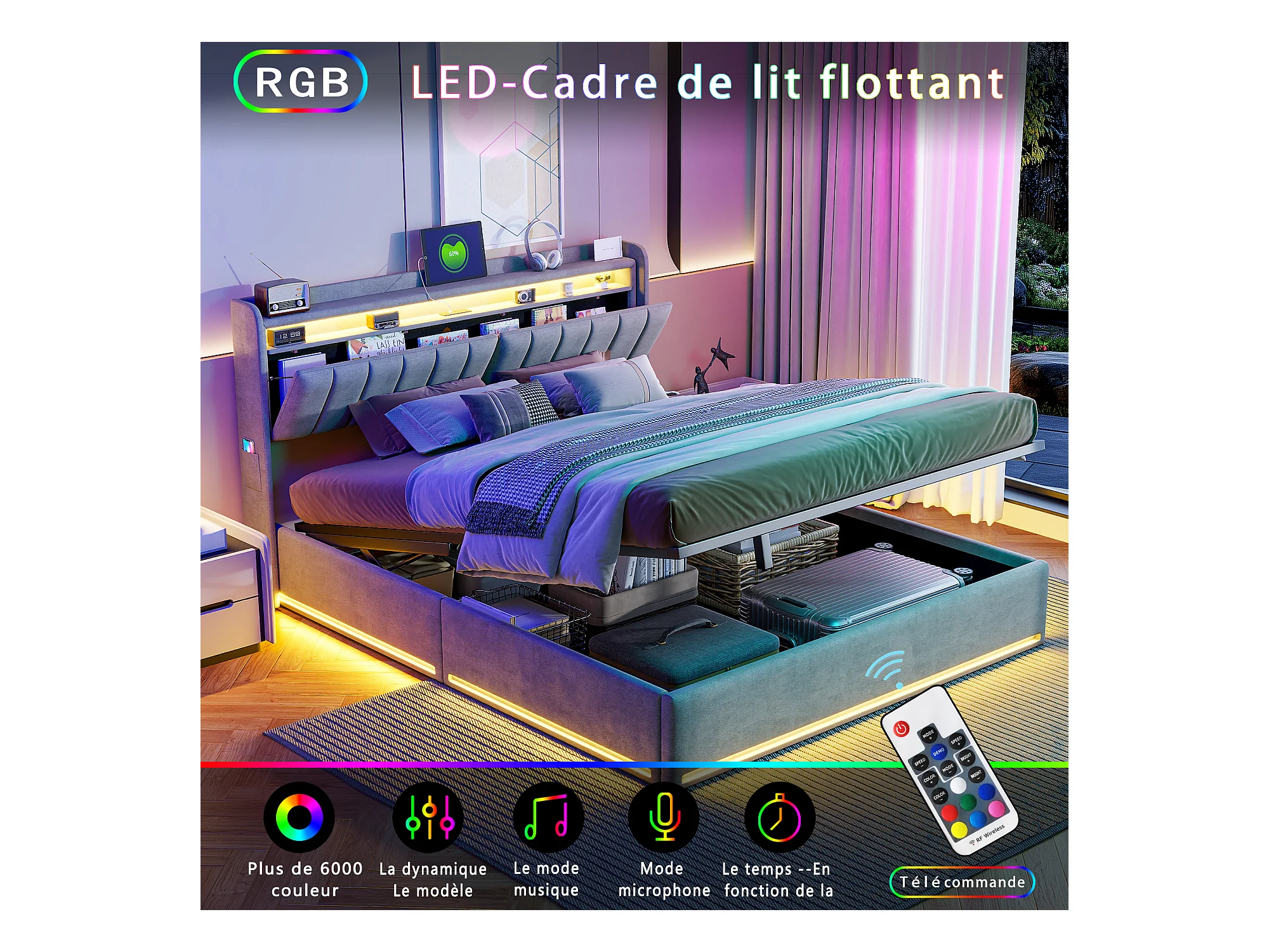 Lit coffre 140x200 cm en tissu velours gris avec tête de lit rembourrée, LED intégrées, rangement pratique, prise USB