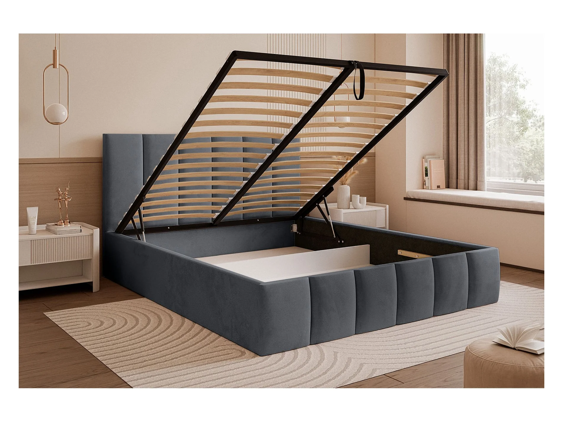 Lit coffre - 140x200 cm - en tissu velours gris foncé - SARAFINO