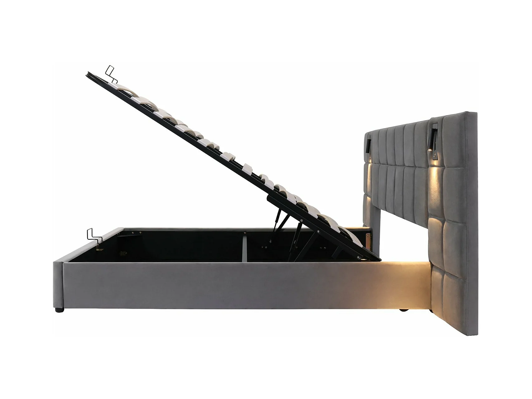 Lit coffre 140×200 cm, lit avec rangement, lampe et charge USB, gris