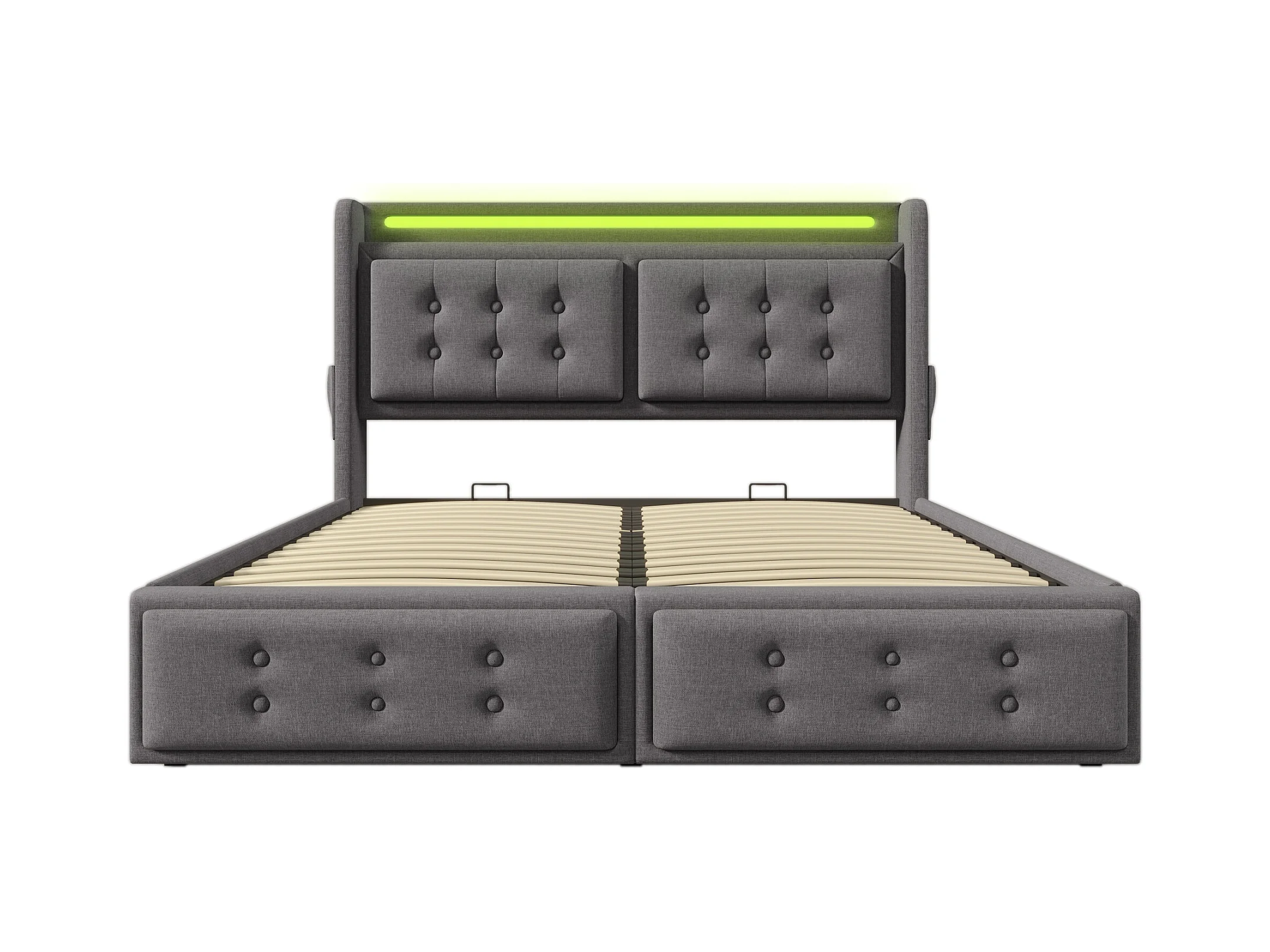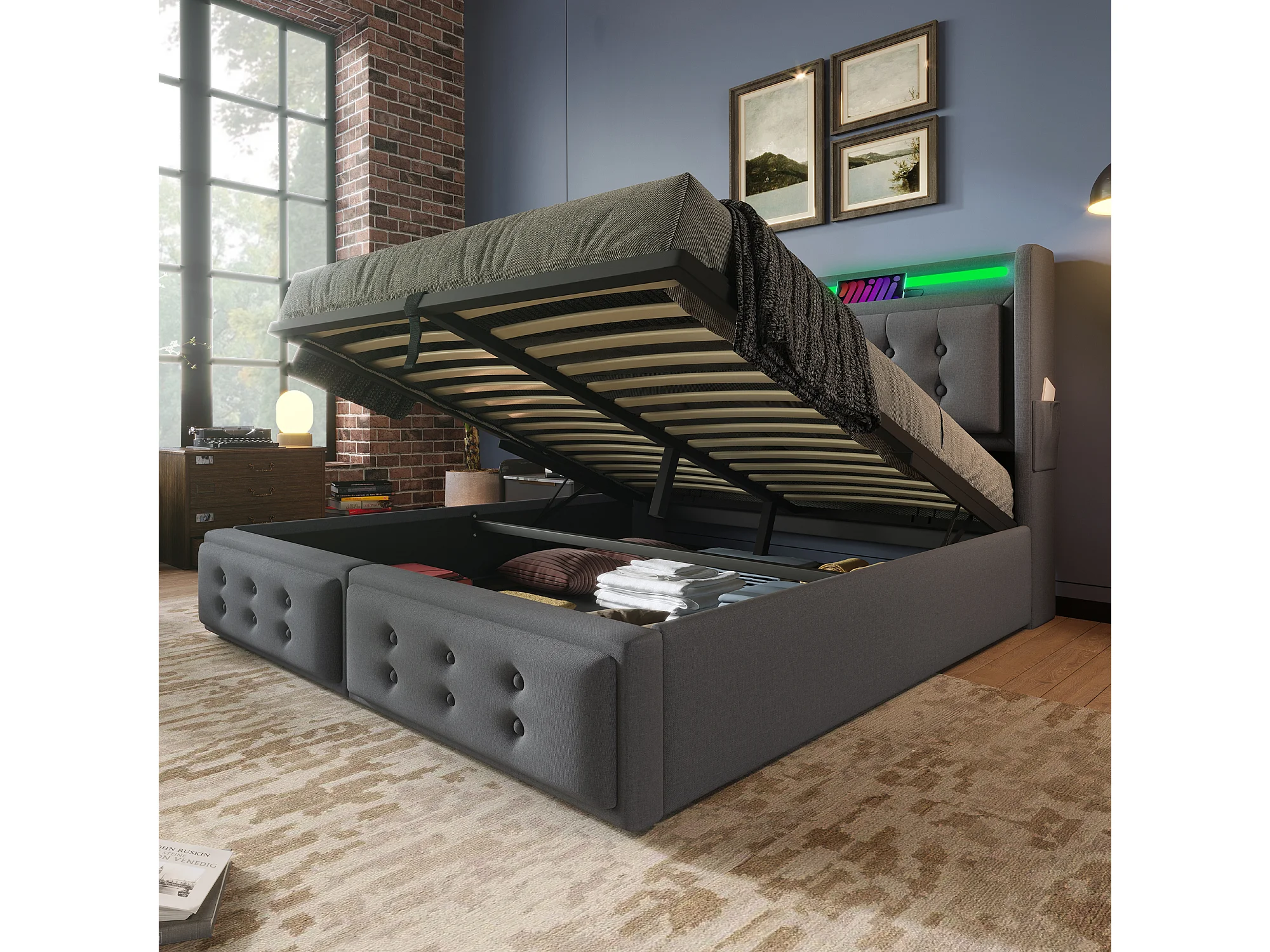 Lit coffre 140x200 cm - lit capitonné avec tête de lit LED et fonction de charge USB C - coton - gris - sans matelas
