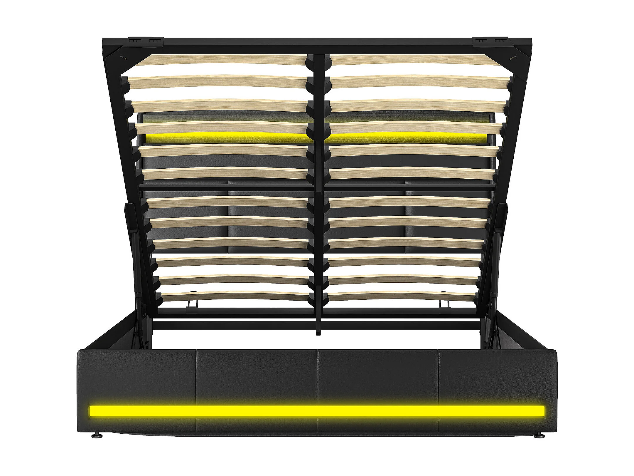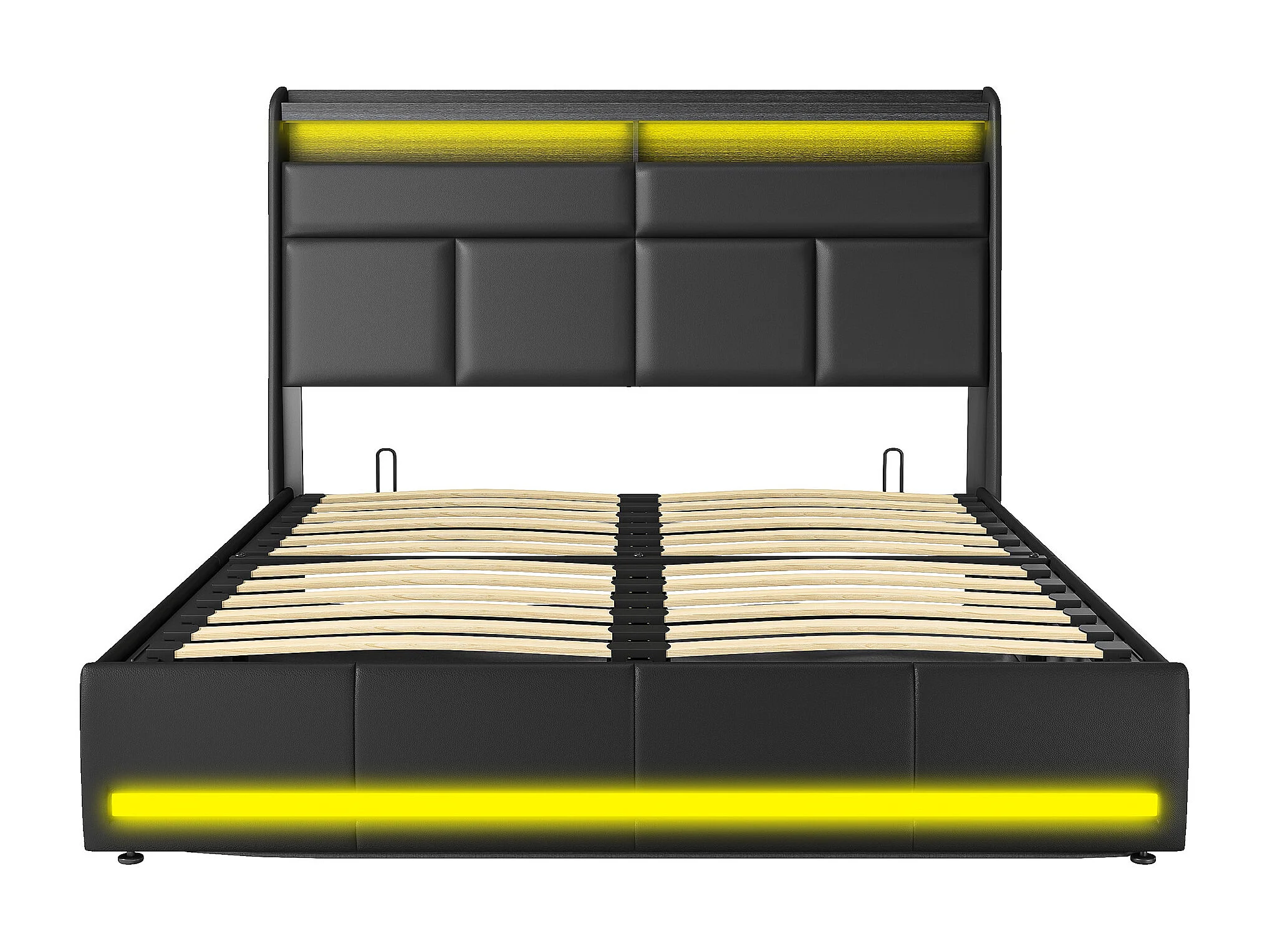 Lit Coffre 140x200, Lit Double avec Rangement, lit 140 x 200 cm avec Sommier LED et USB, Lits Rembourré Cadre de Lits avec à Lattes,PU sans Matelas, Noir