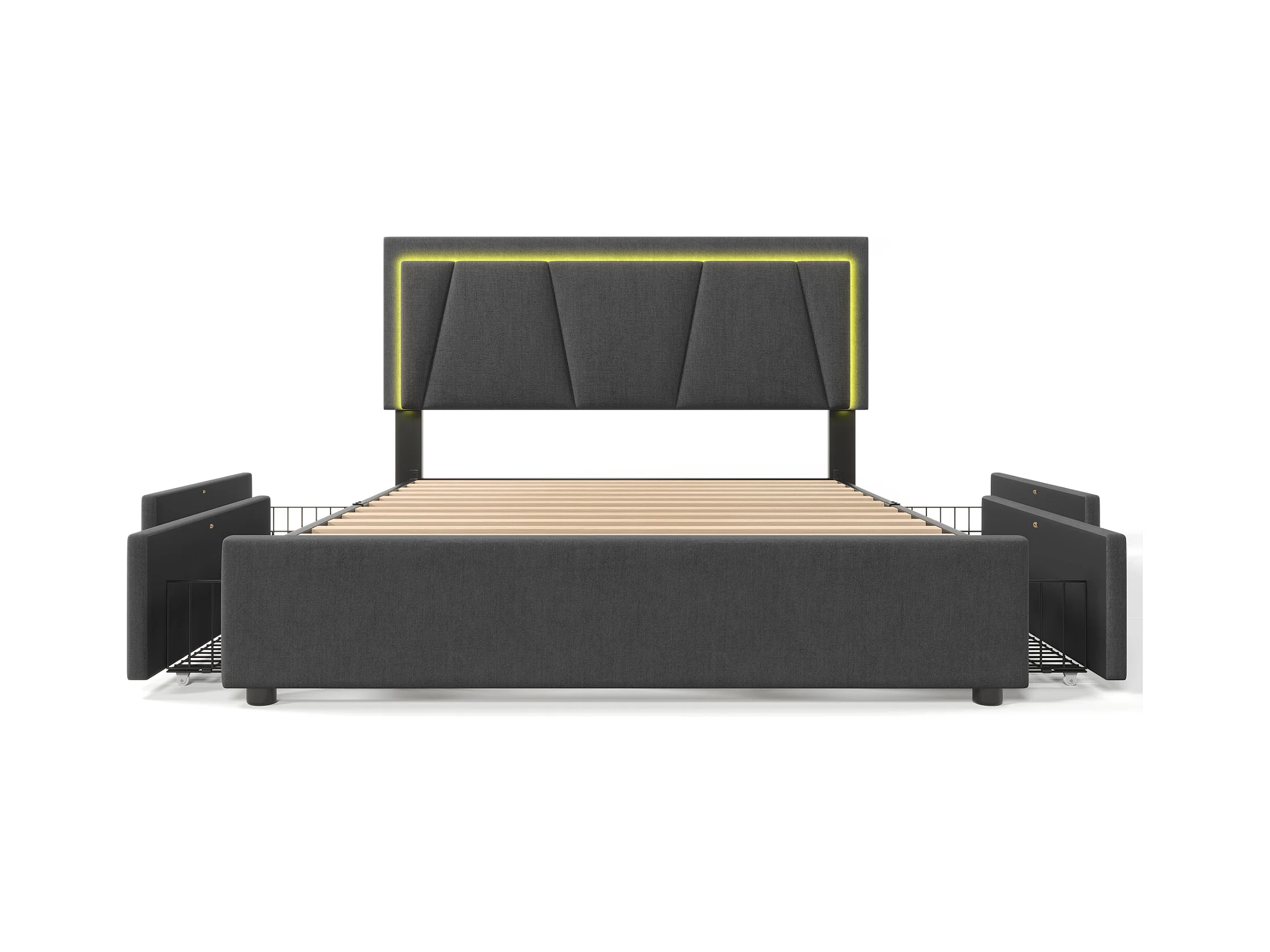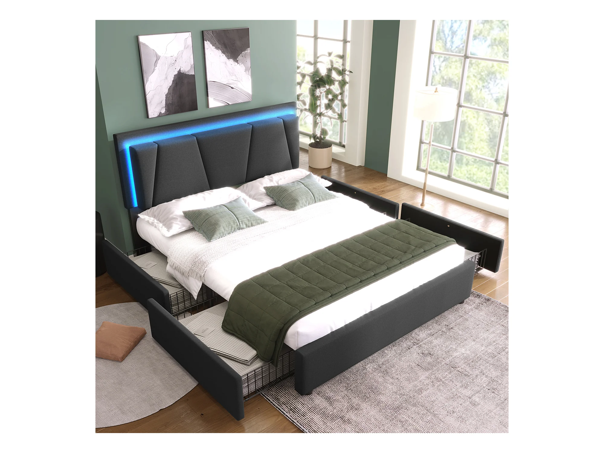 Lit 140x200cm avec 2 tiroirs + LED + sommier à lattes - lin - gris