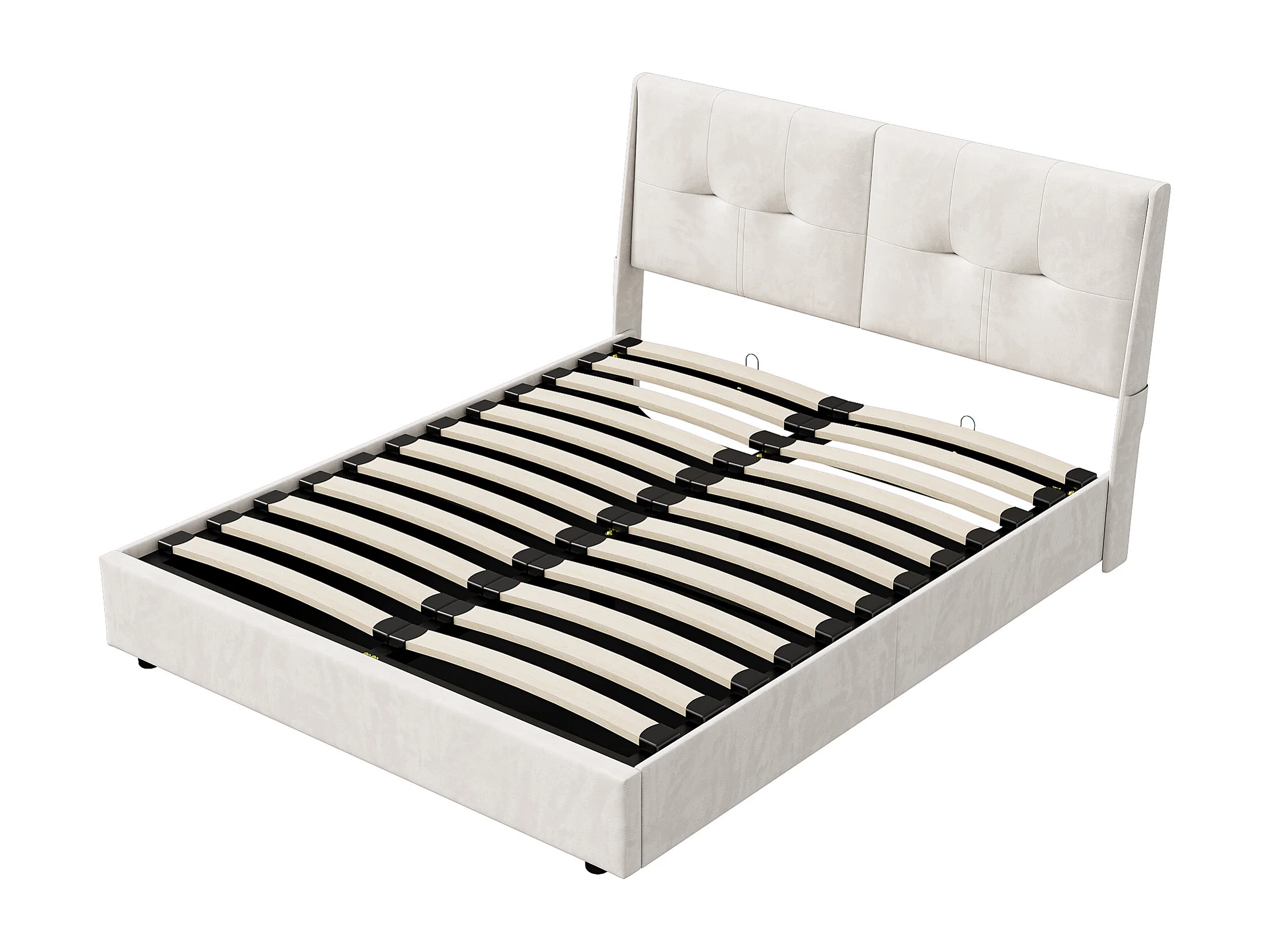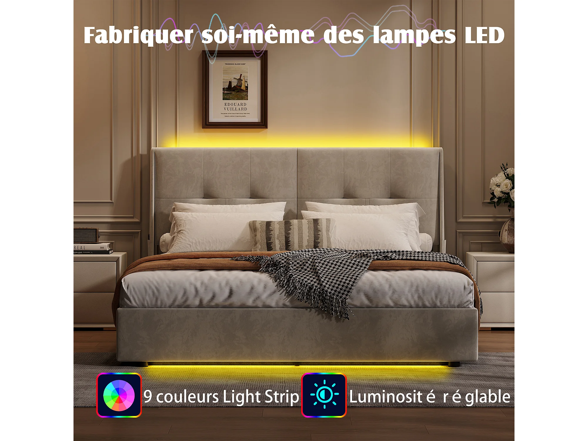 Lit coffre 140x200cm avec éclairage LED et espace de rangement hydraulique - poches latérales dans la tête de lit - beige