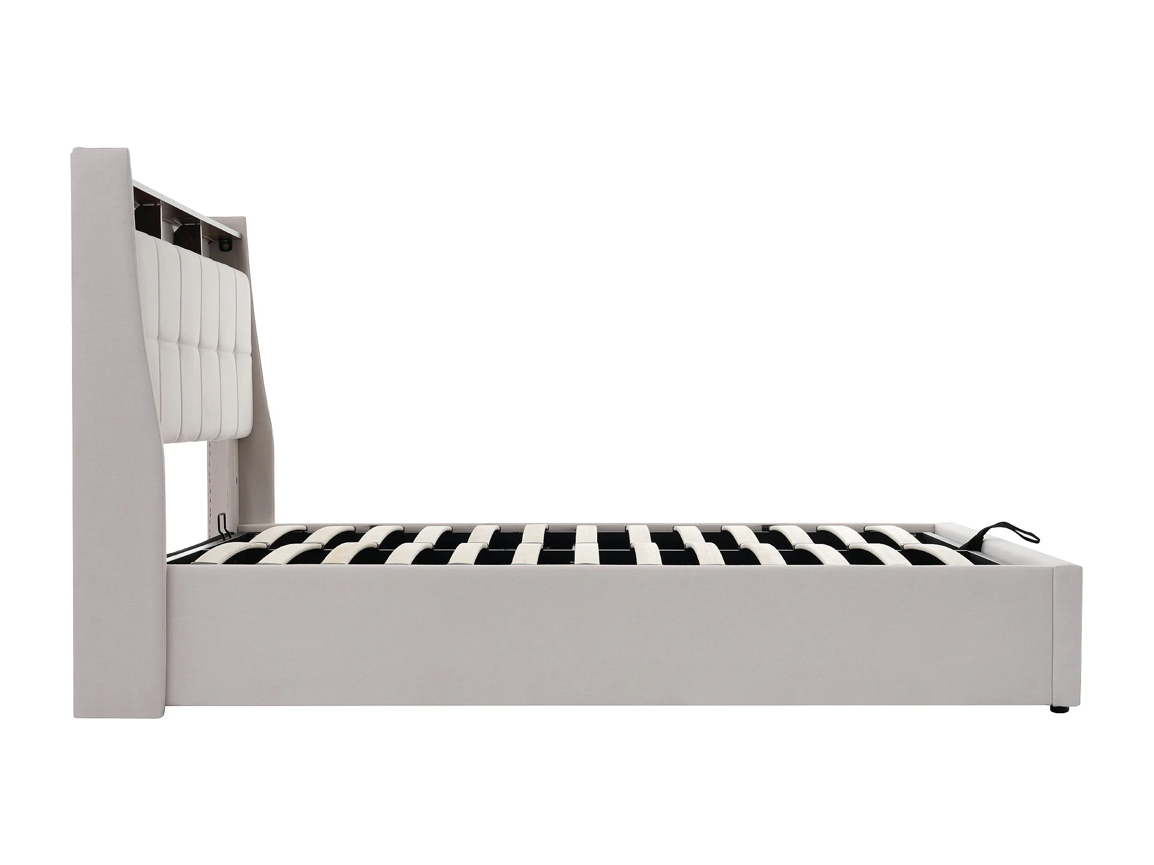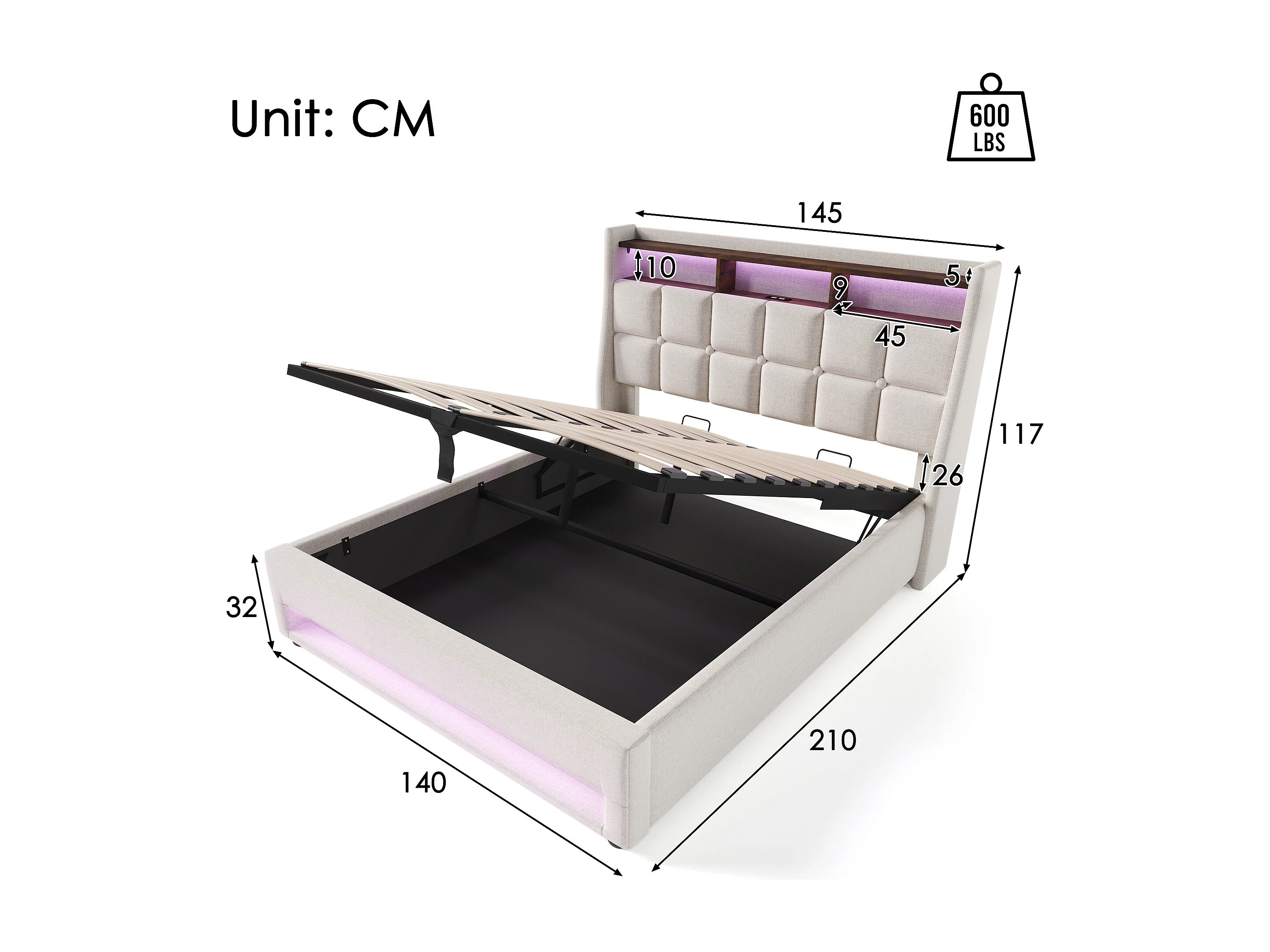 Lit coffre 140x200cm - avec tête de lit, LED, USB, étagères, sommier à lattes - en lin - beige - matelas inclus