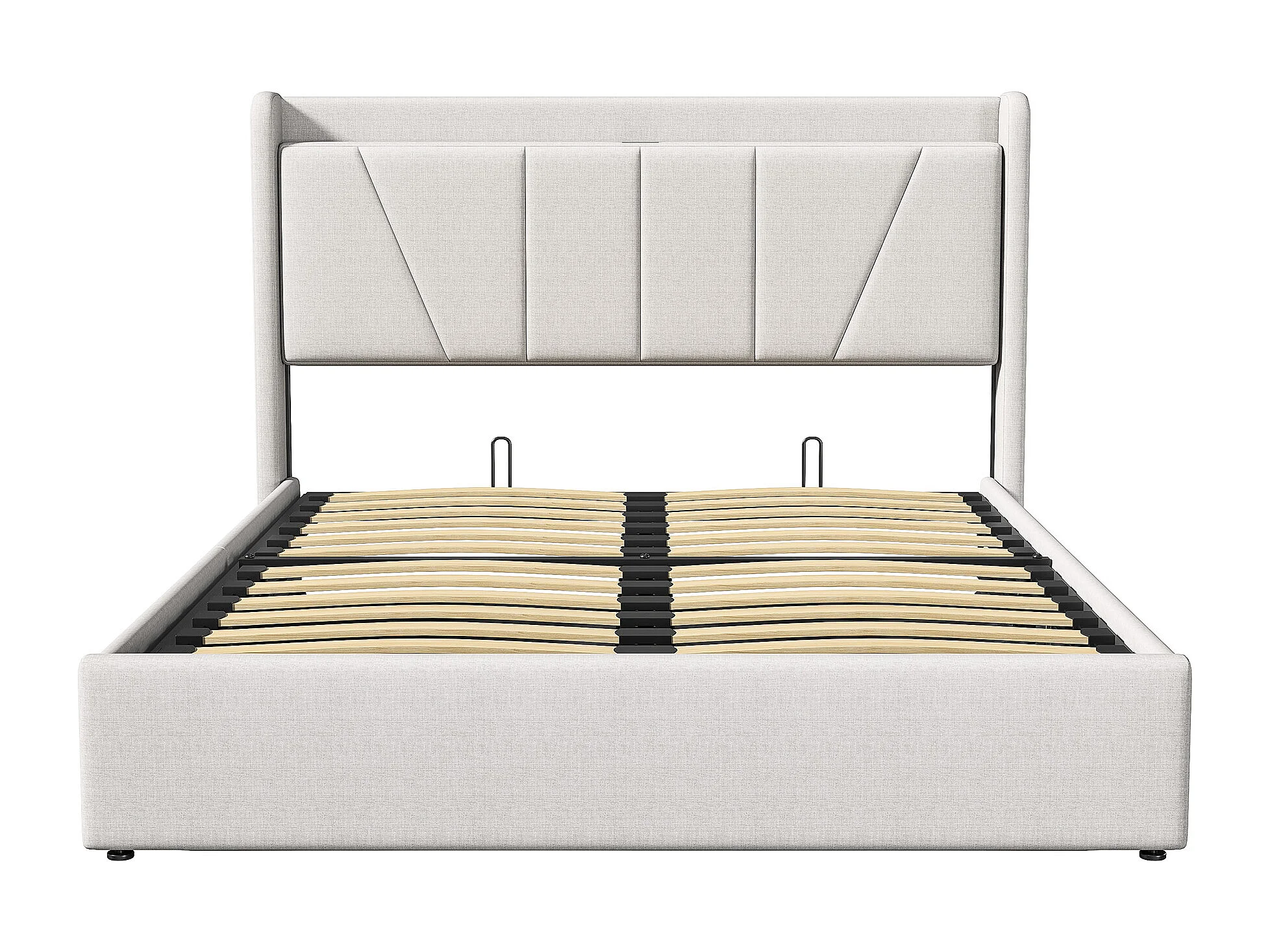 Lit coffre 140x200cm en tissu lin avec port USB - tête de lit et sommier à lattes - Beige