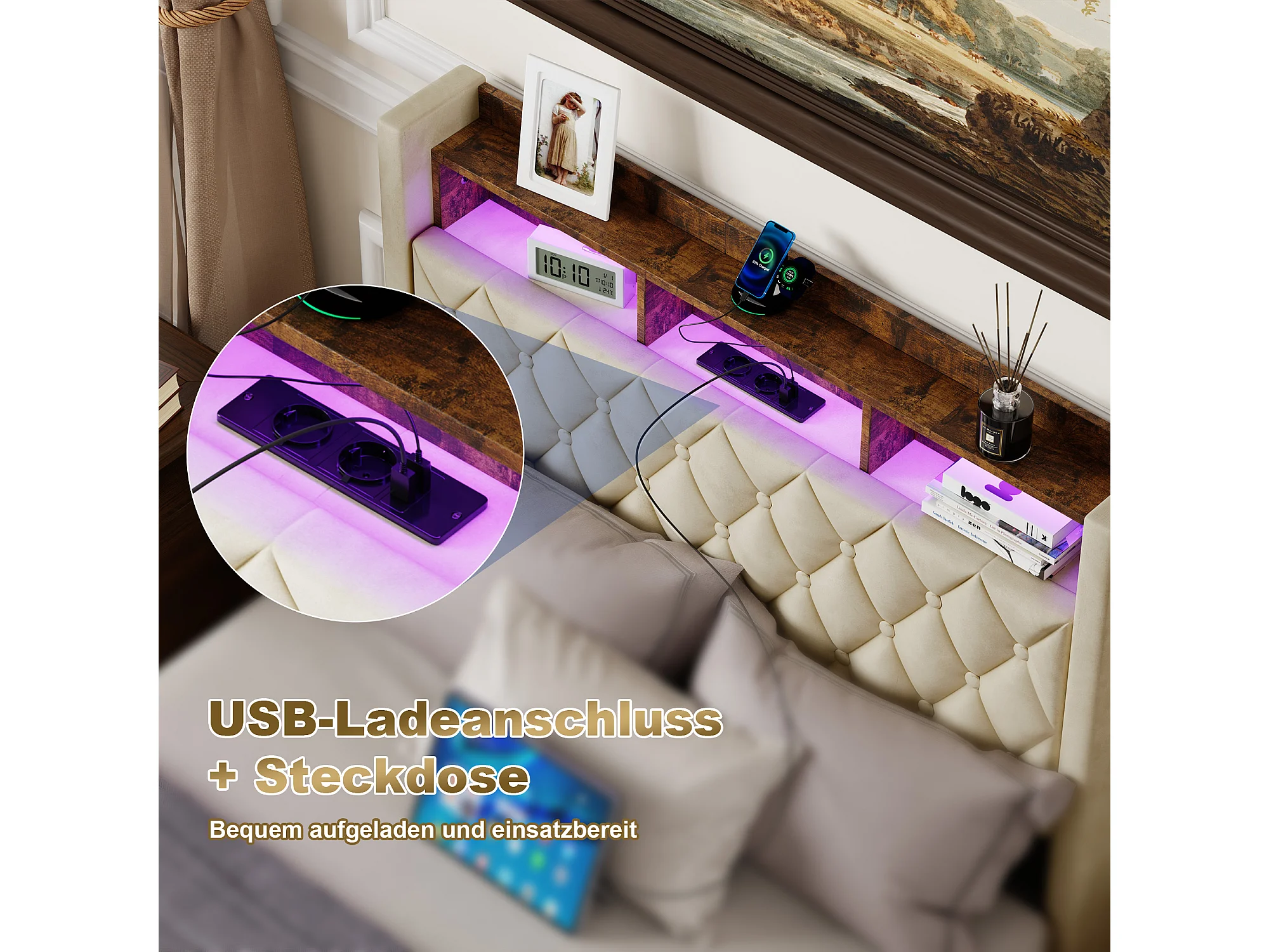 Lit coffre 140x200cm en velours hollandais - Lit adulte avec prise et LED - Beige