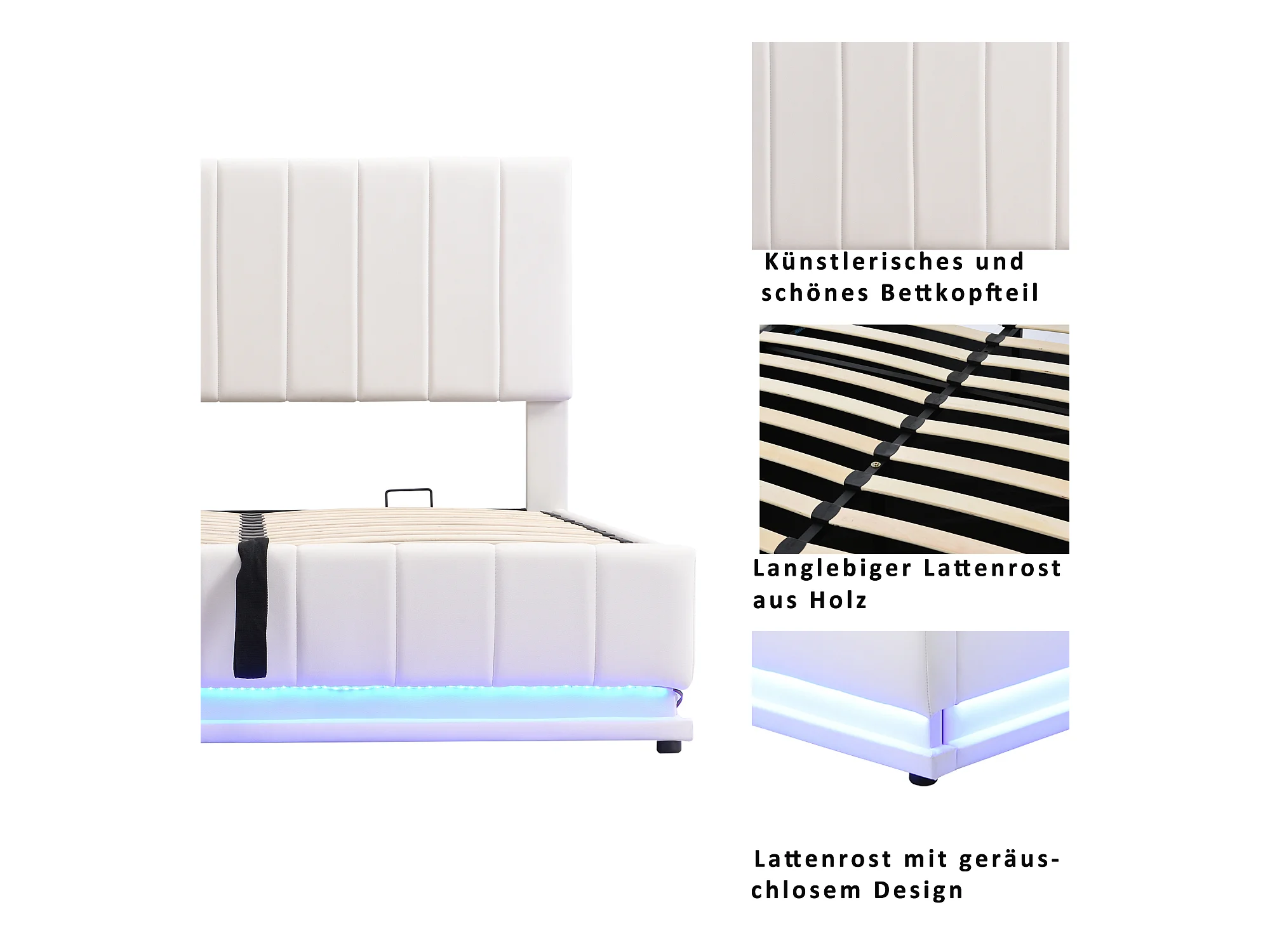 Lit coffre 140x200cm - lit capitonné LED avec sommier à lattes et tête de lit réglable en hauteur - similicuir blanc