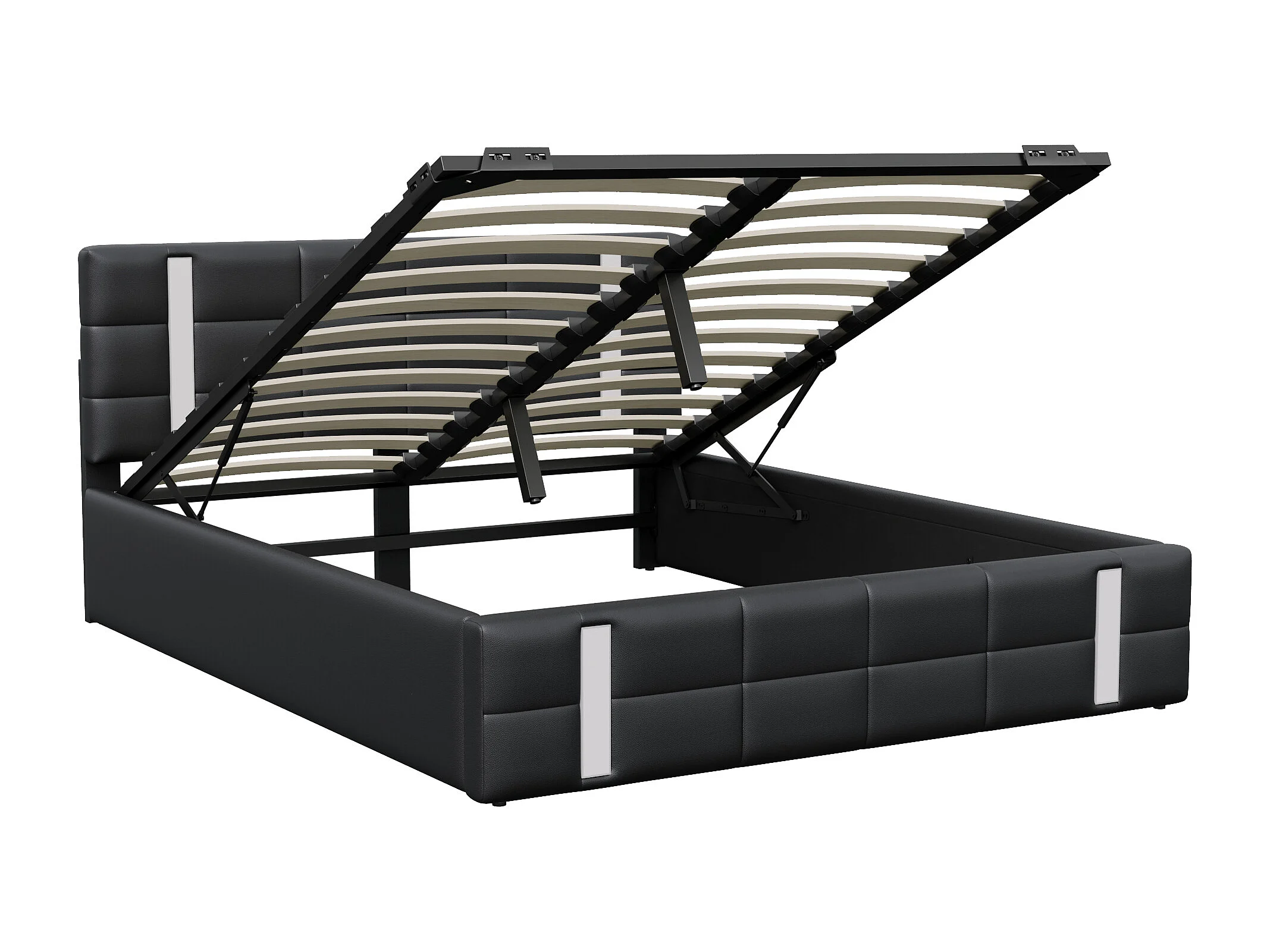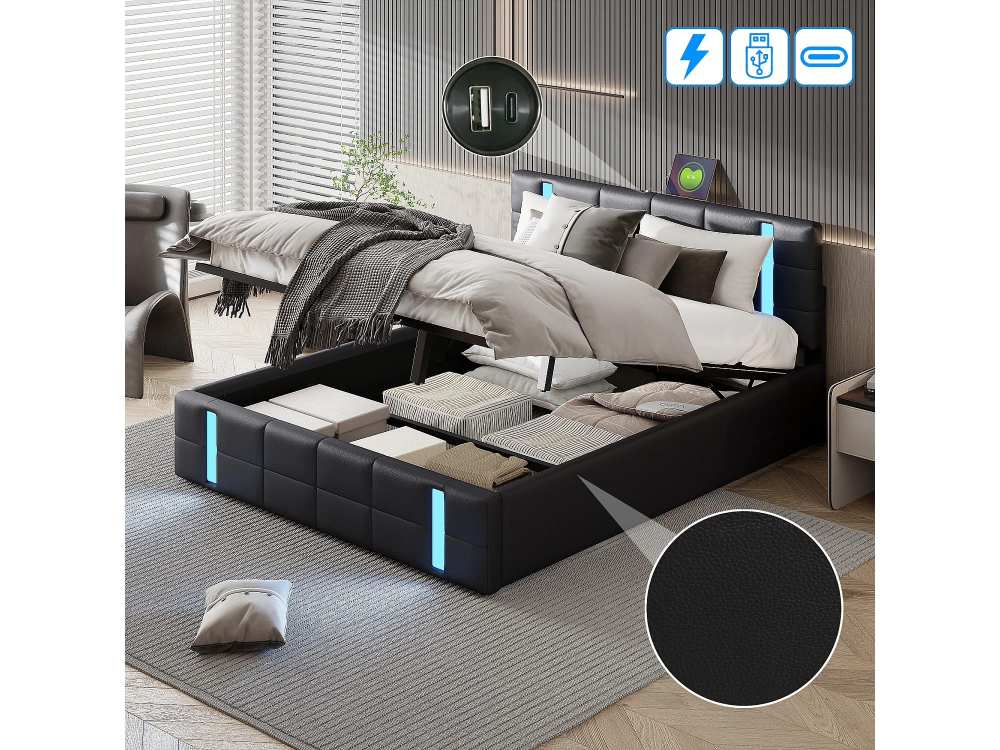 Lit coffre 160×200 cm avec LED, USB/Type-C et rangement hydraulique – Capitonné PU