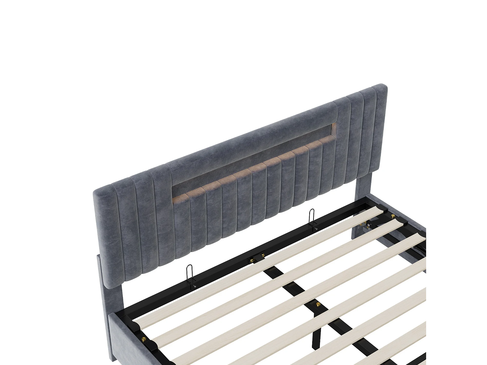 Lit coffre 160×200 cm double avec tête de lit LED et rangement – Tissu velours gris