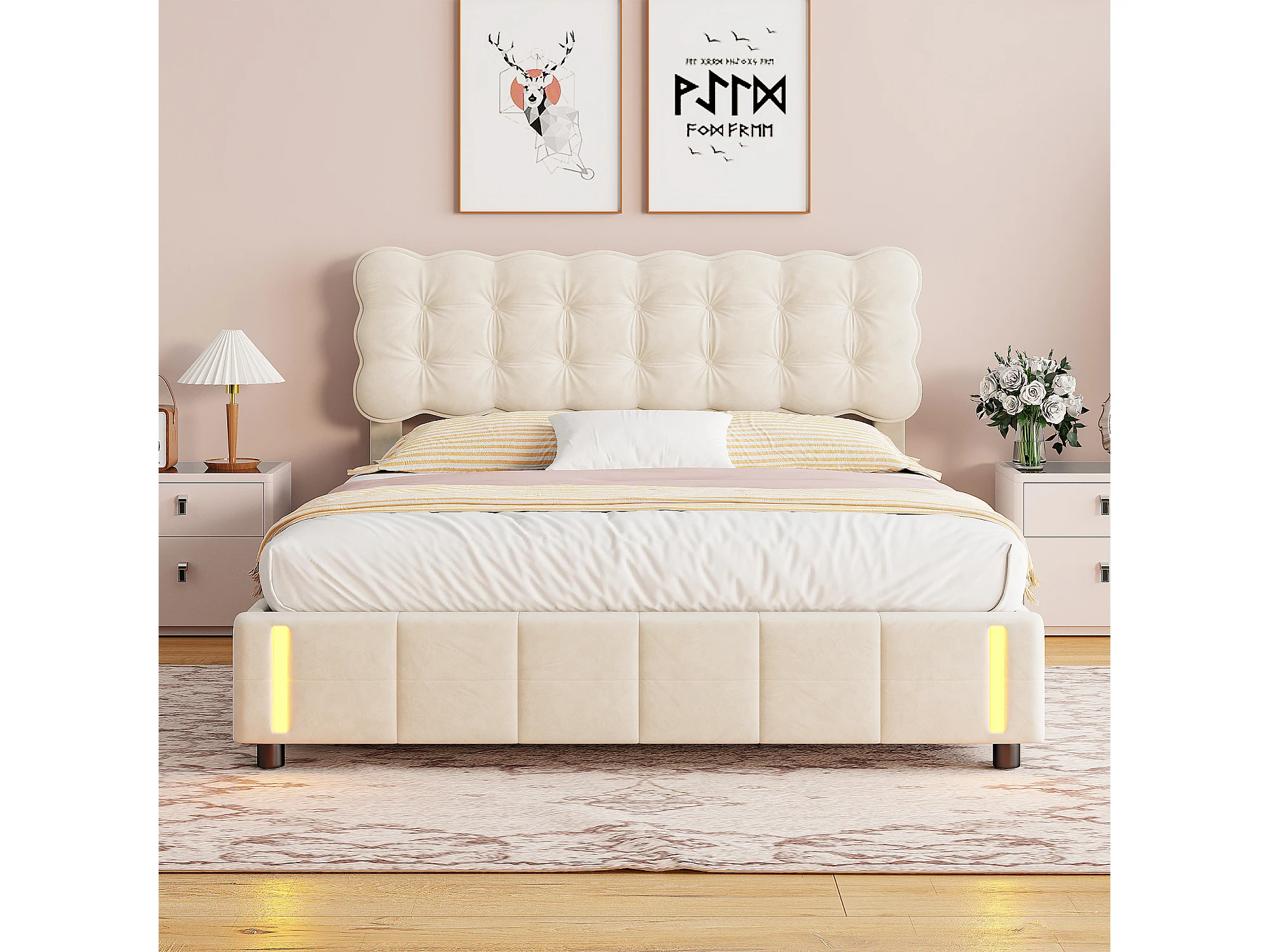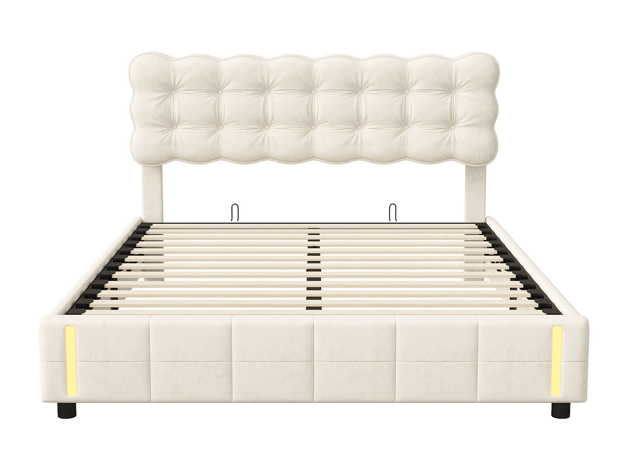 Lit coffre 160×200 cm en velours beige avec LED et rangement – Sommier à lattes