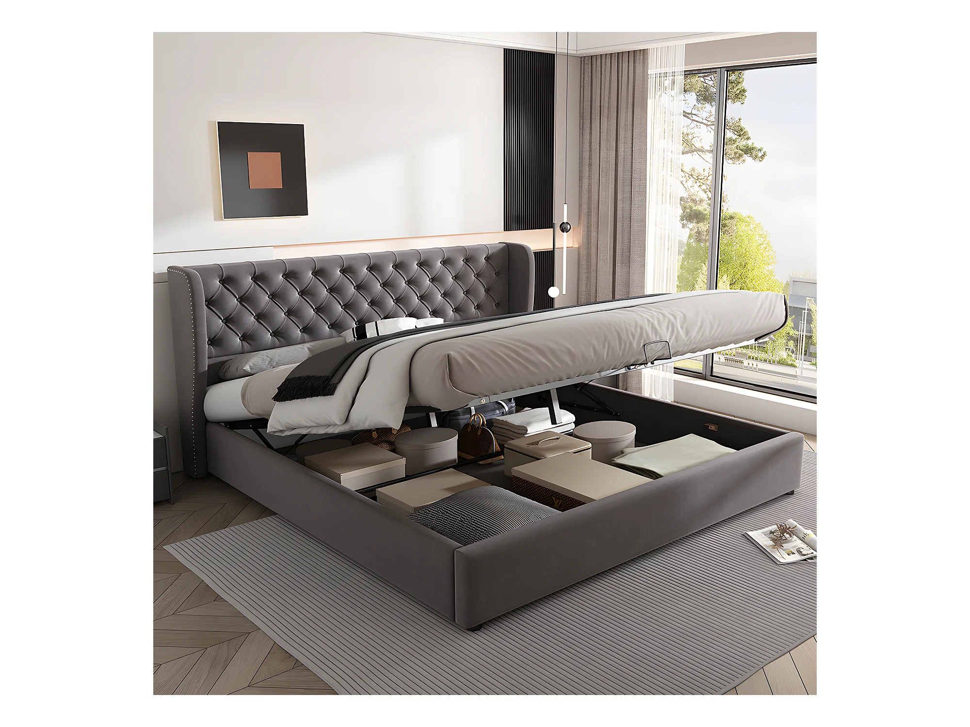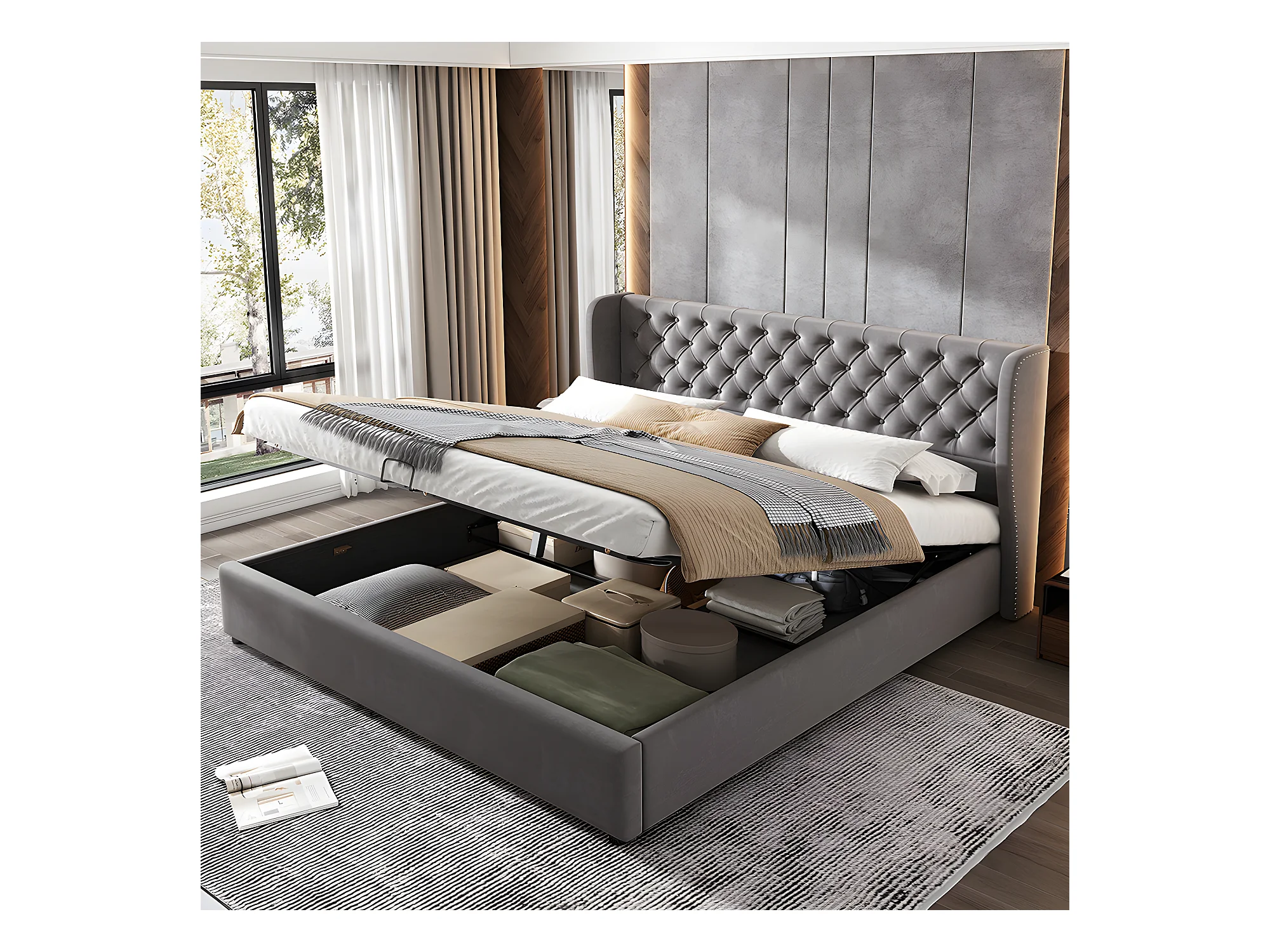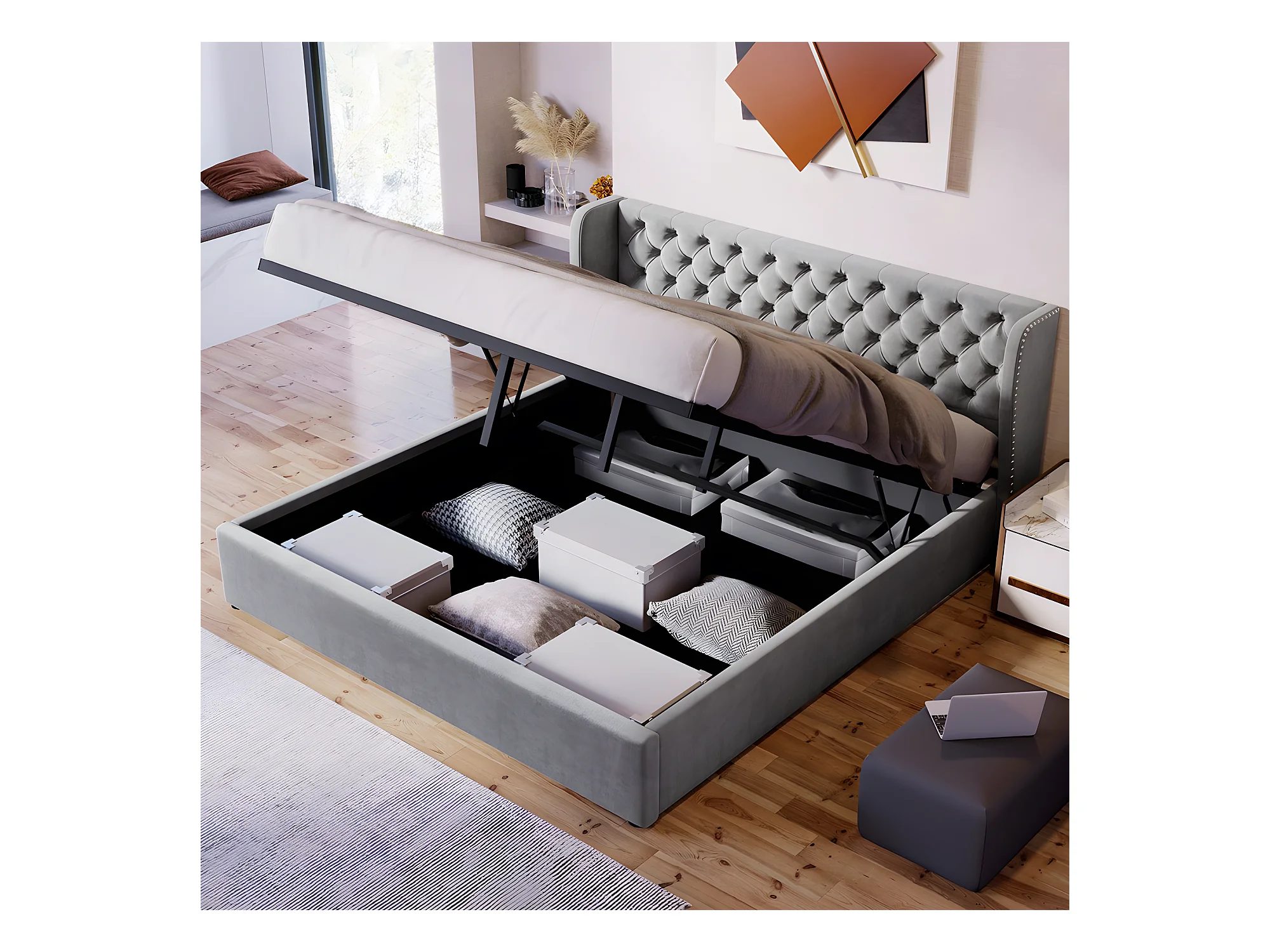 Lit coffre - 160 x 200 cm - avec sommier à lattes relevable - Gris - Sweiko