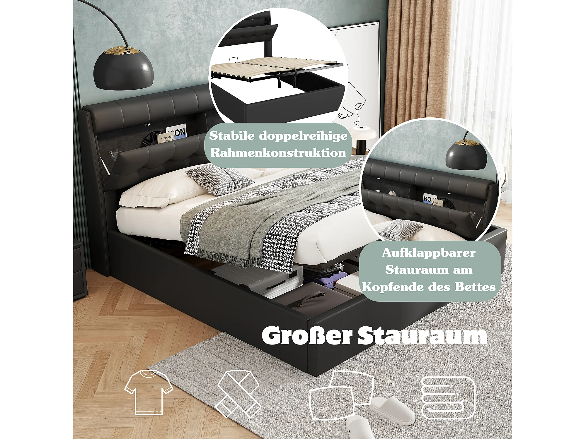 Lit coffre 160 x 200 cm avec tête de lit rangement - LEDs - Cuir PU - Noir (sans matelas)
