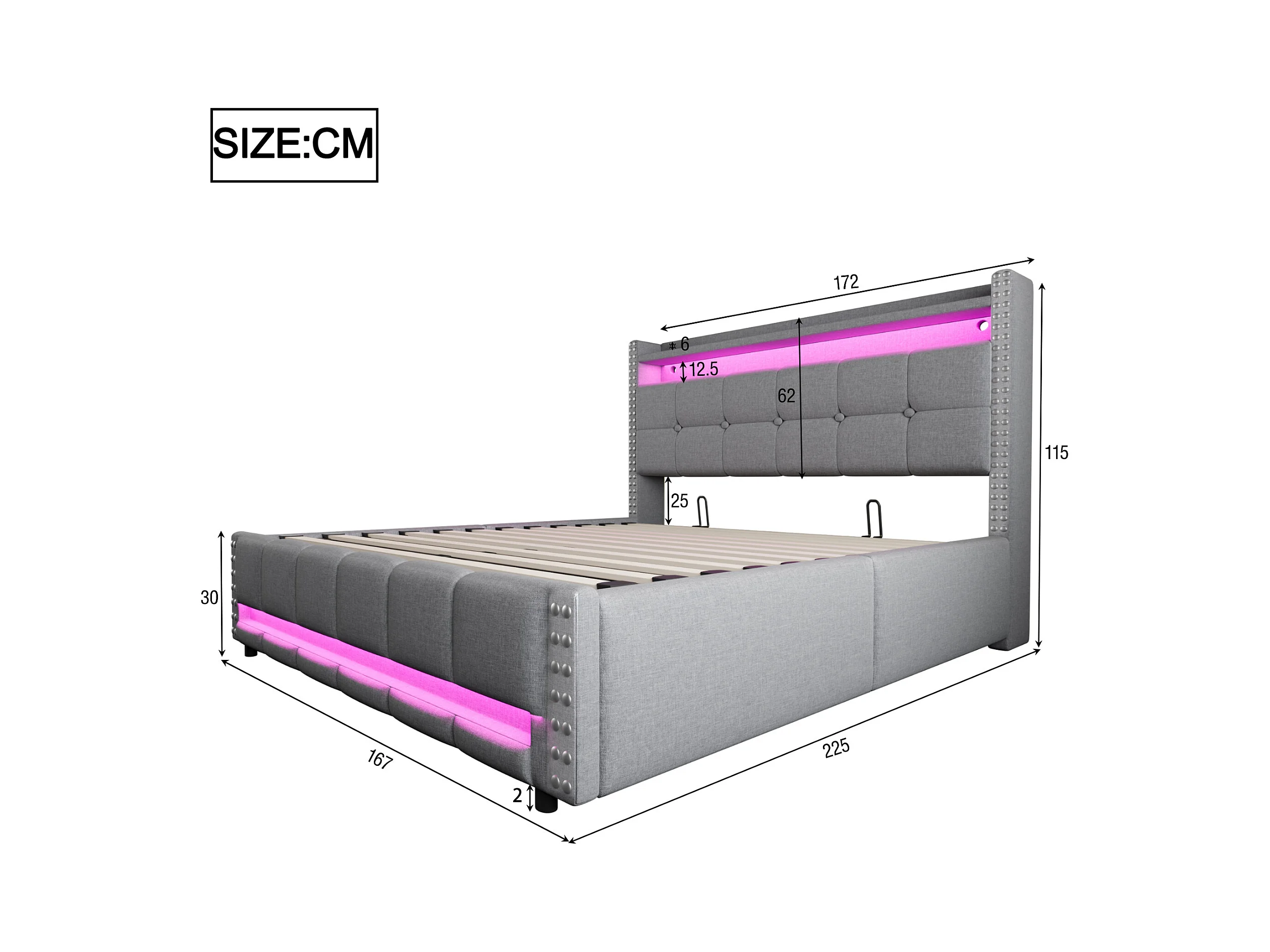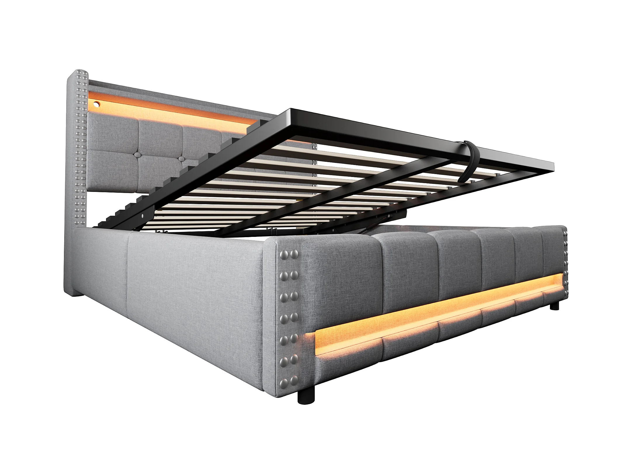 Lit coffre 160 x 200 cm - Lin gris clair - Lit double avec éclairage LED et prise USB - sans matelas