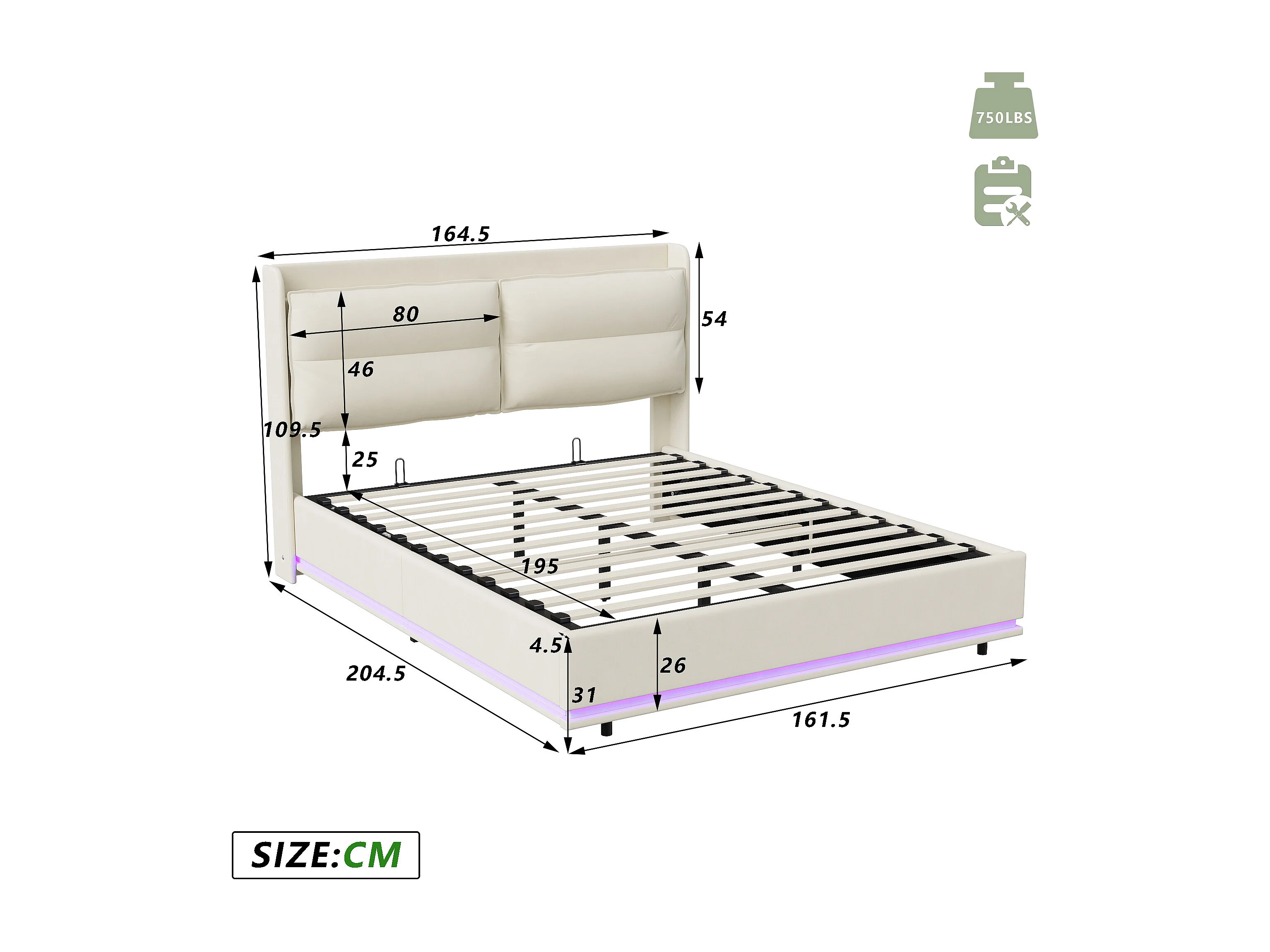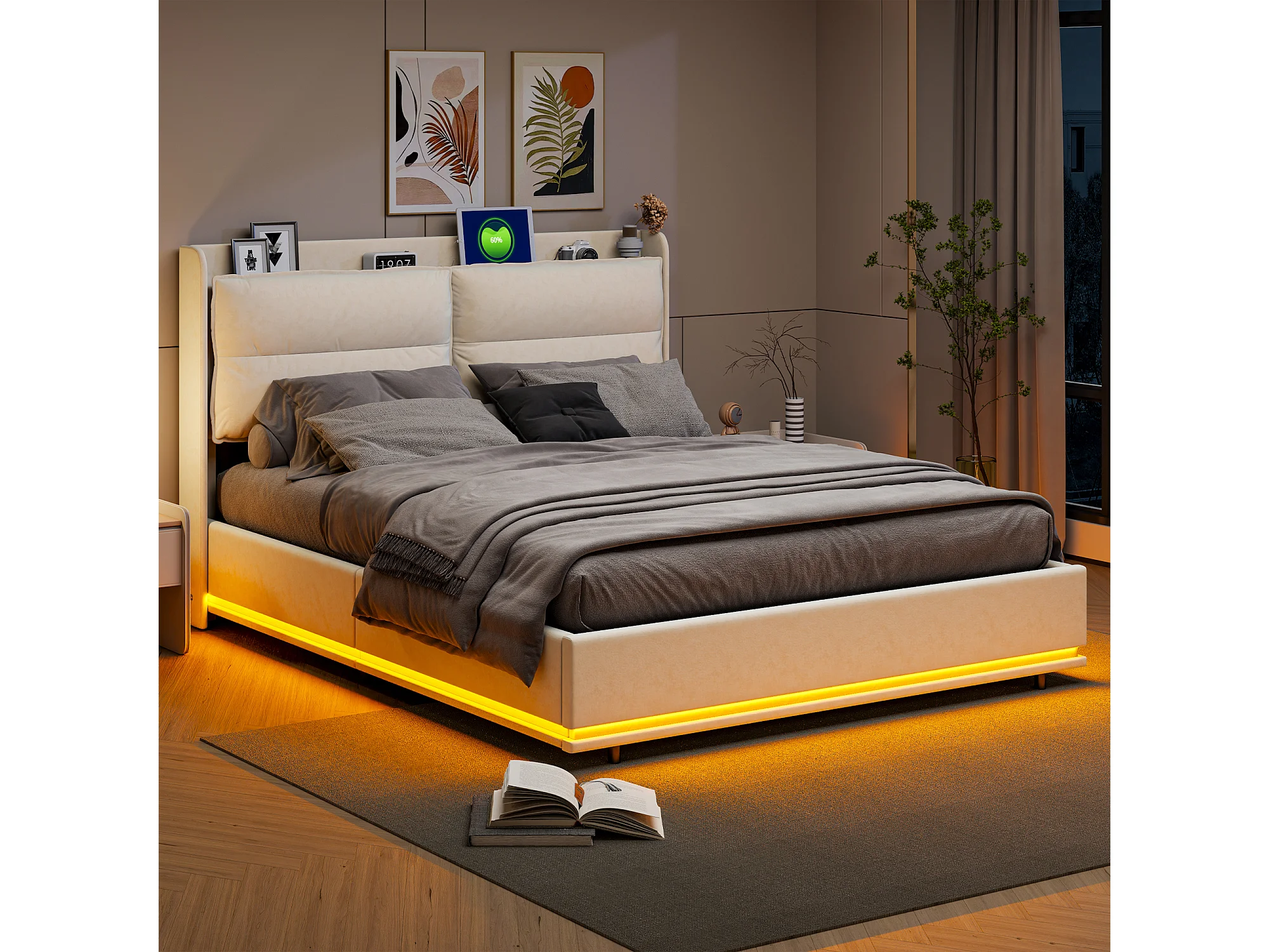Lit coffre - 160 x 200 cm - pistons hydrauliques - éclairage LED RGB - tête de lit avec prise USB et charge sans fil - velours - blanc cassé