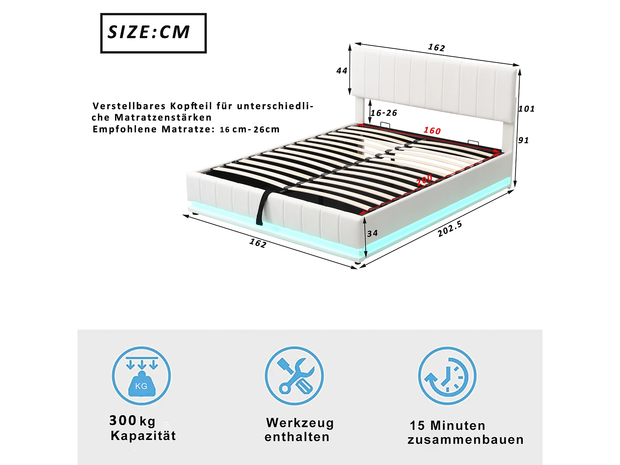 Lit coffre 160 x 200 cm, tissu en fond, LED, tête de lit réglable, rangement, PU blanc, sans matelas