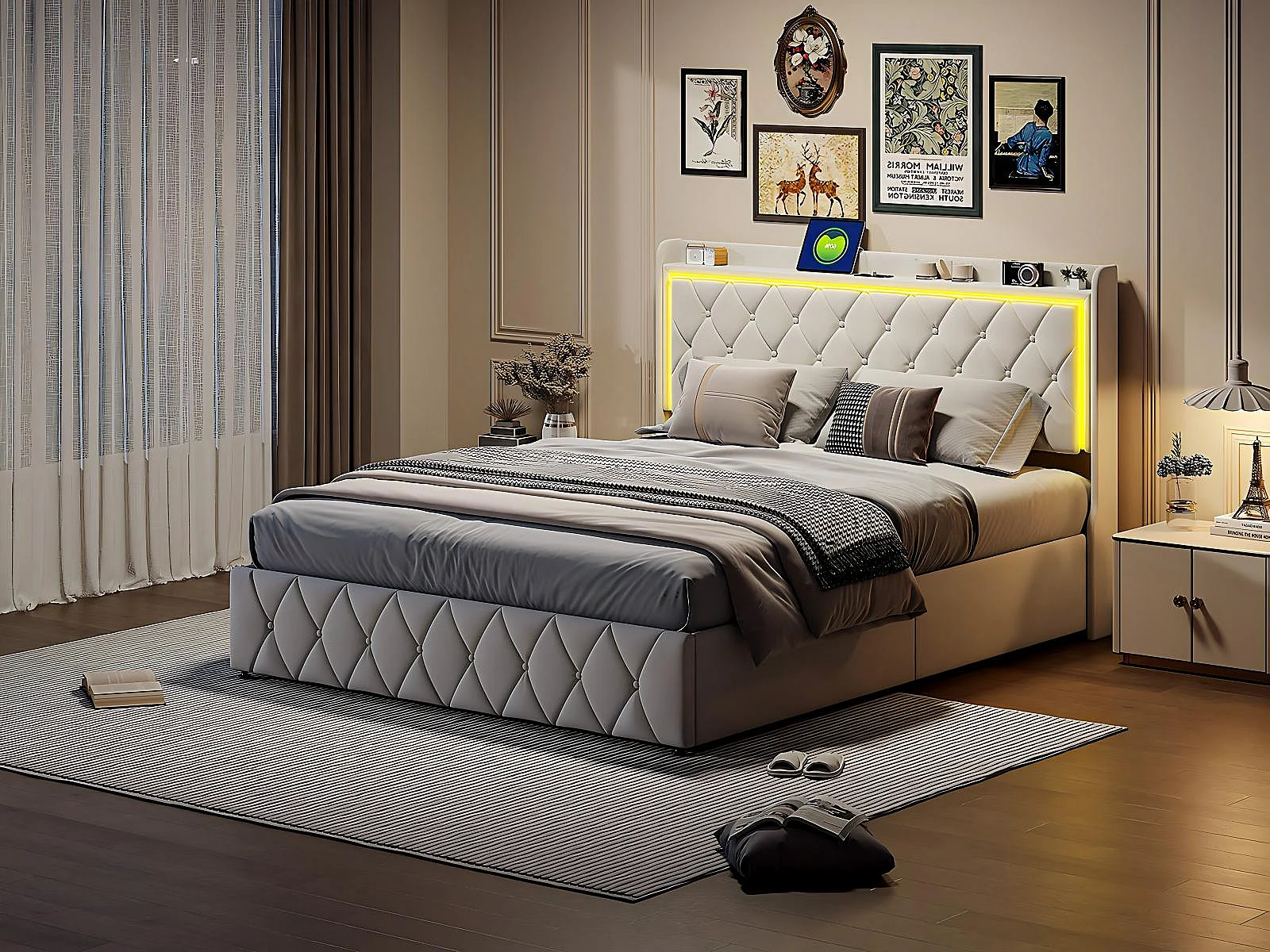 Lit coffre 160x200 avec LED et USB, lit double avec tête de lit rangement, lit en velours avec sommier