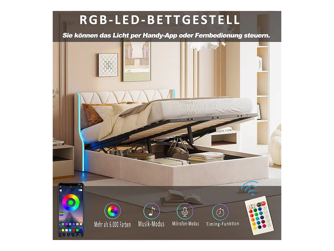 Lit Coffre 160x200 Avec Rangement Et LED, Lit Capitonné Avec Sommier à Lattes, Lit Double, Beige