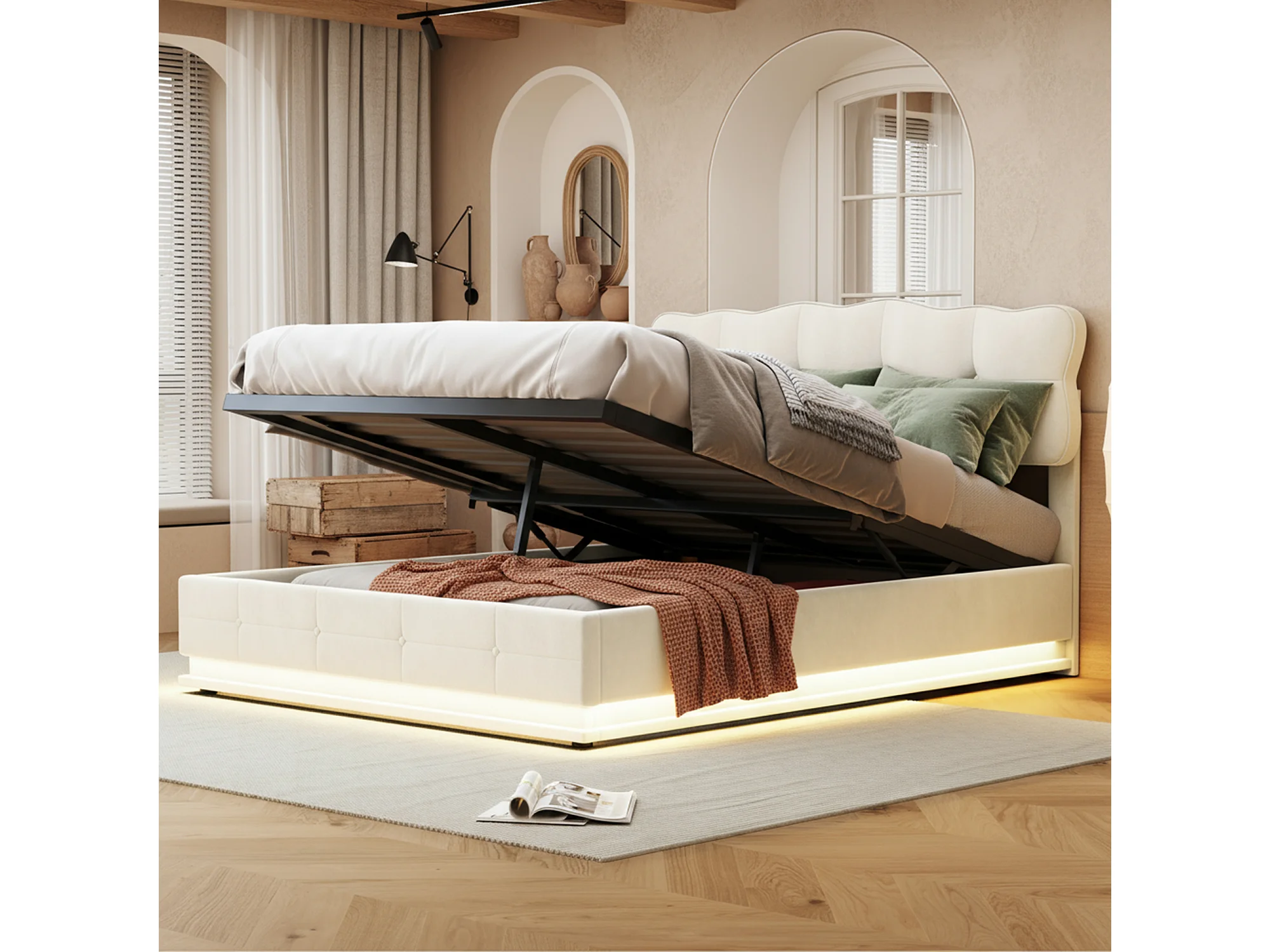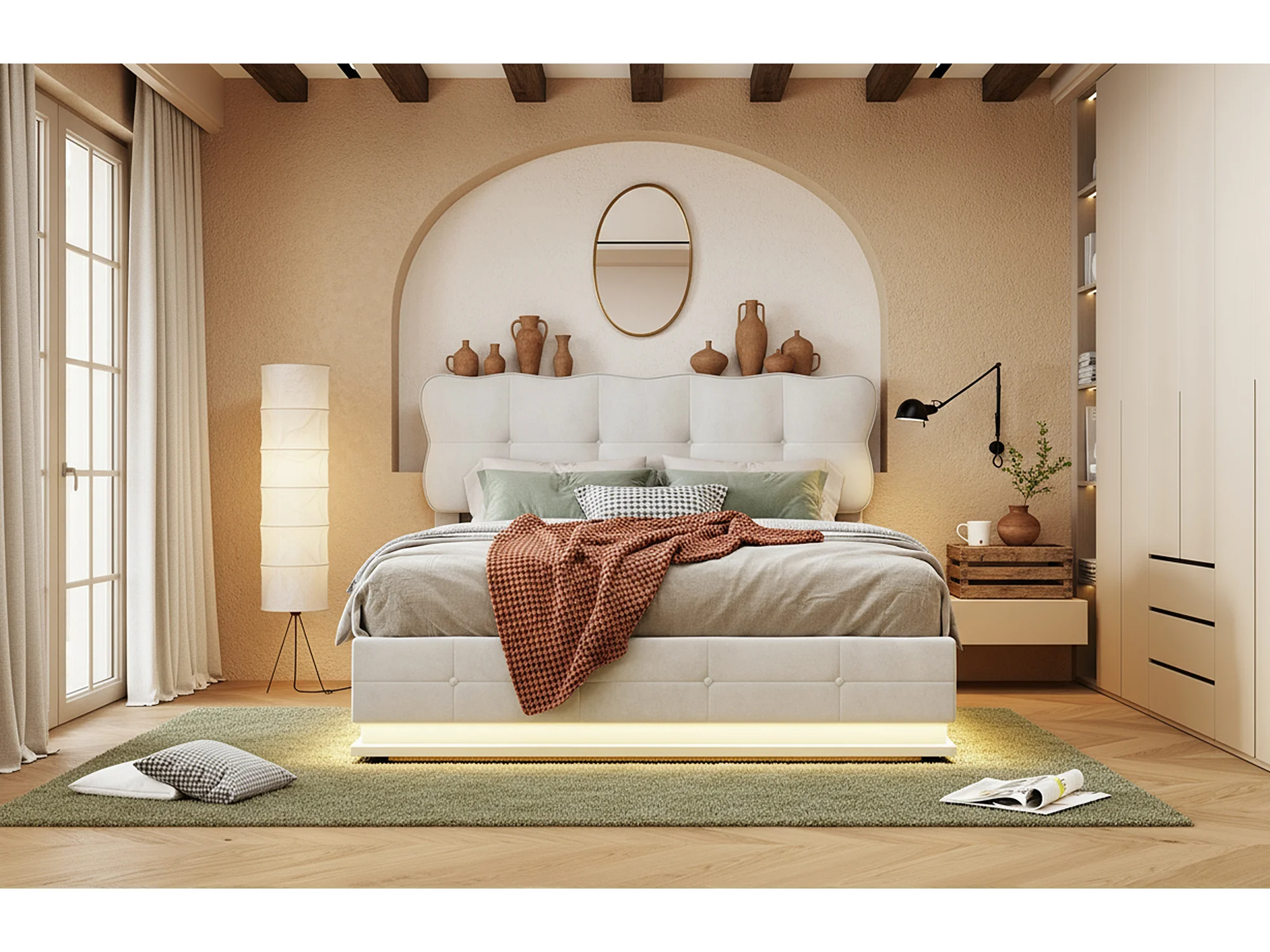 Lit coffre 160x200 avec sommier à lattes - lit double 160x200 avec LED - cadre de lit 160x200 cm - tissu en velours - crème