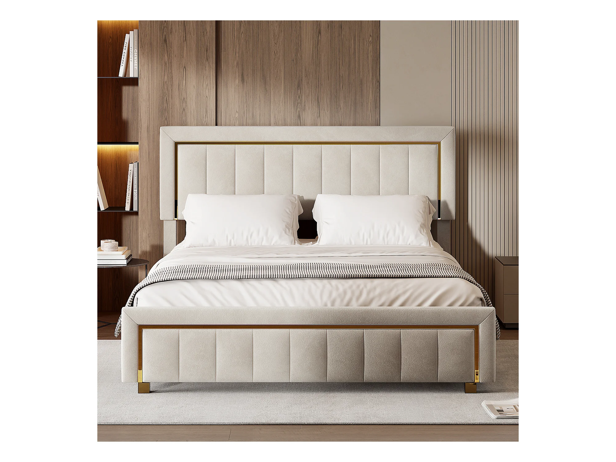 Lit Coffre 160x200 Avec Tête De Lit, Lit Capitonné Avec Sommier à Lattes, Lit Double, Beige