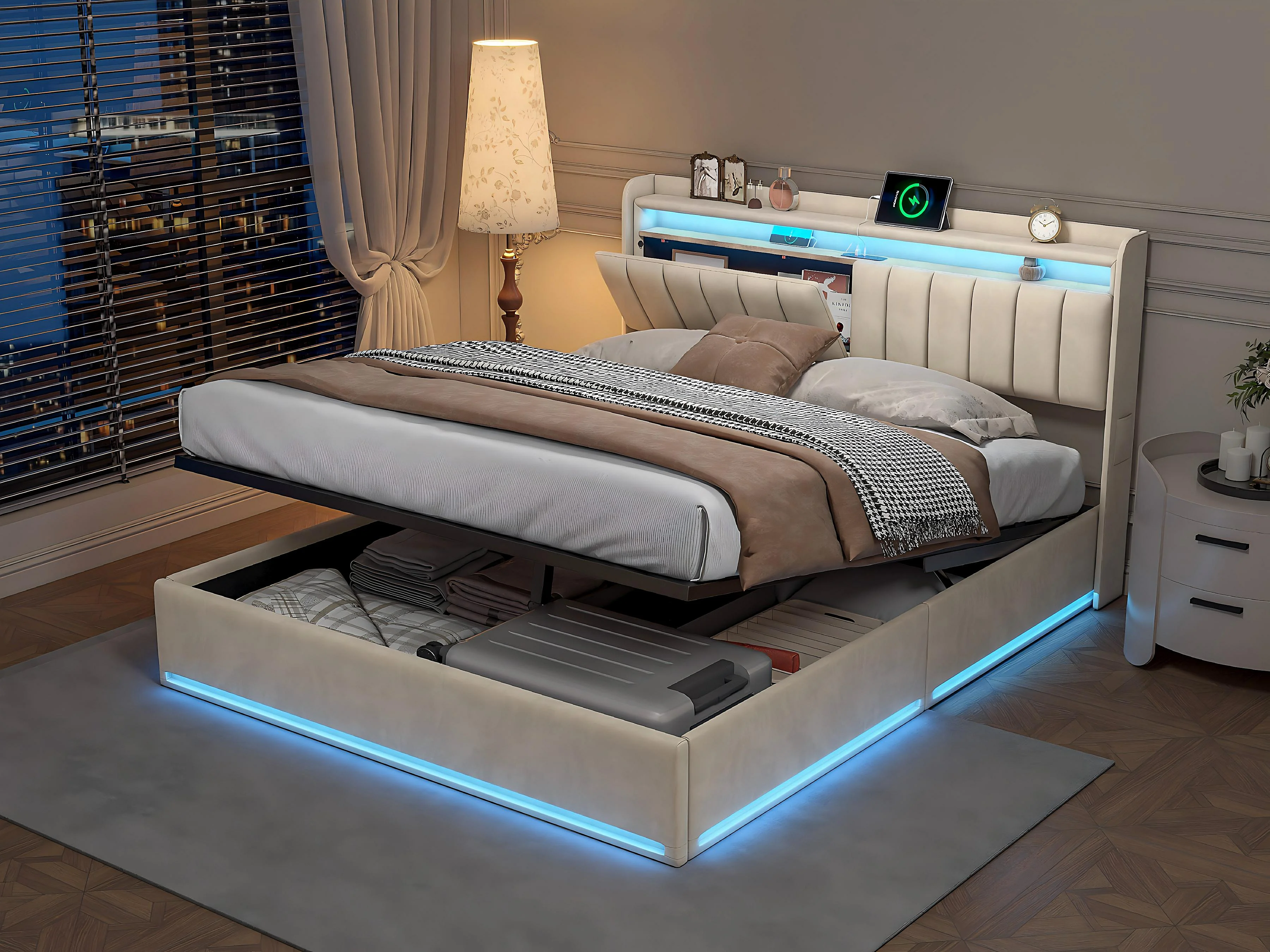 Lit coffre 160x200 avec tiroirs et LED RGB, lit avec USB Type-C, tête de lit rangement, velours