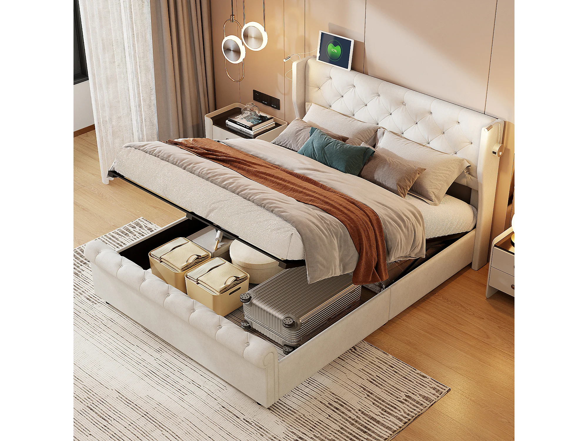 Lit coffre 160x200 cm - avec lampe de chevet et port USB - avec rangement hydraulique - velours - beige