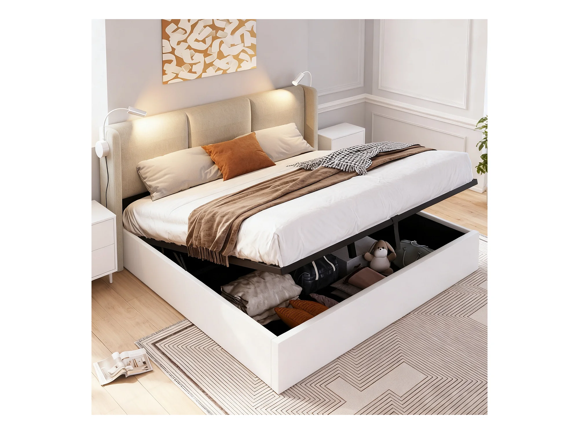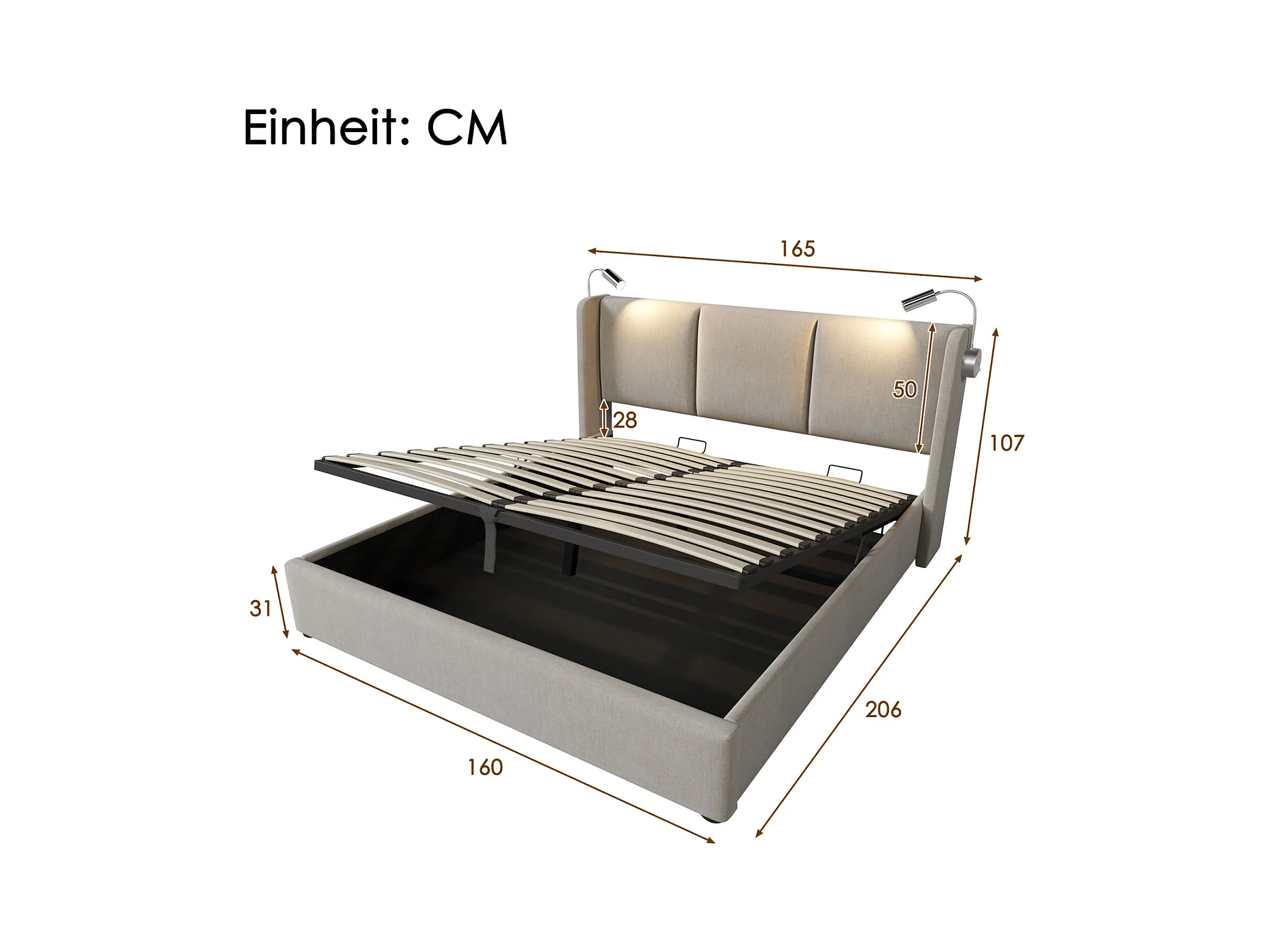 Lit coffre 160x200 cm avec LED et USB - lit adulte 160x200 cm capitonné soldes - cadre de lit double 160x200 cm avec sommier à lattes - tissu en lin - beige