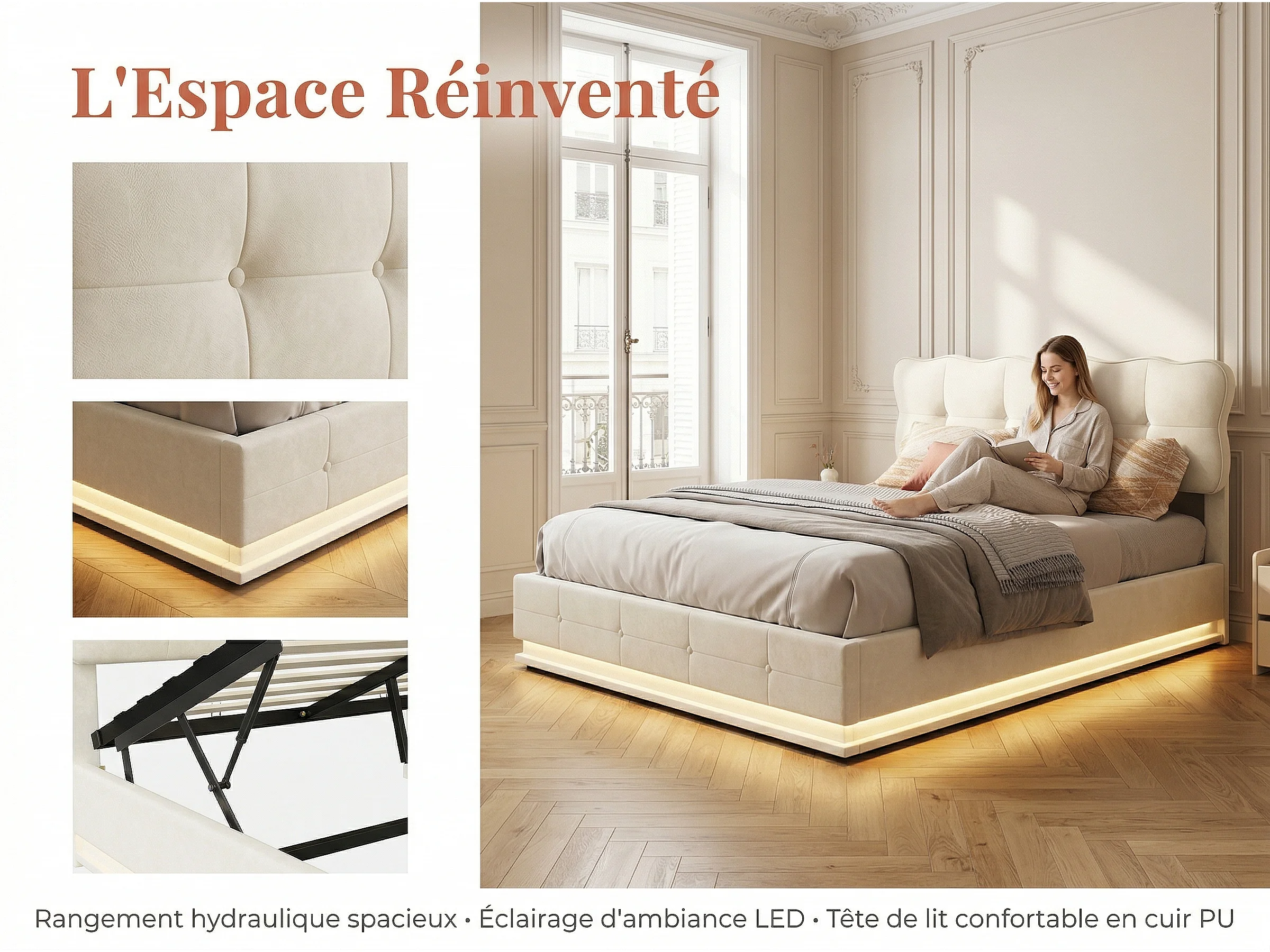 Lit coffre 160x200 cm avec LED RGB, lit capitonné velours beige, sommier relevable, grand rangement, design moderne