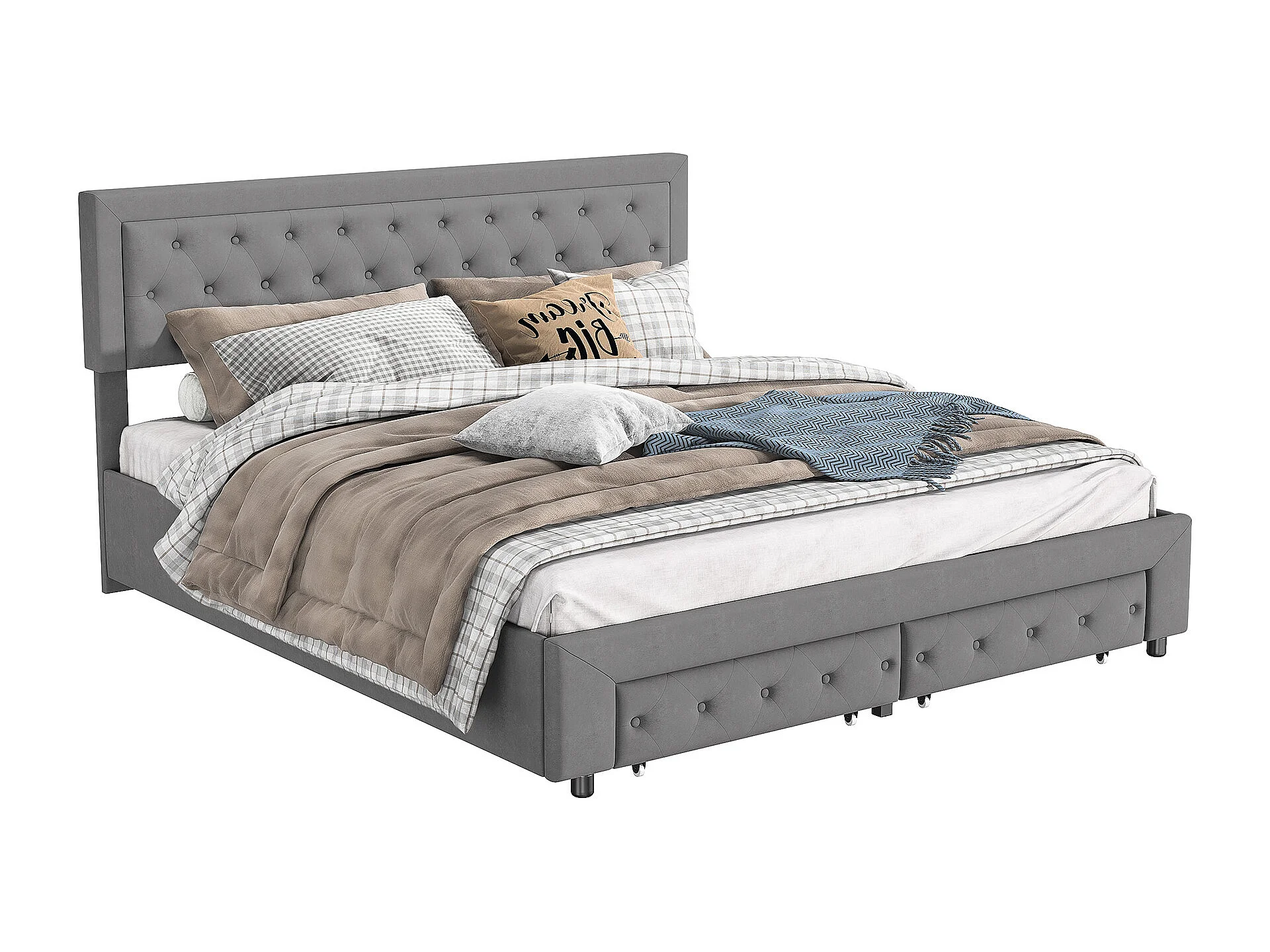 Lit coffre 160x200 cm avec rangement – 2 tiroirs – Velours Gris – Sommier à lattes en bois massif – Style scandinave – Lit double adulte