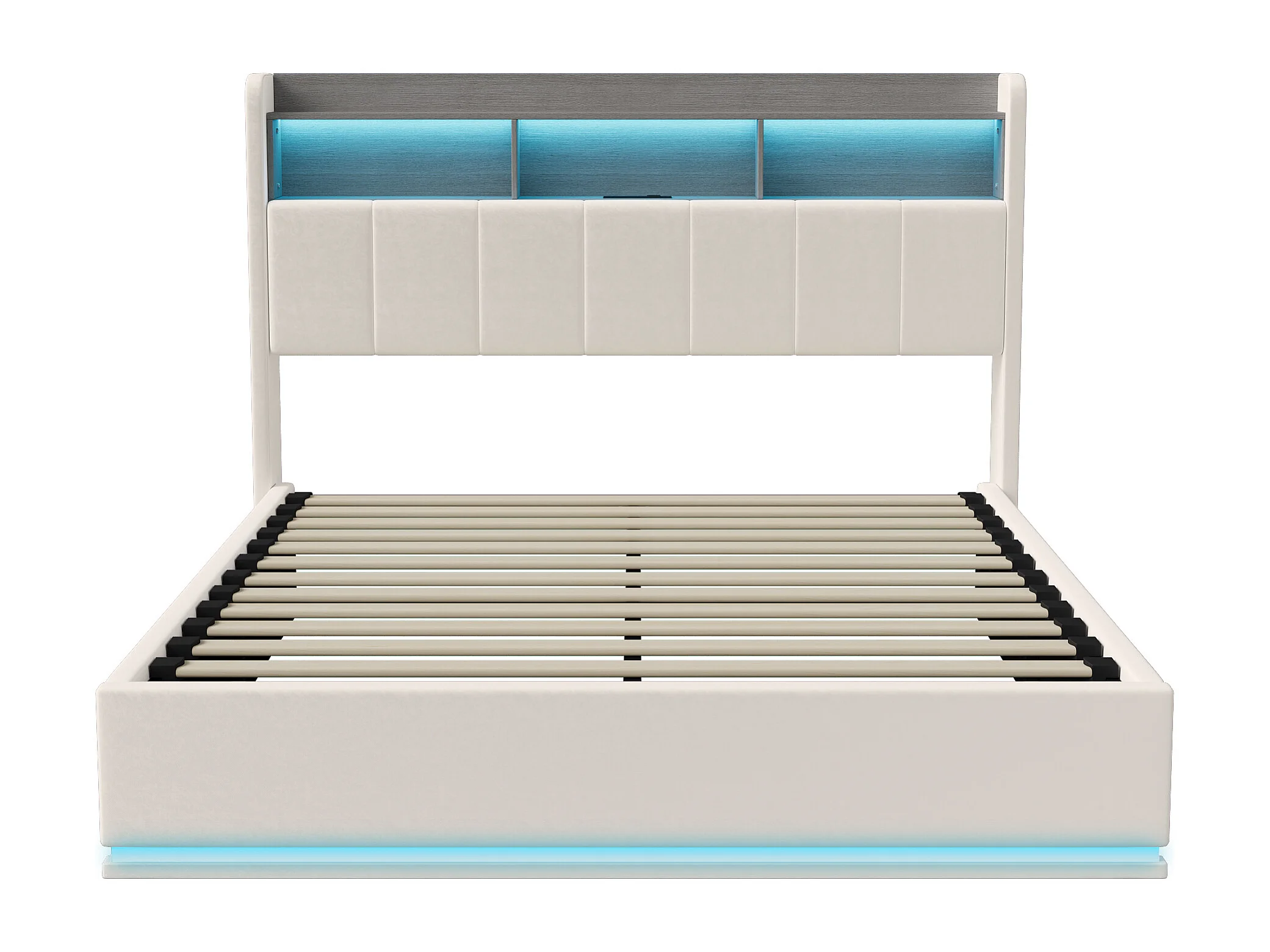 Lit coffre 160x200 cm avec sommier à latte, lit adulte 160x200 cm avec LED et USB, lit capitonné en tissu velours 160x200 cm, lit double 160x200 cm soldes - blanc