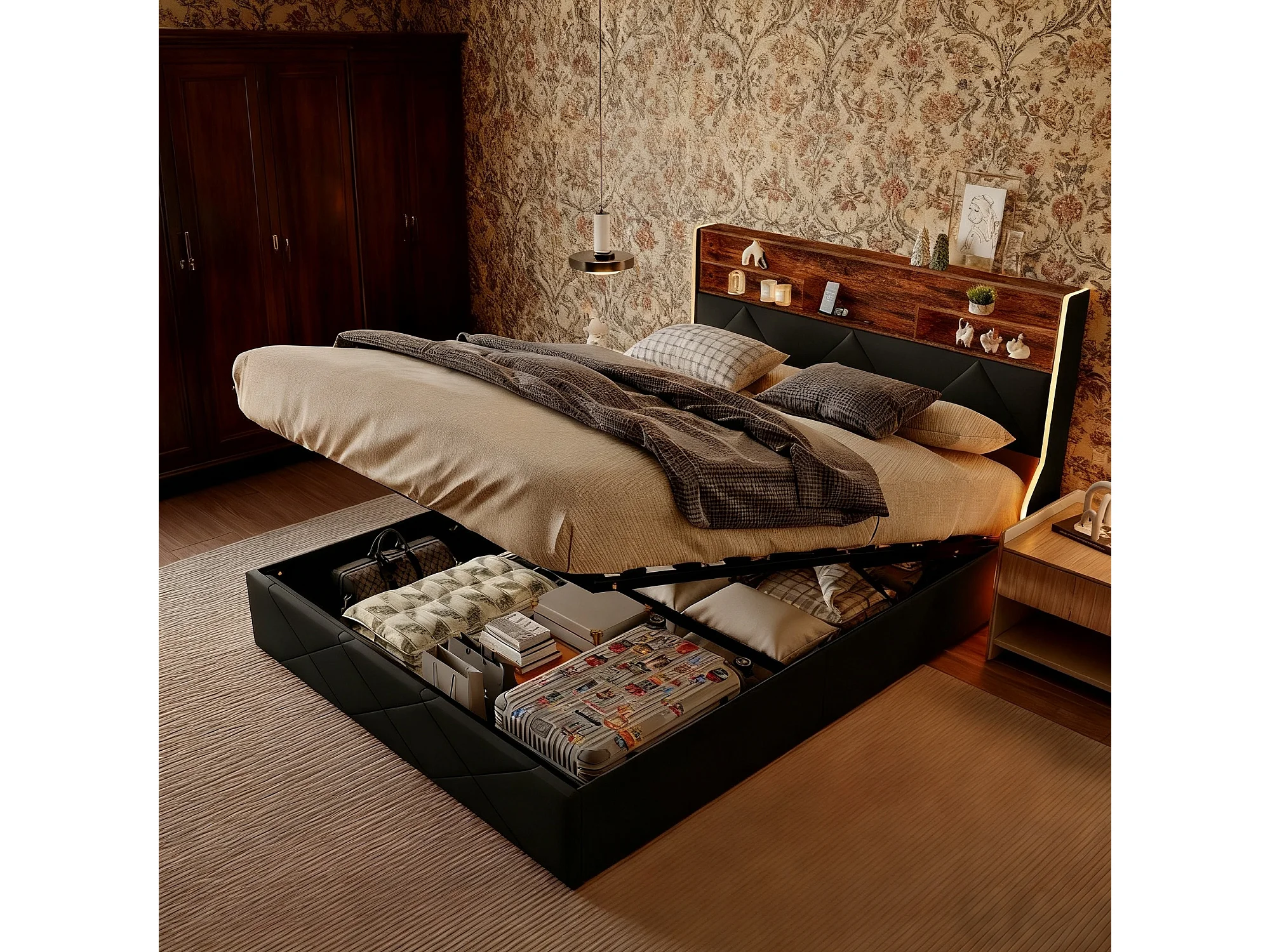 Lit coffre 160x200 cm avec sommier à latte - lit adulte 160x200 cm avec USB et LED - lit double 140x200 cm capitonné en tissu PU - style rétro chic - Noir