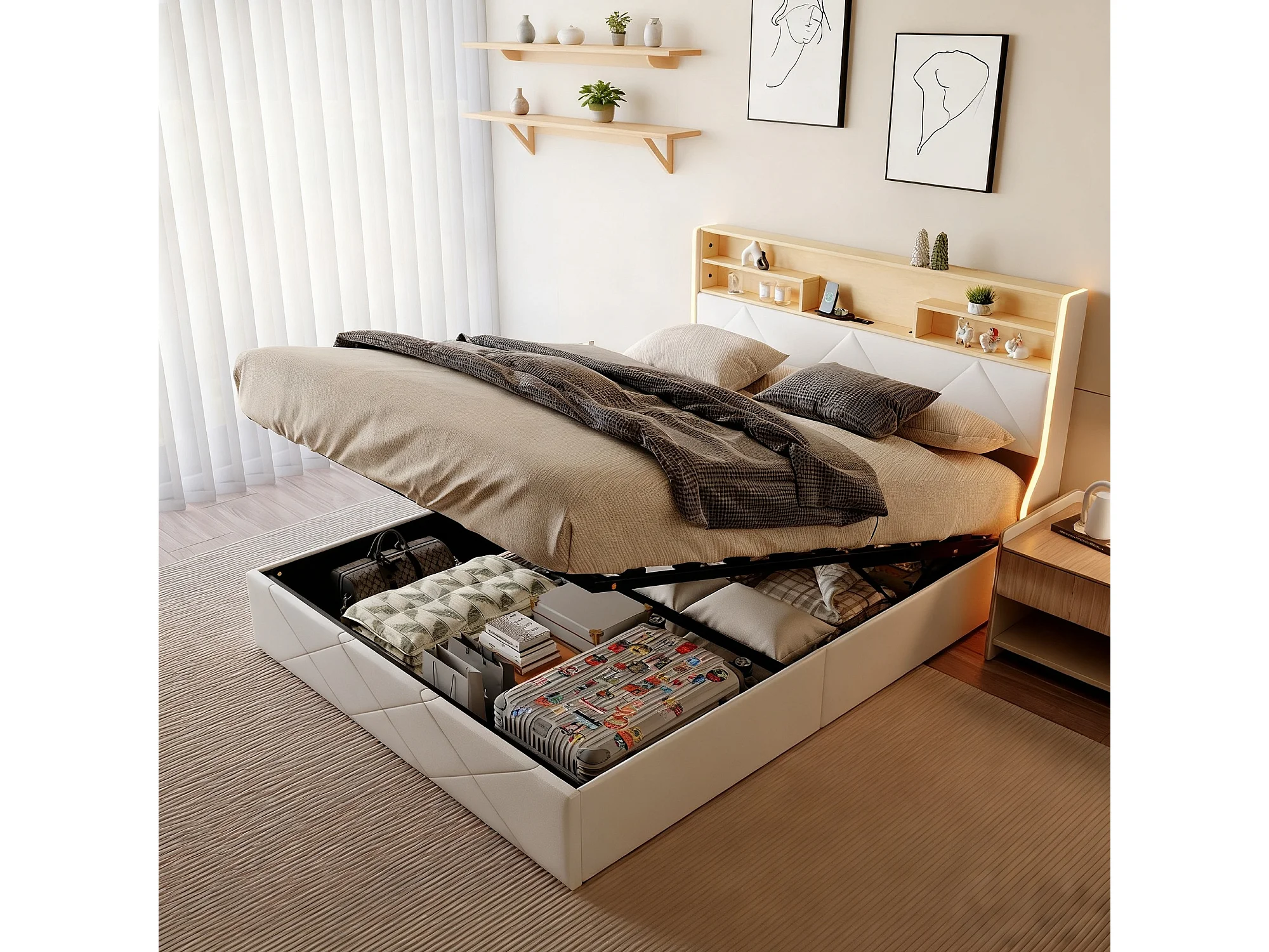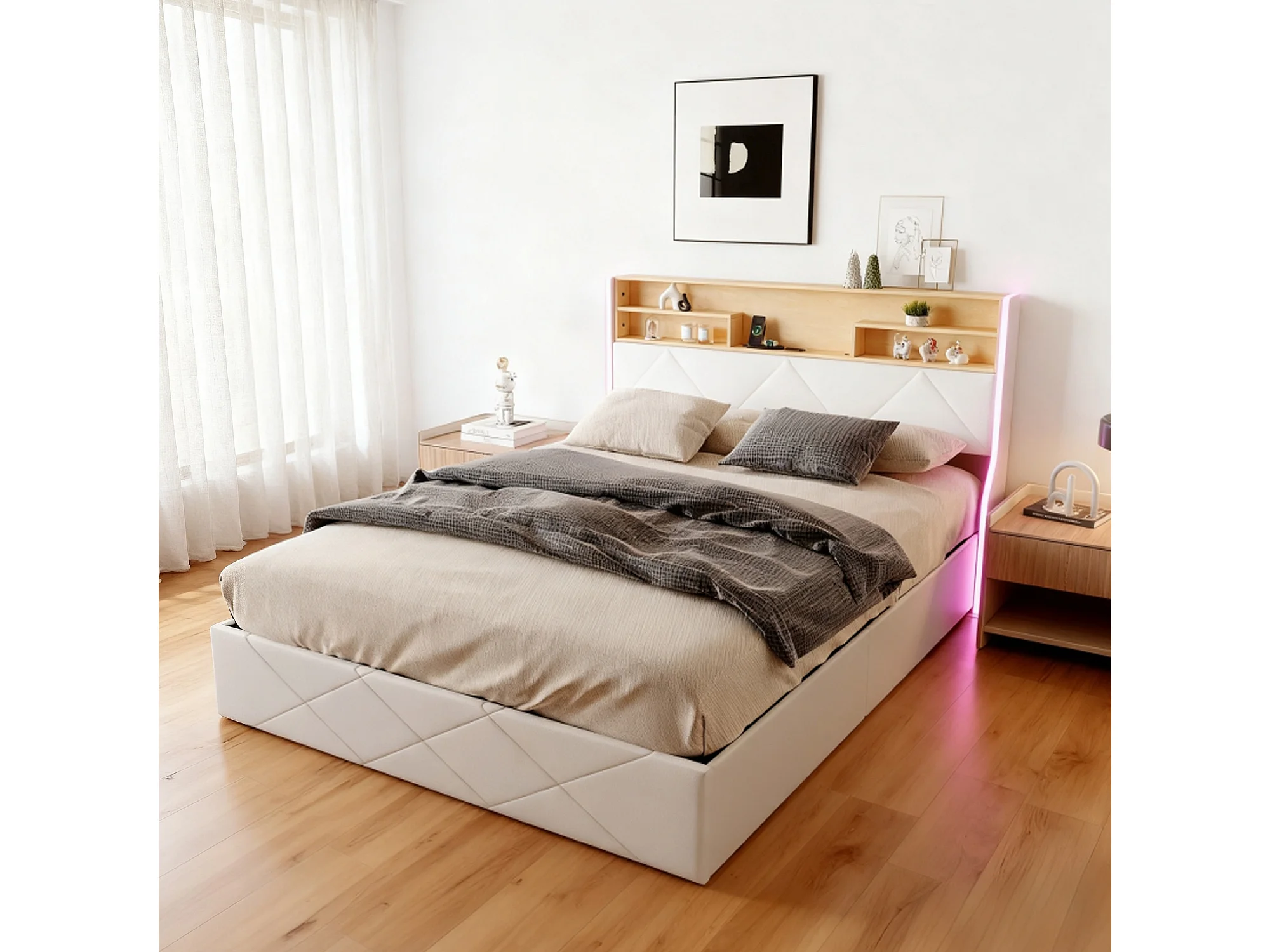 Lit coffre 160x200 cm avec sommier à latte - lit adulte 160x200cm avec USB et LED - lit double 160x200 capitonné en tissu PU - moderne nouvelle collection - blanc