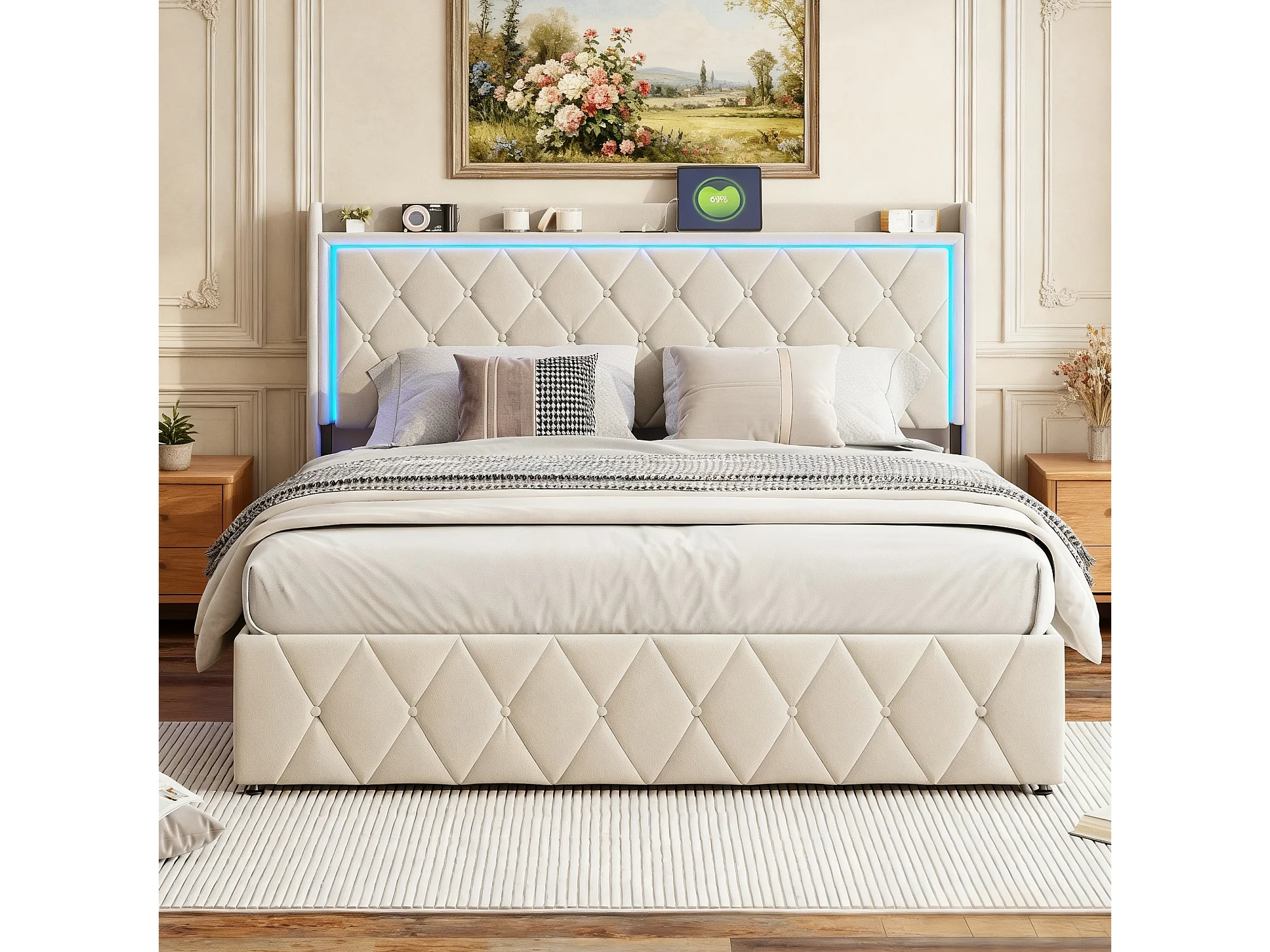 Lit coffre 160x200 cm avec sommier à lattes - lit double 160x200 rangement soldes - cadre de lit 160x200 cm avec LED et USB - tissu en velours - beige