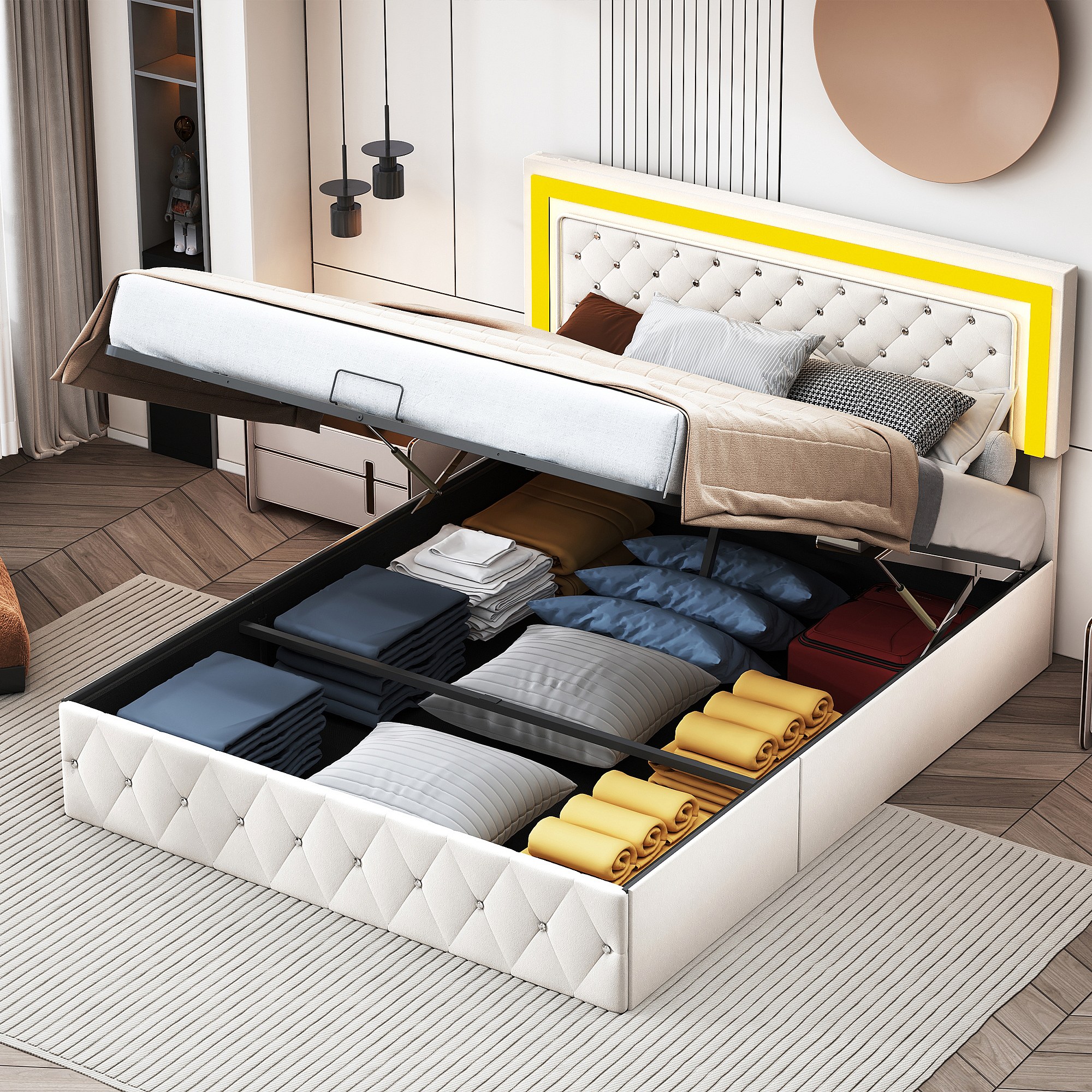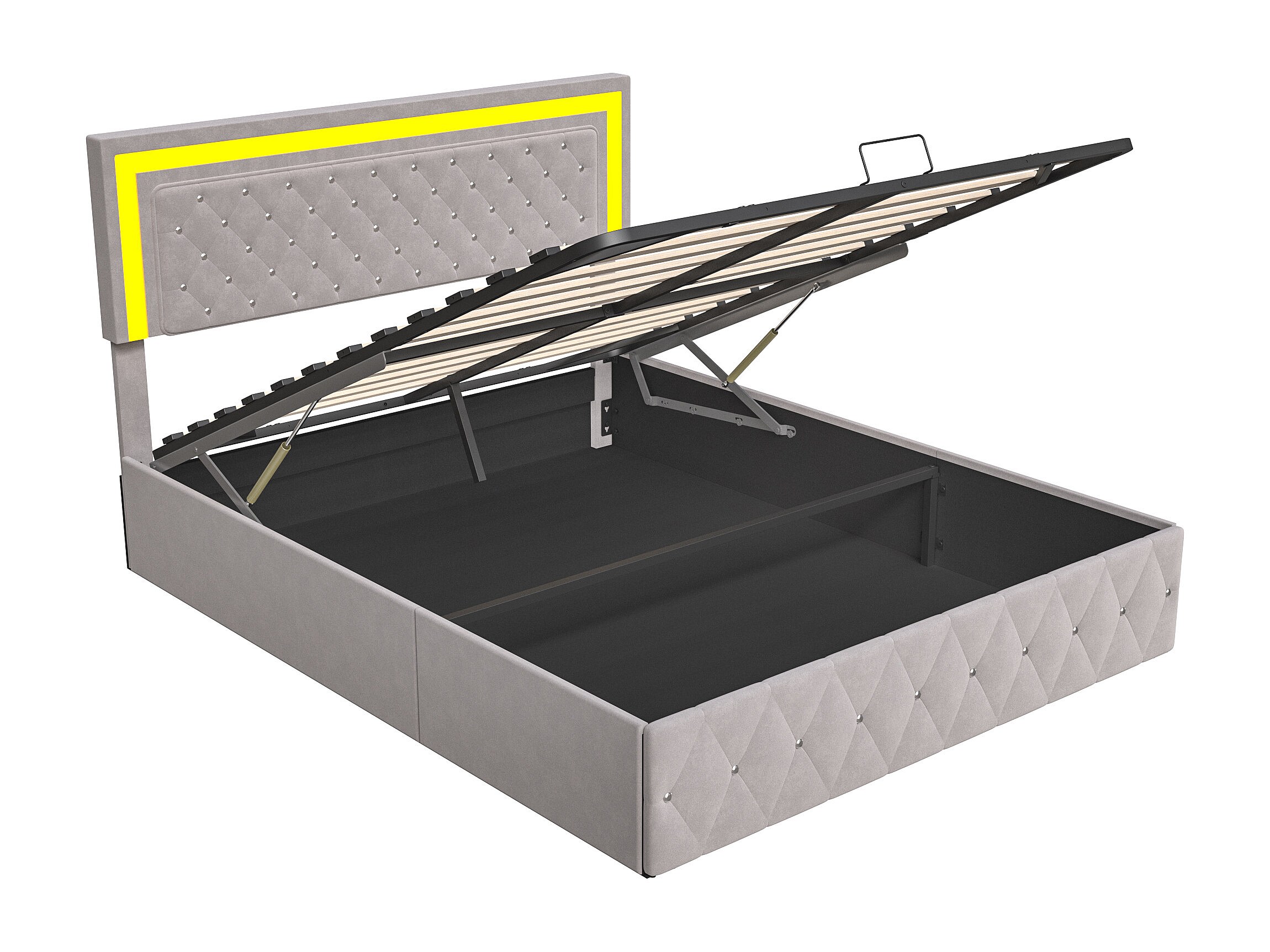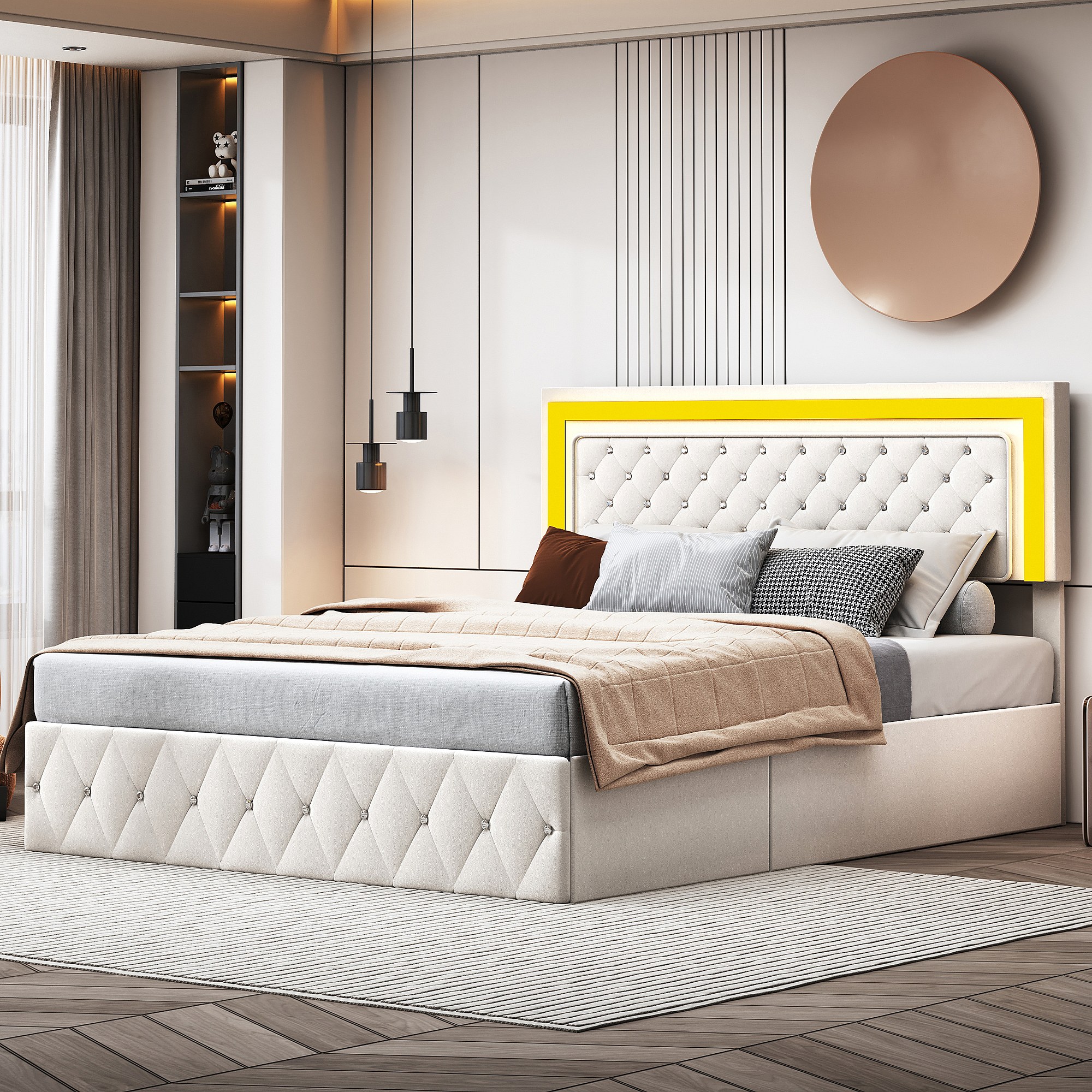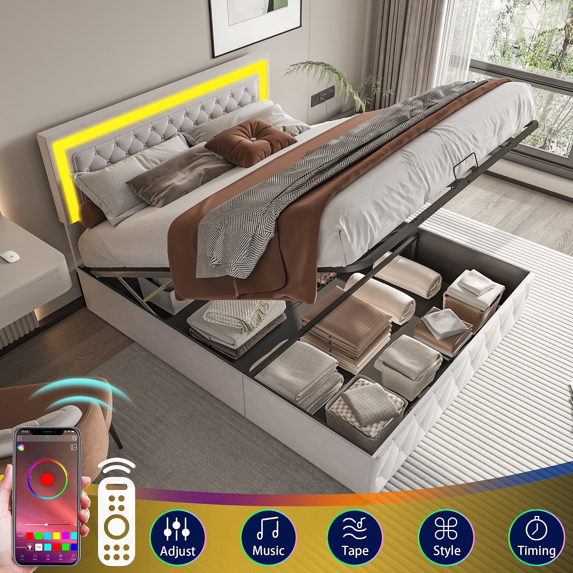 Lit coffre 160x200 cm en velours - avec LED et sommier à lattes - Lit double de rangement - avec tête de lit réglable en hauteur - Beige