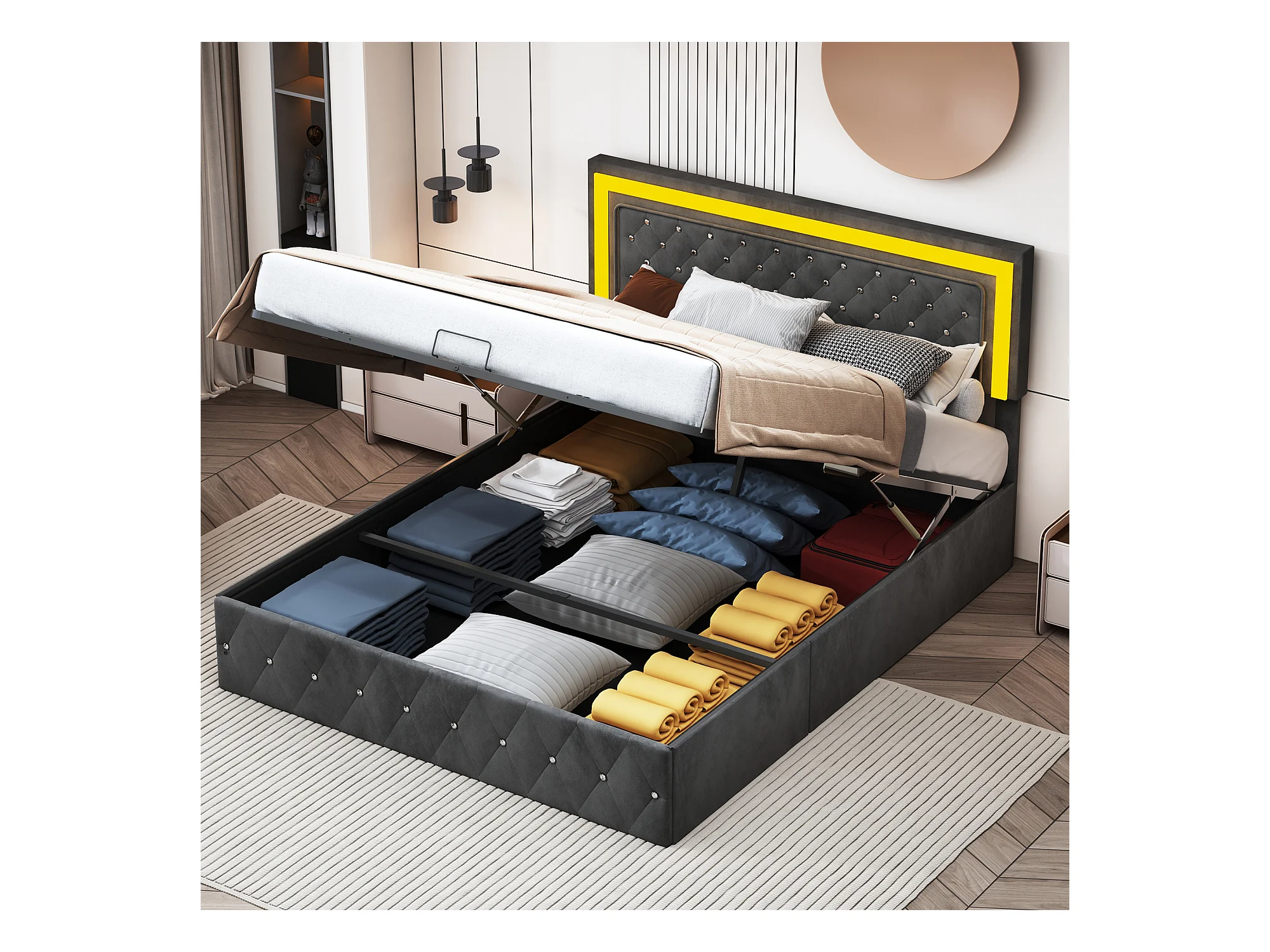 Lit Coffre 160x200 Cm En Velours - Avec LED Et Sommier à Lattes - Lit Double De Rangement - Noir