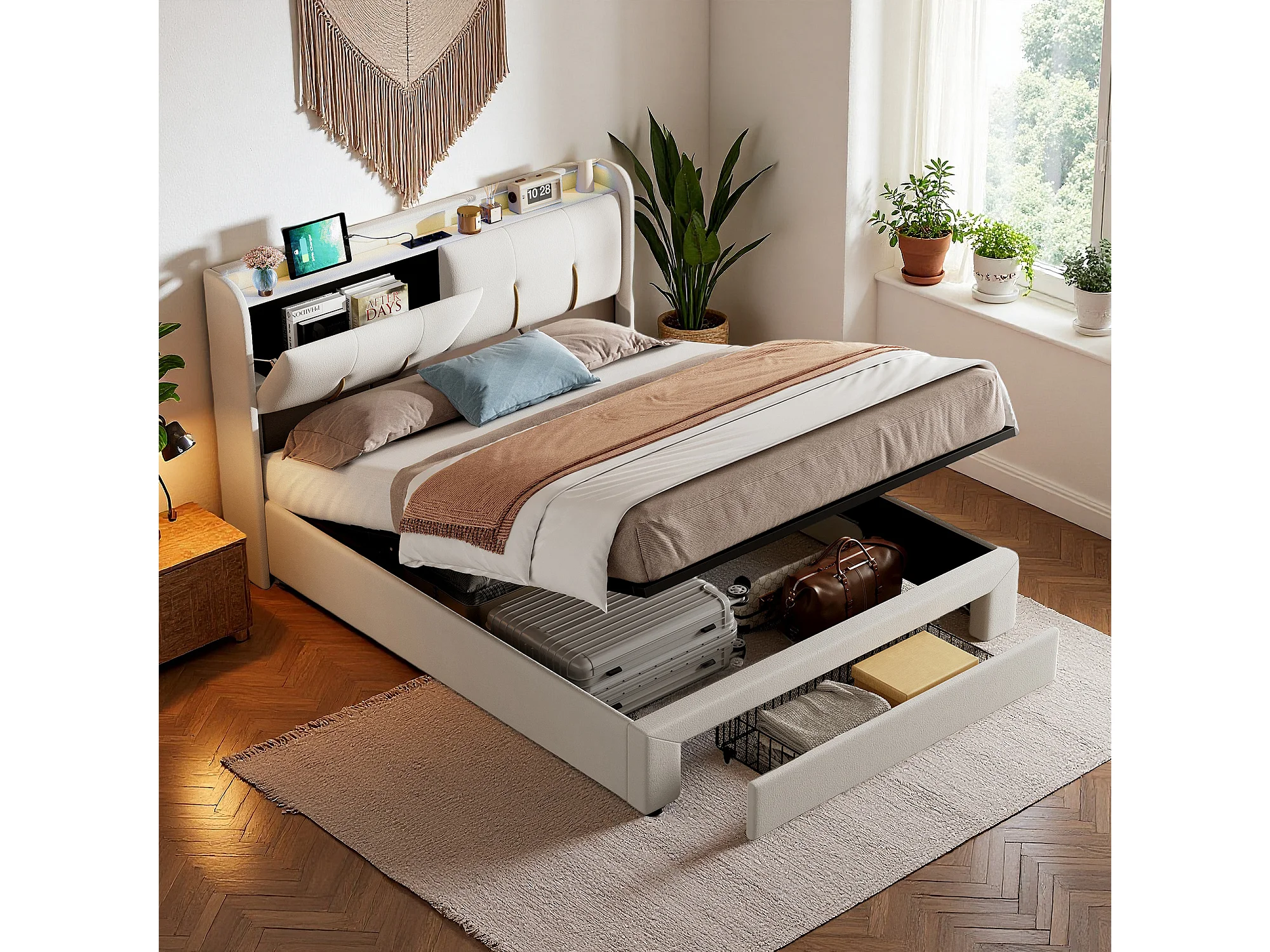 Lit coffre 160x200 cm Ensemble complet - Matelas tête de lit capitonnée et sommier à lattes - lit adulte avec tiroirs - LED et USB - Velours - Blanc
