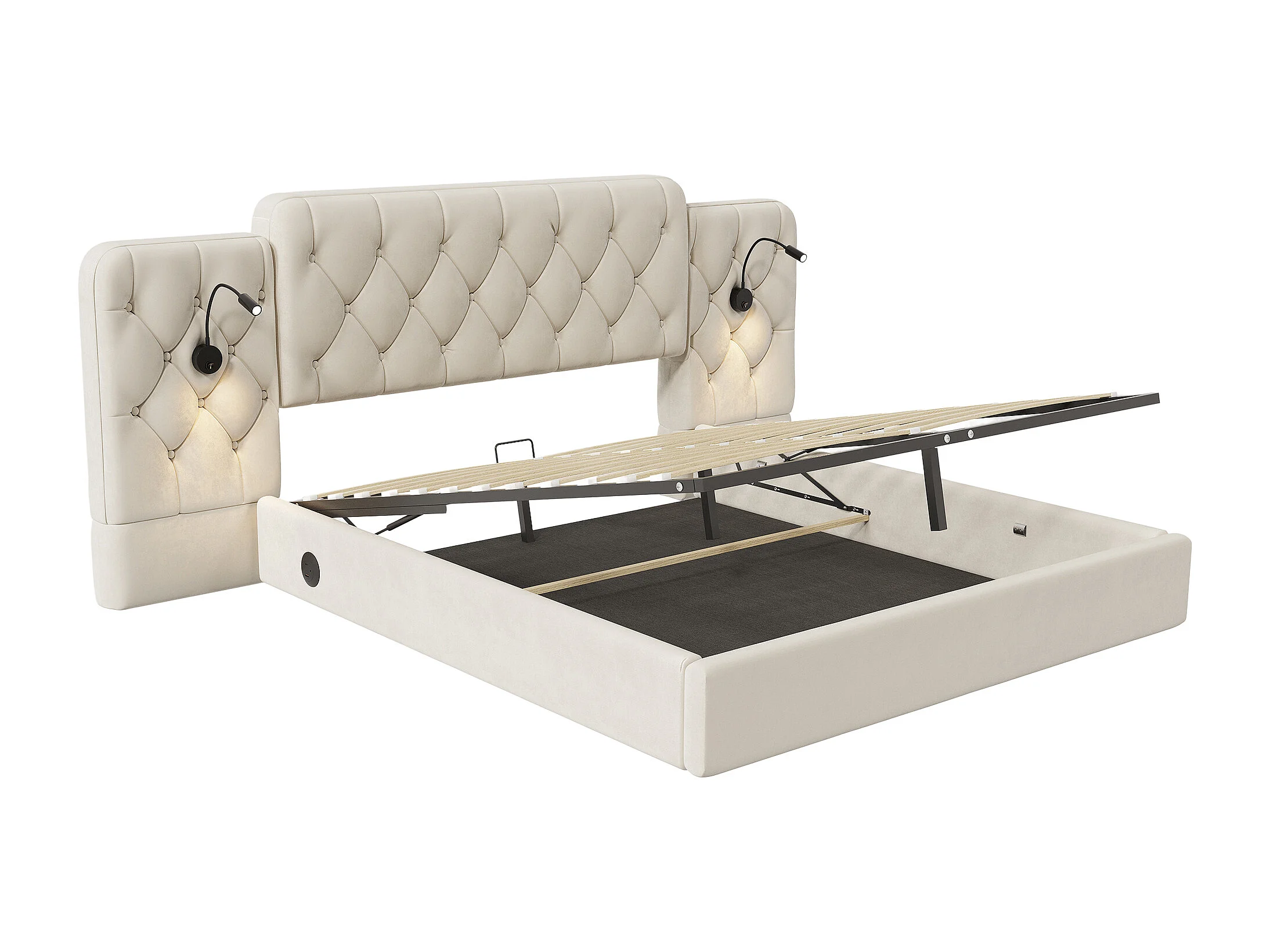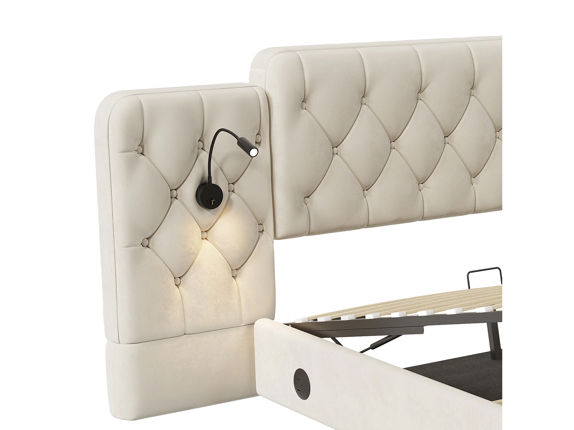 Lit coffre 160x200 cm - Lit adulte avec lampe de lecture et ports USB - velours beige - sans matelas