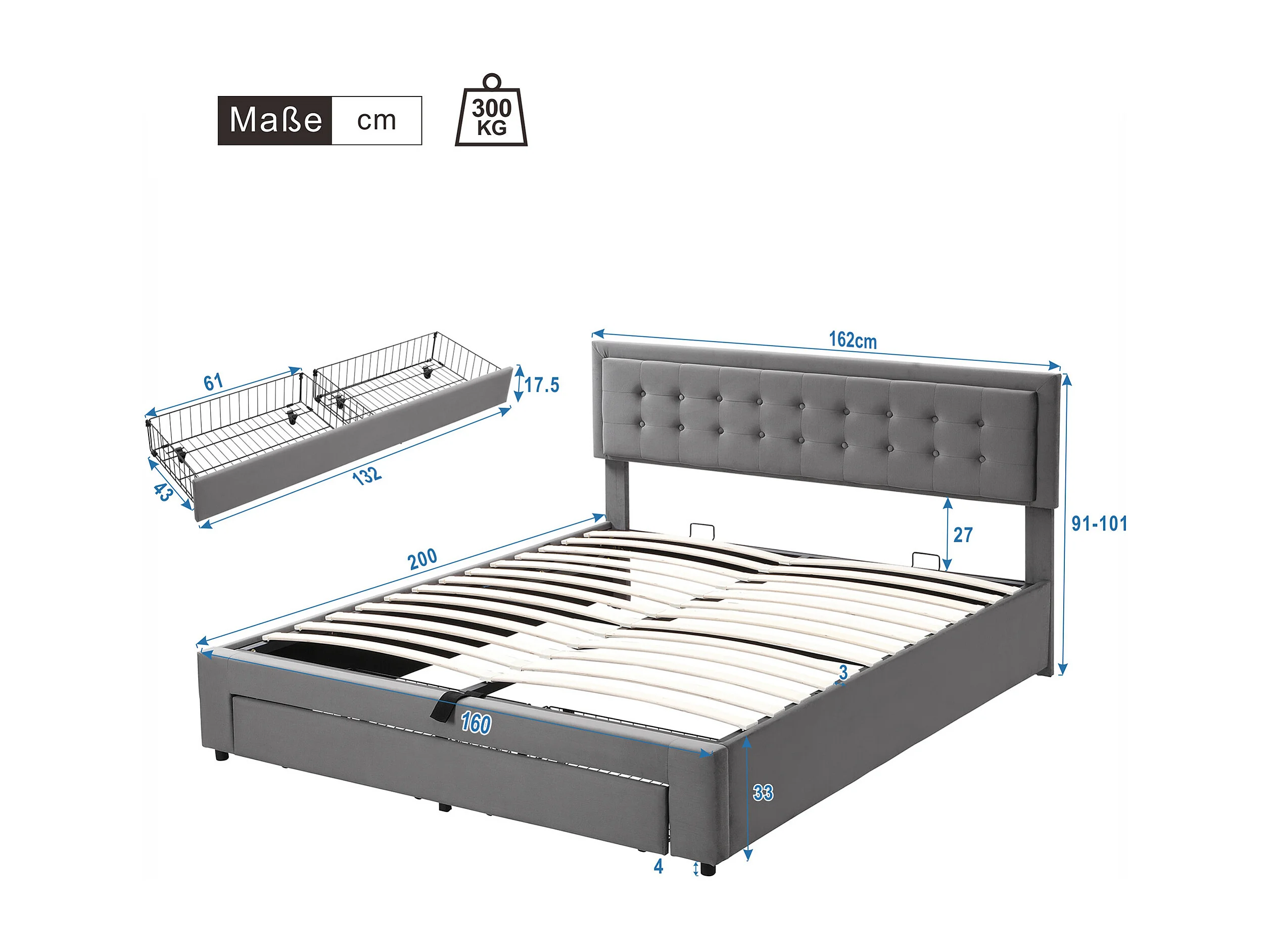 Lit coffre 160x200 cm - Lit adulte avec tiroirs et tête de lit réglable - velours gris - sans matelas