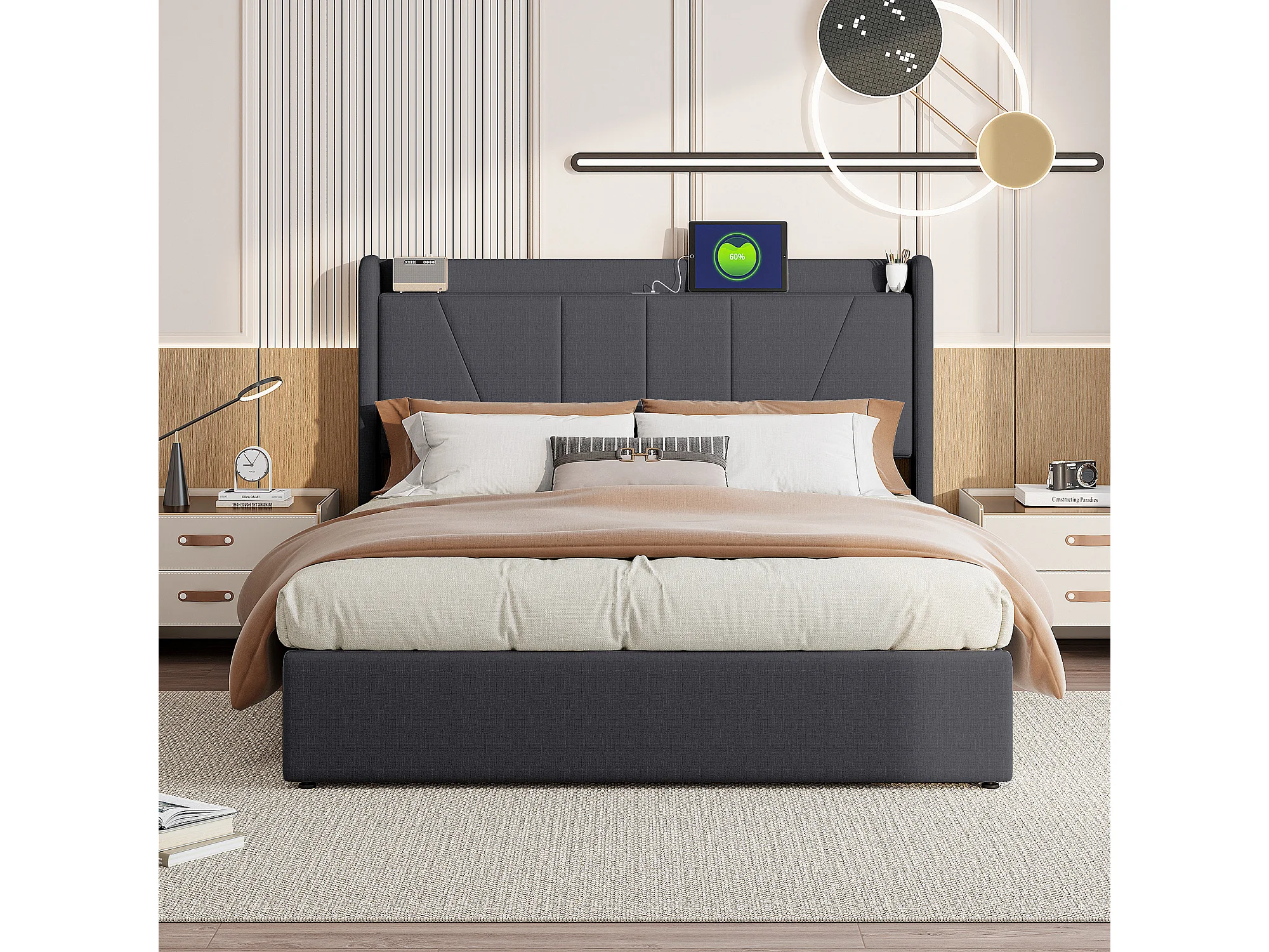 Lit coffre 160x200 cm - Tête de lit avec 2 ports USB + 1 port type-C - Coffre de rangement hydraulique - Lin - Gris