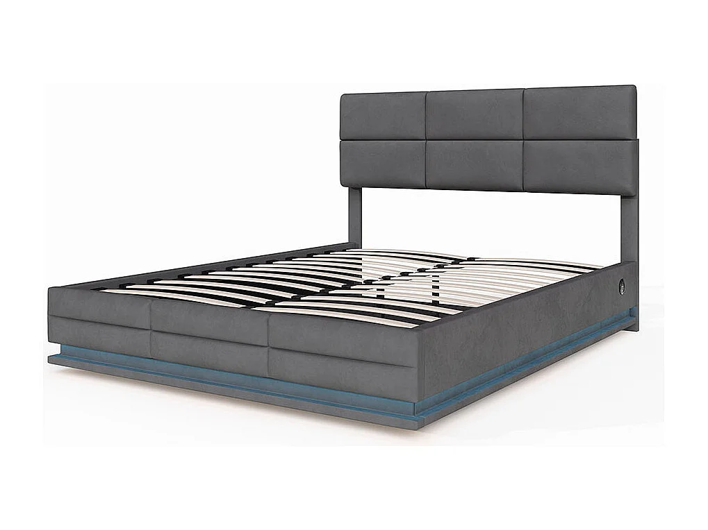 Lit coffre 160x200 lit rembourré en velours avec charge USB-C et éclairage LED lit en métal avec suspension hydraulique gris