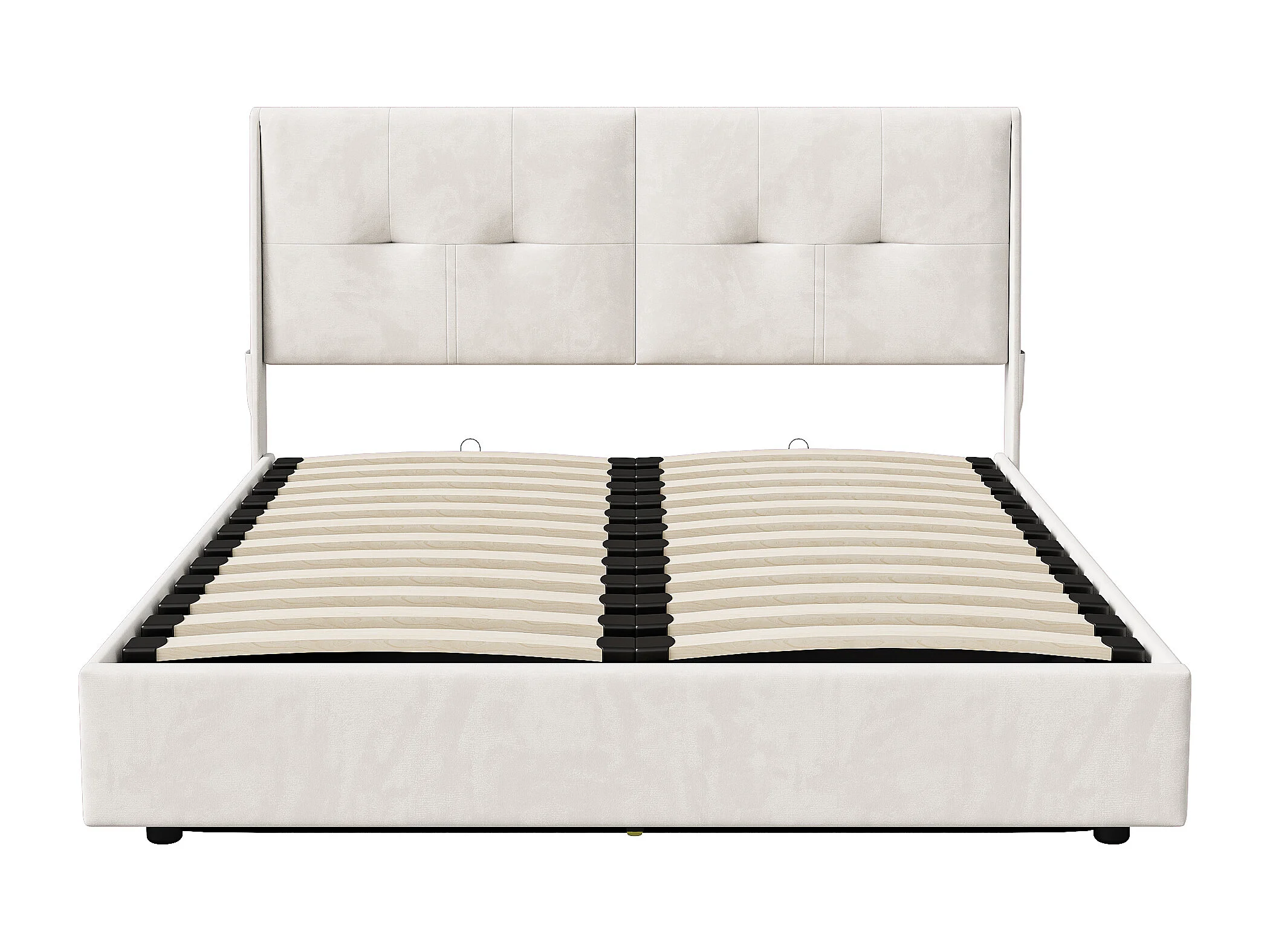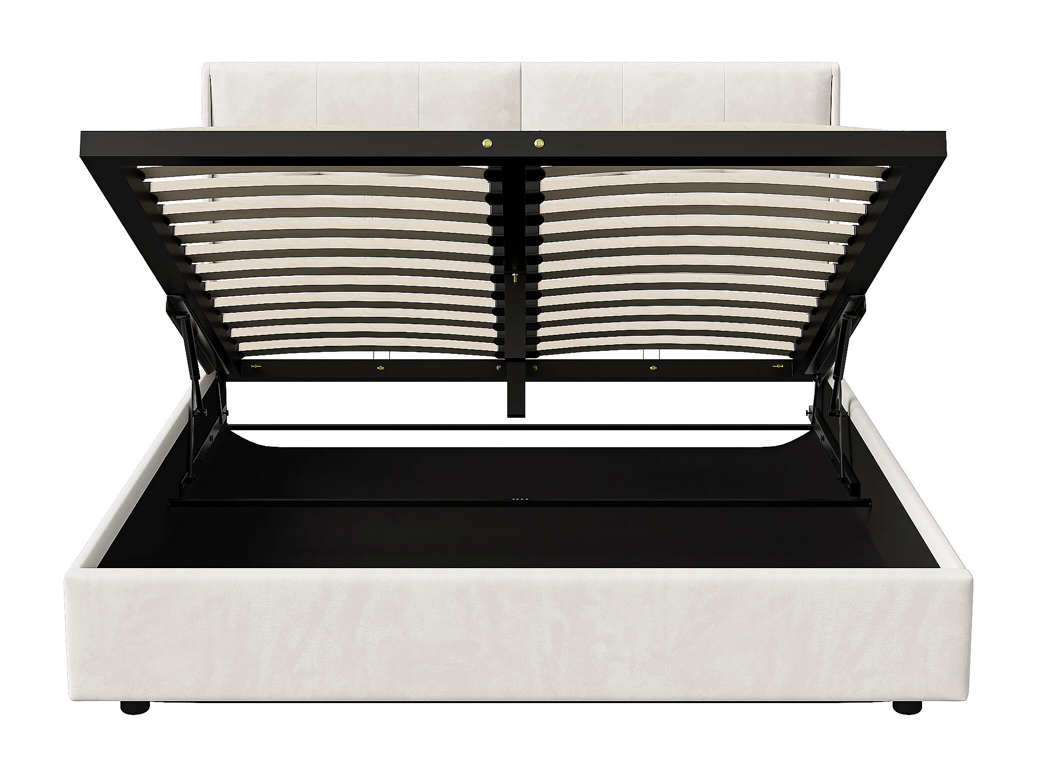 Lit coffre 160x200cm avec éclairage LED et espace de rangement hydraulique - poches latérales dans la tête de lit - beige