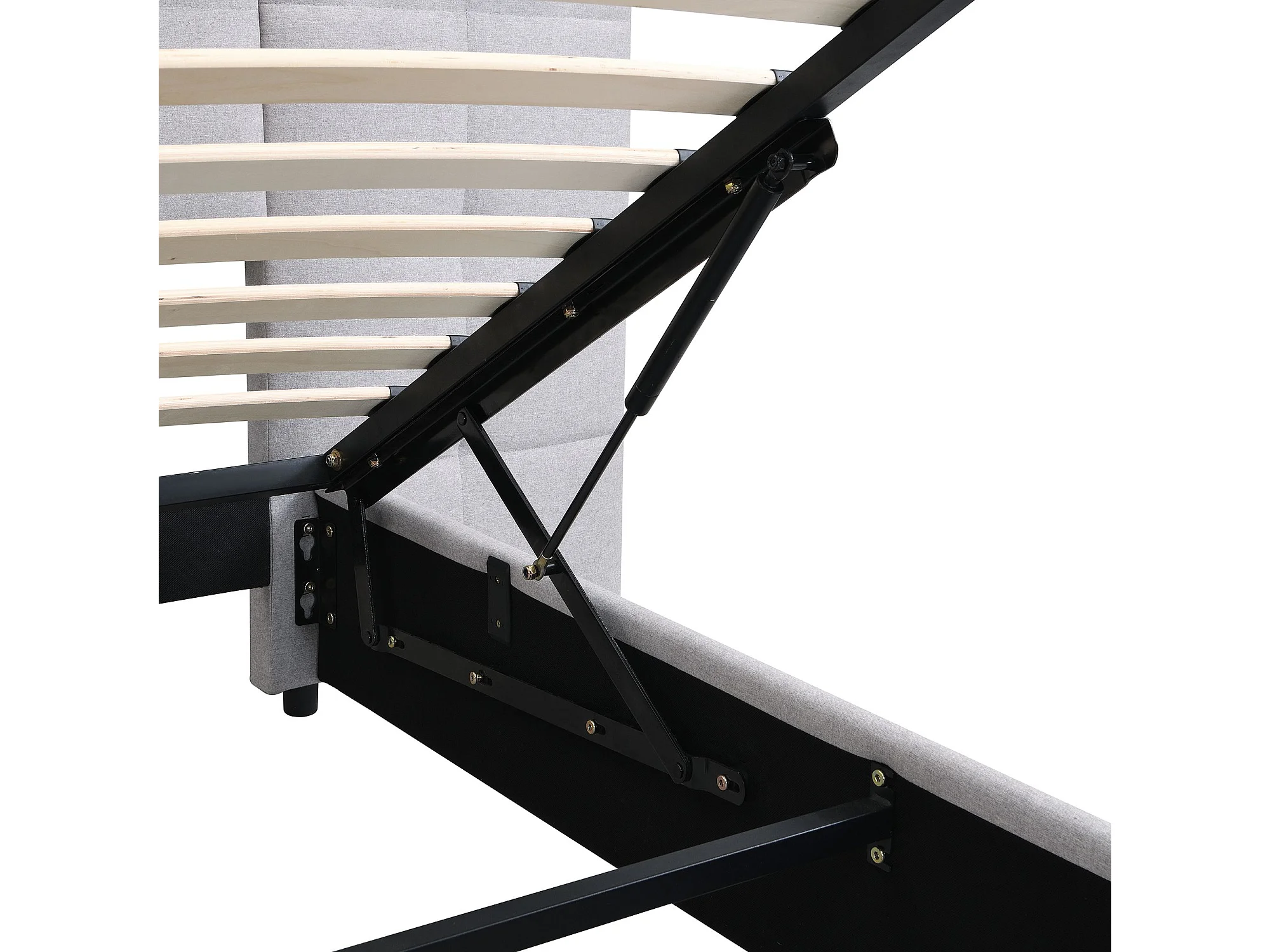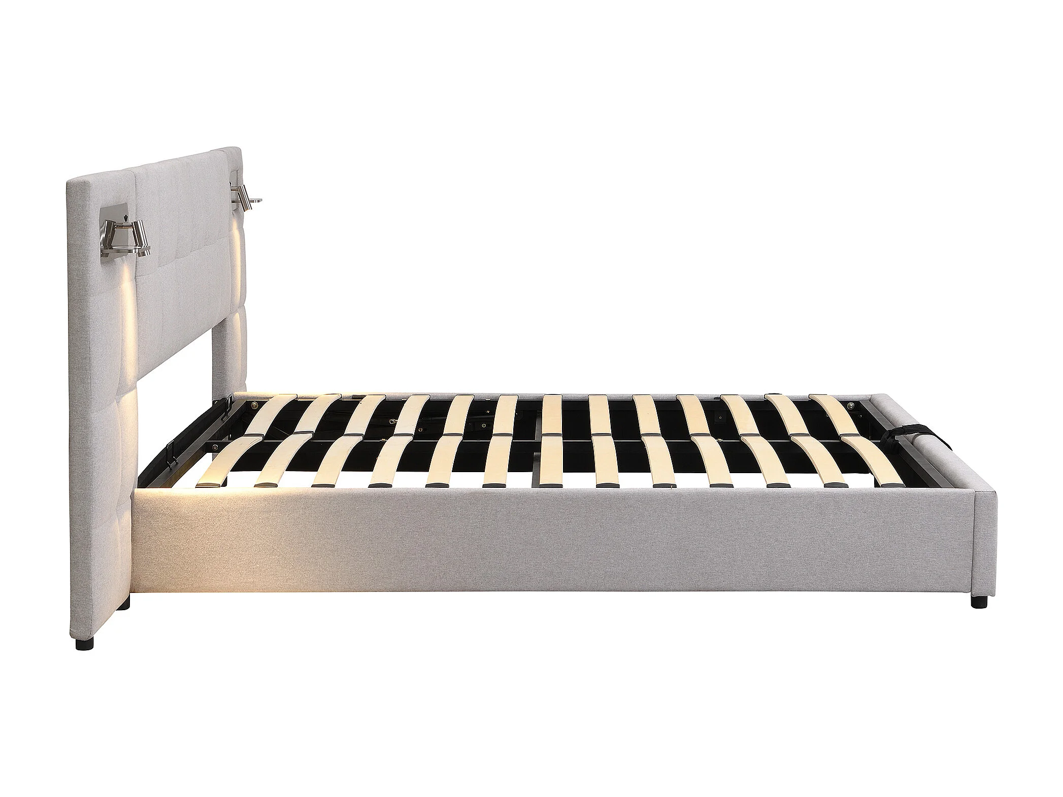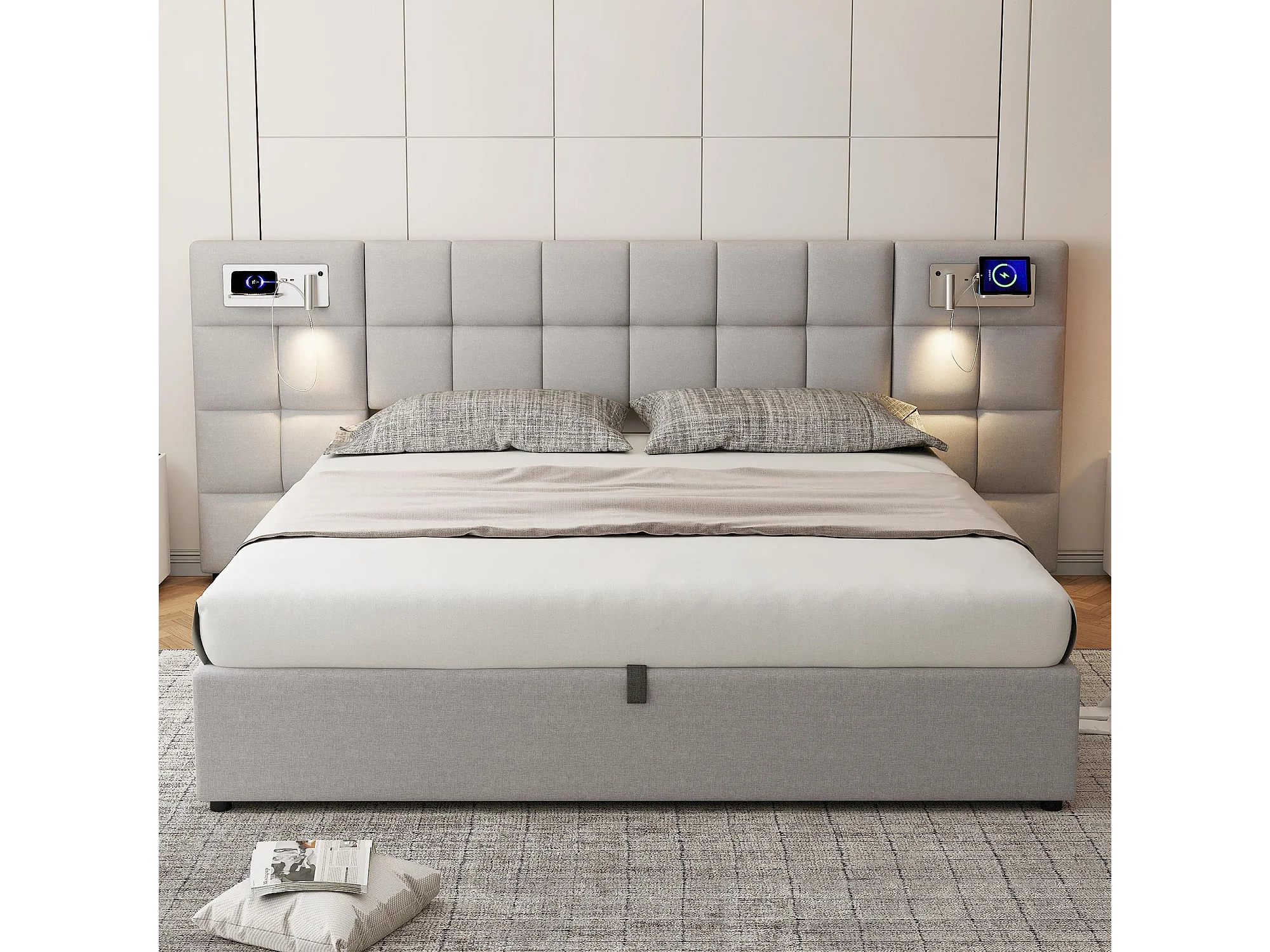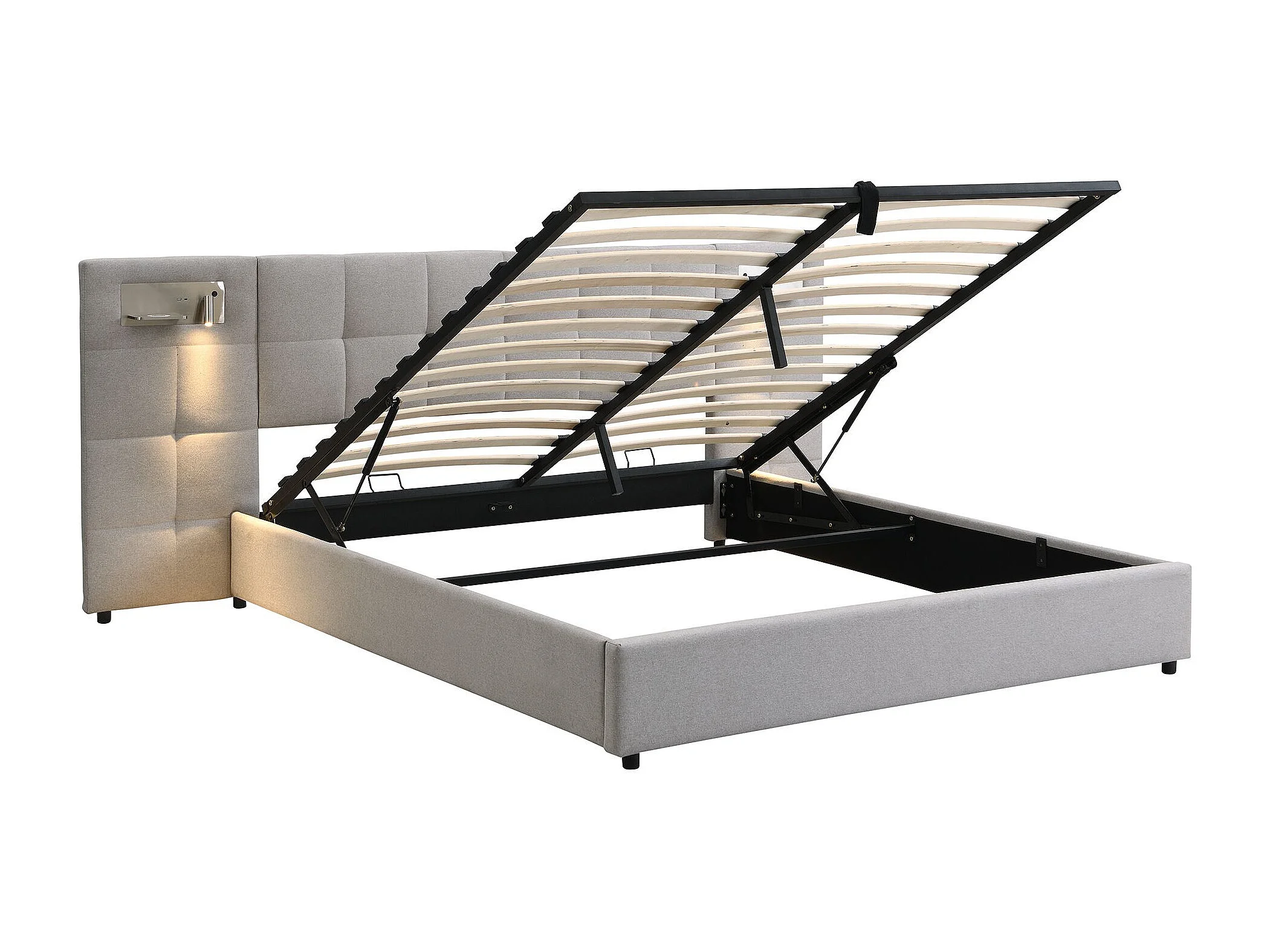 lit coffre 180 x 200 cm - avec tête de lit, USB, sommier à lattes - en lin - gris - sans matelas
