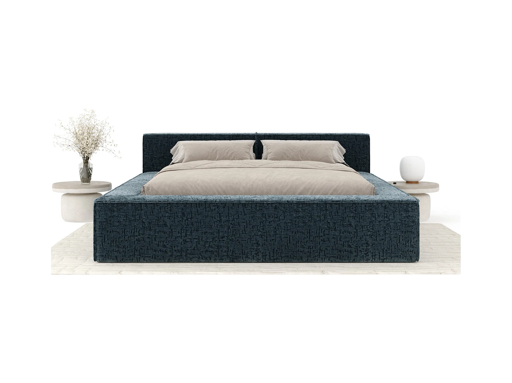 Lit coffre 180 x 200 cm avec tête de lit VOLIERA - en tissu chenille - bleu gris