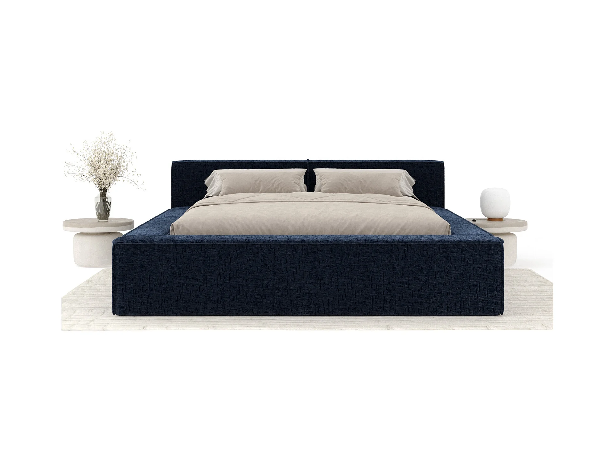 Lit coffre 180 x 200 cm avec tête de lit VOLIERA - en tissu chenille - bleu marine