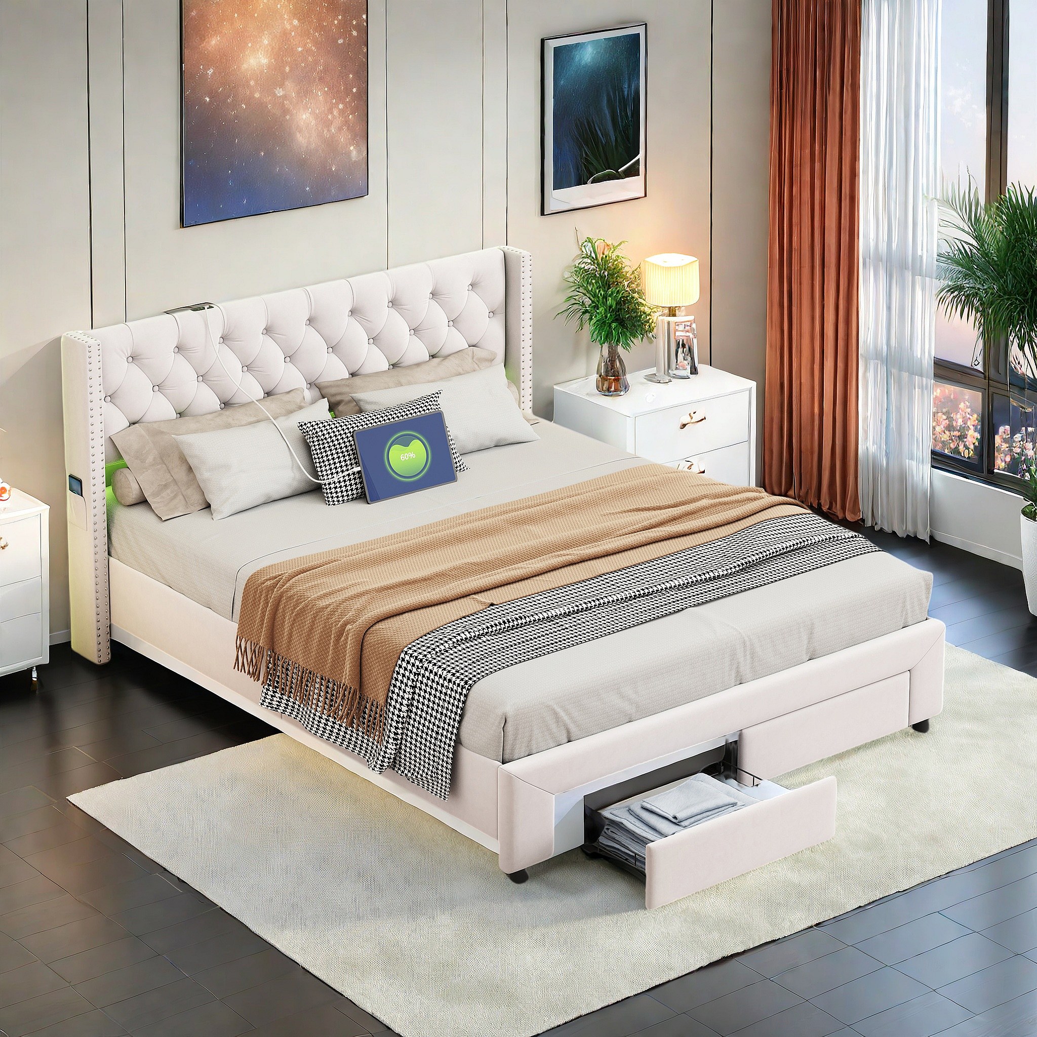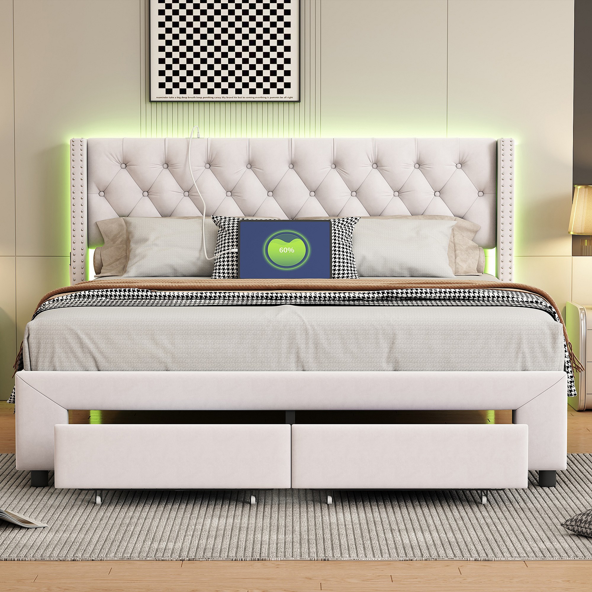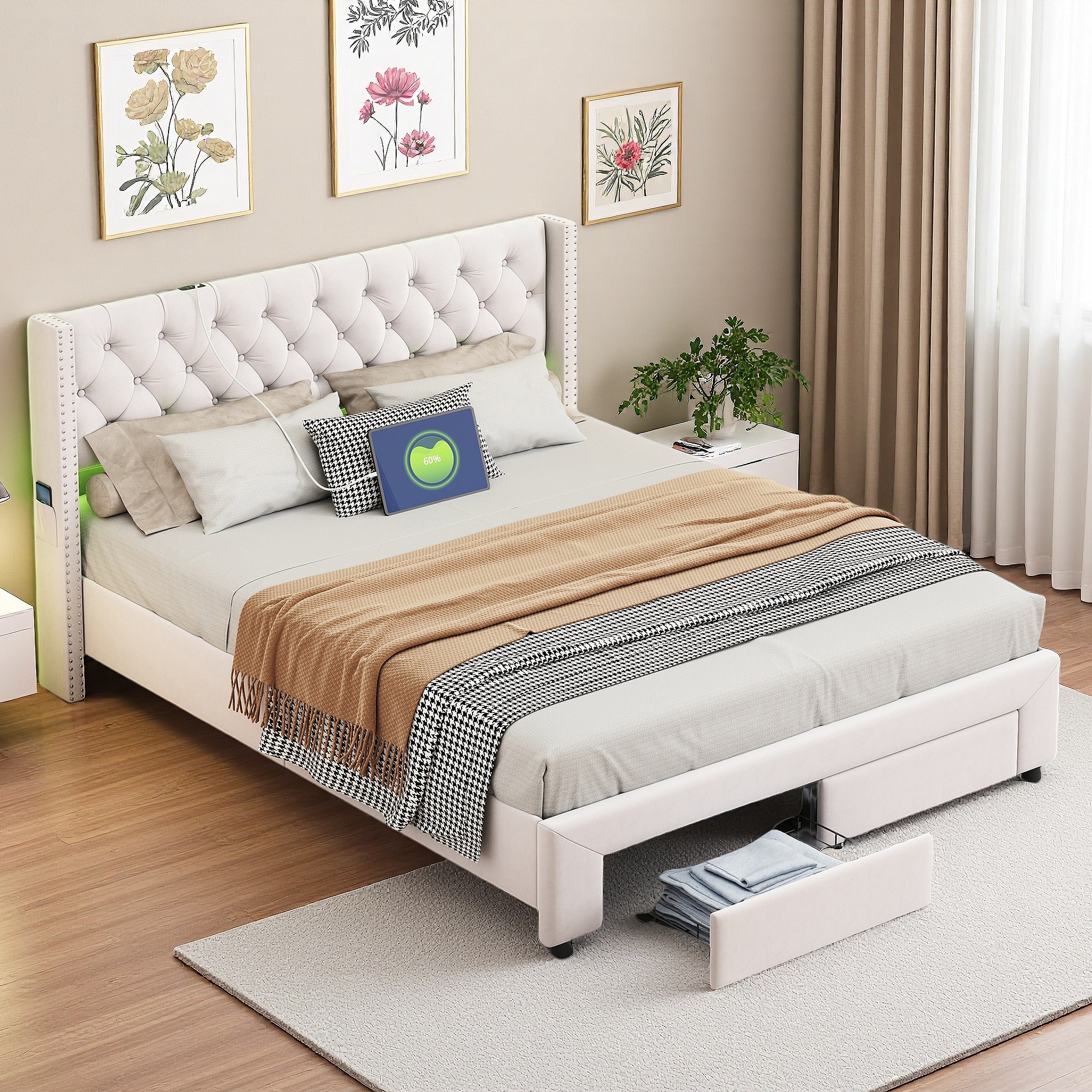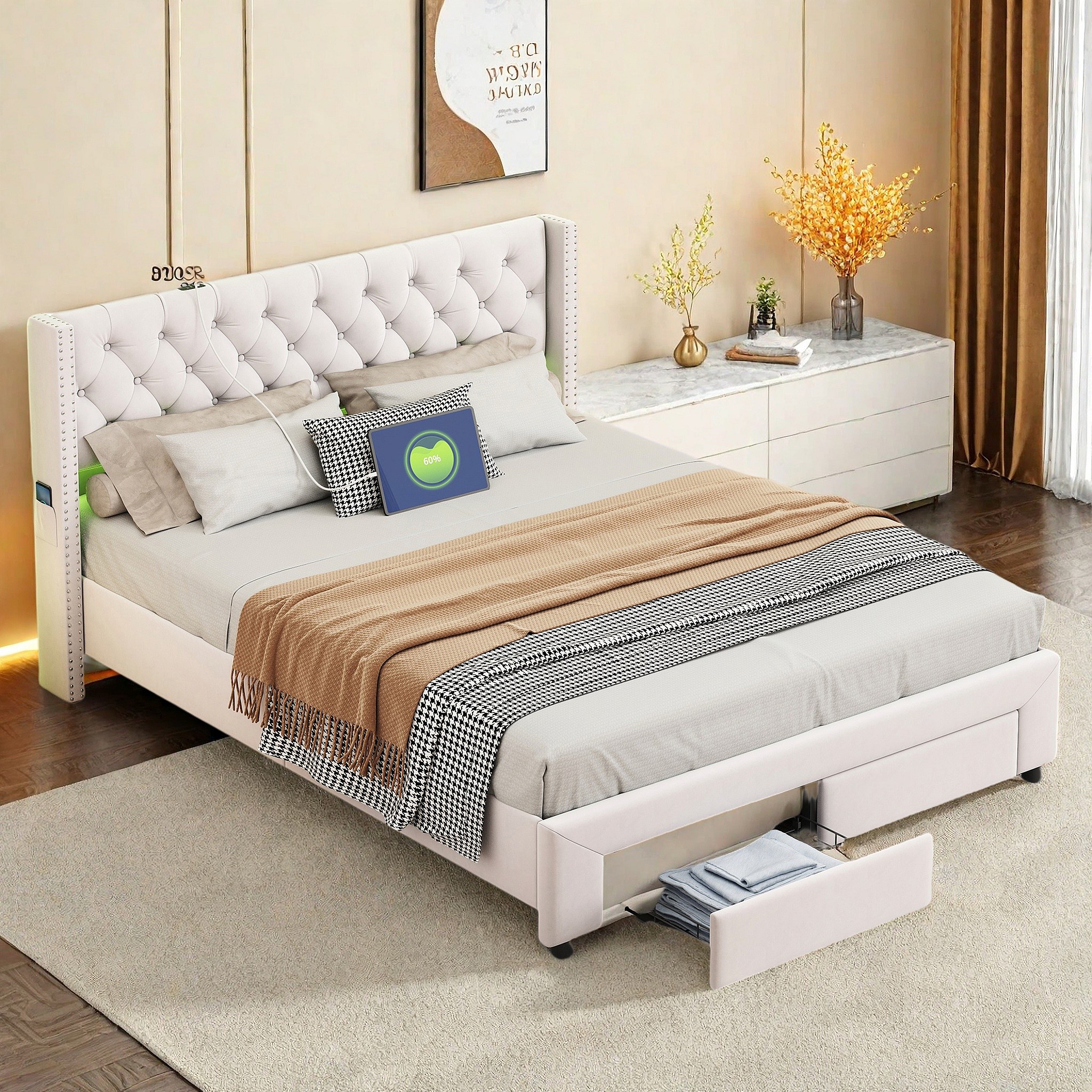 Lit coffre 180x190 cm en velours beige, tête de lit cloutée, 2 tiroirs, ports USB, poches latérales, bande LED amovible