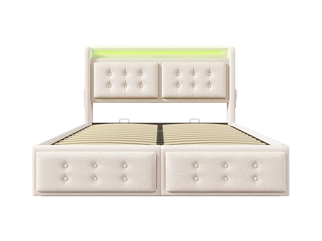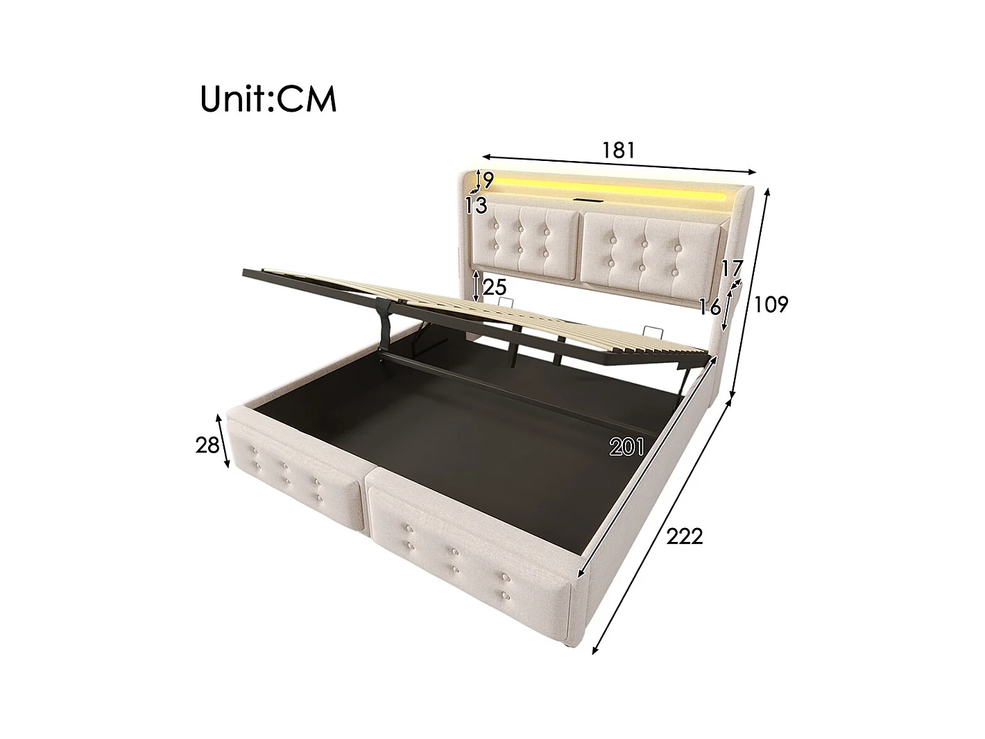 Lit coffre 180x200 avec tête de lit LED et fonction de recharge USB C avec sommier à lattes Sans matelas Coton Beige