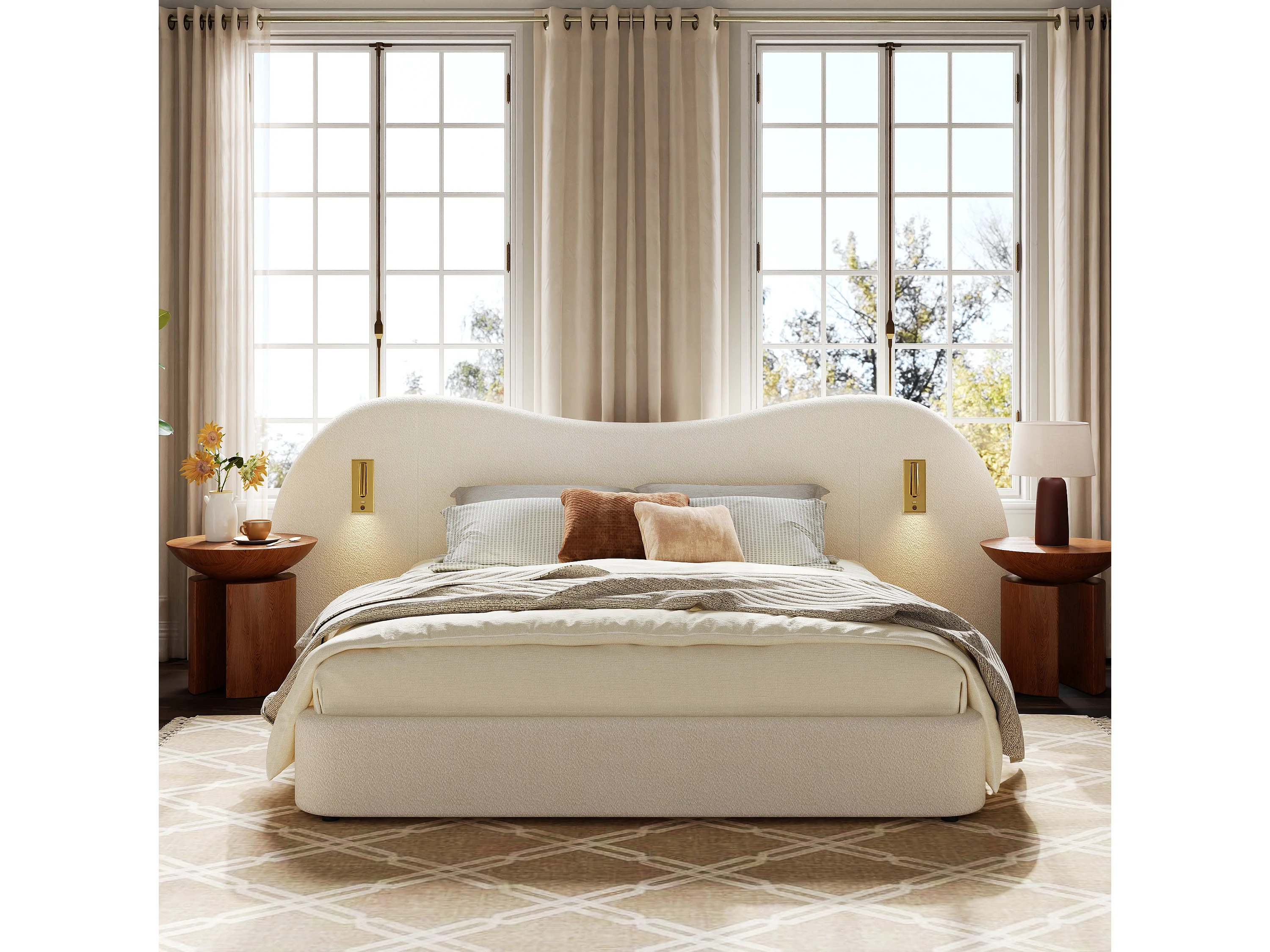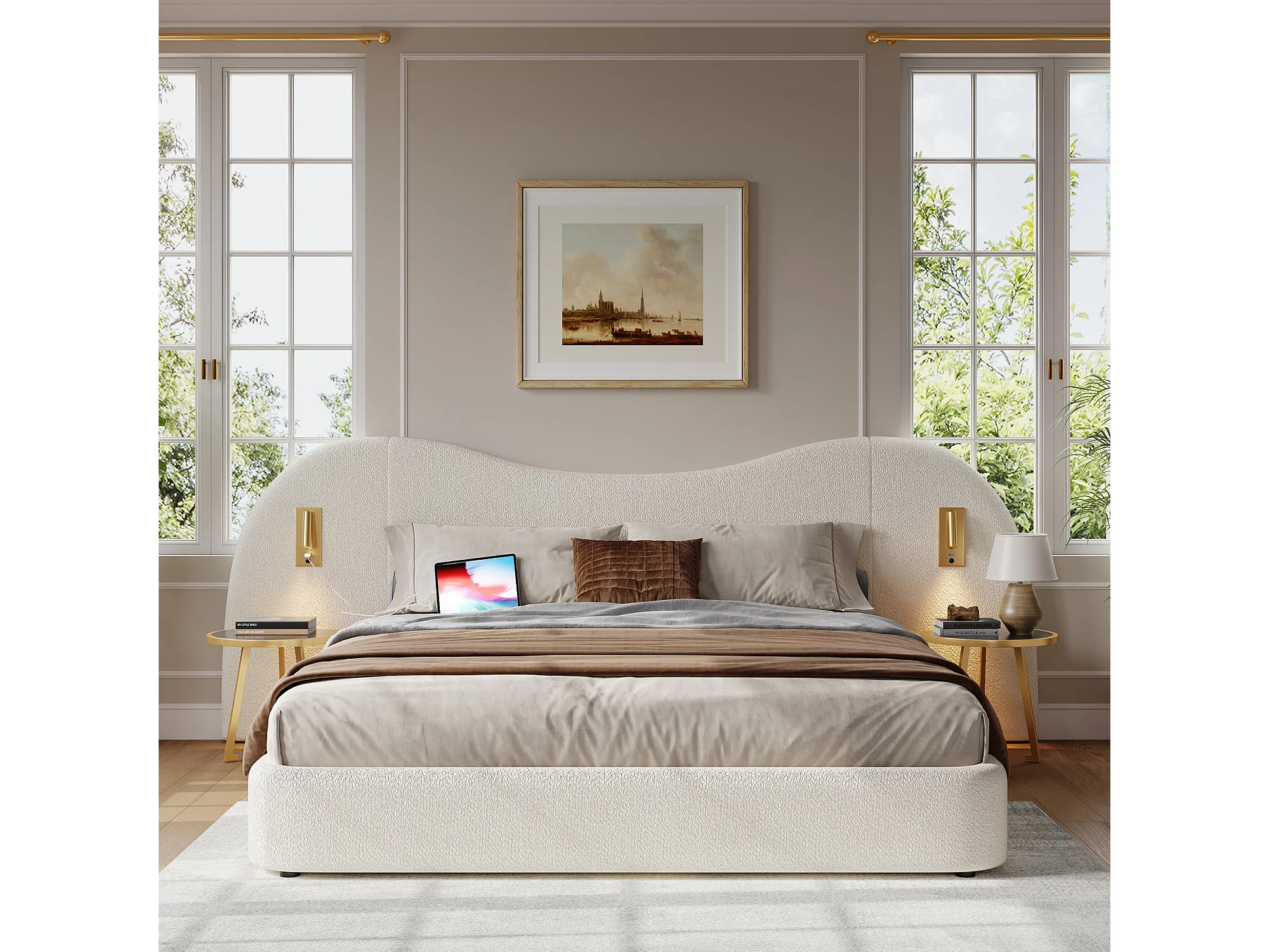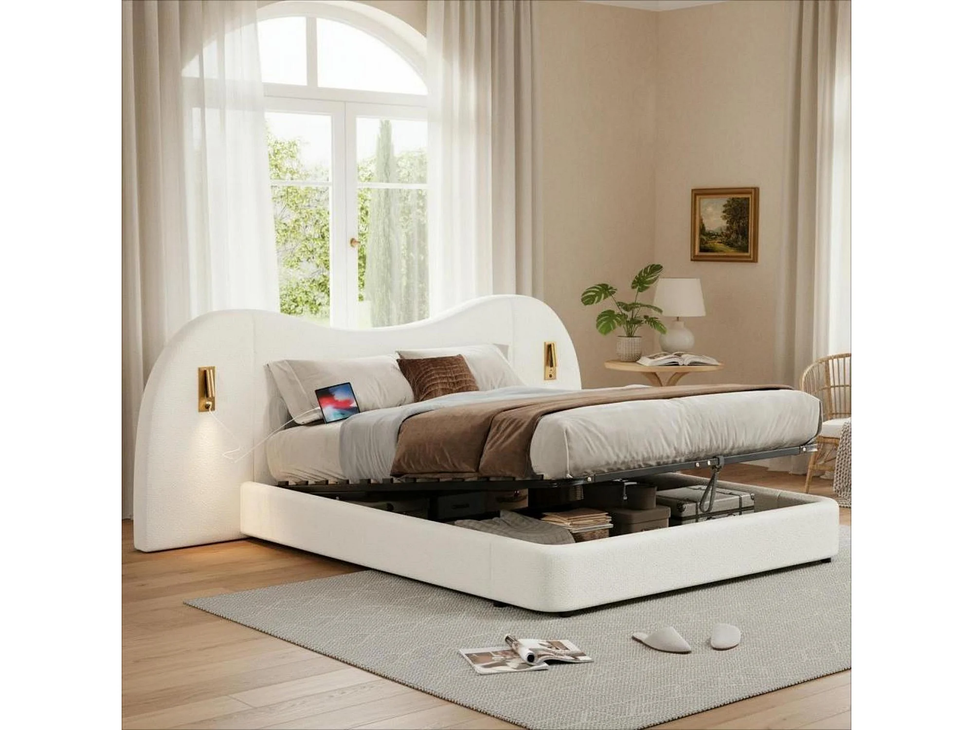 Lit coffre 180x200 cm avec sommier à lattes, lit double fonctionnel hydraulique, tête de lit rembourrée et rangement, port de USB et lampe de lecture, Blanc