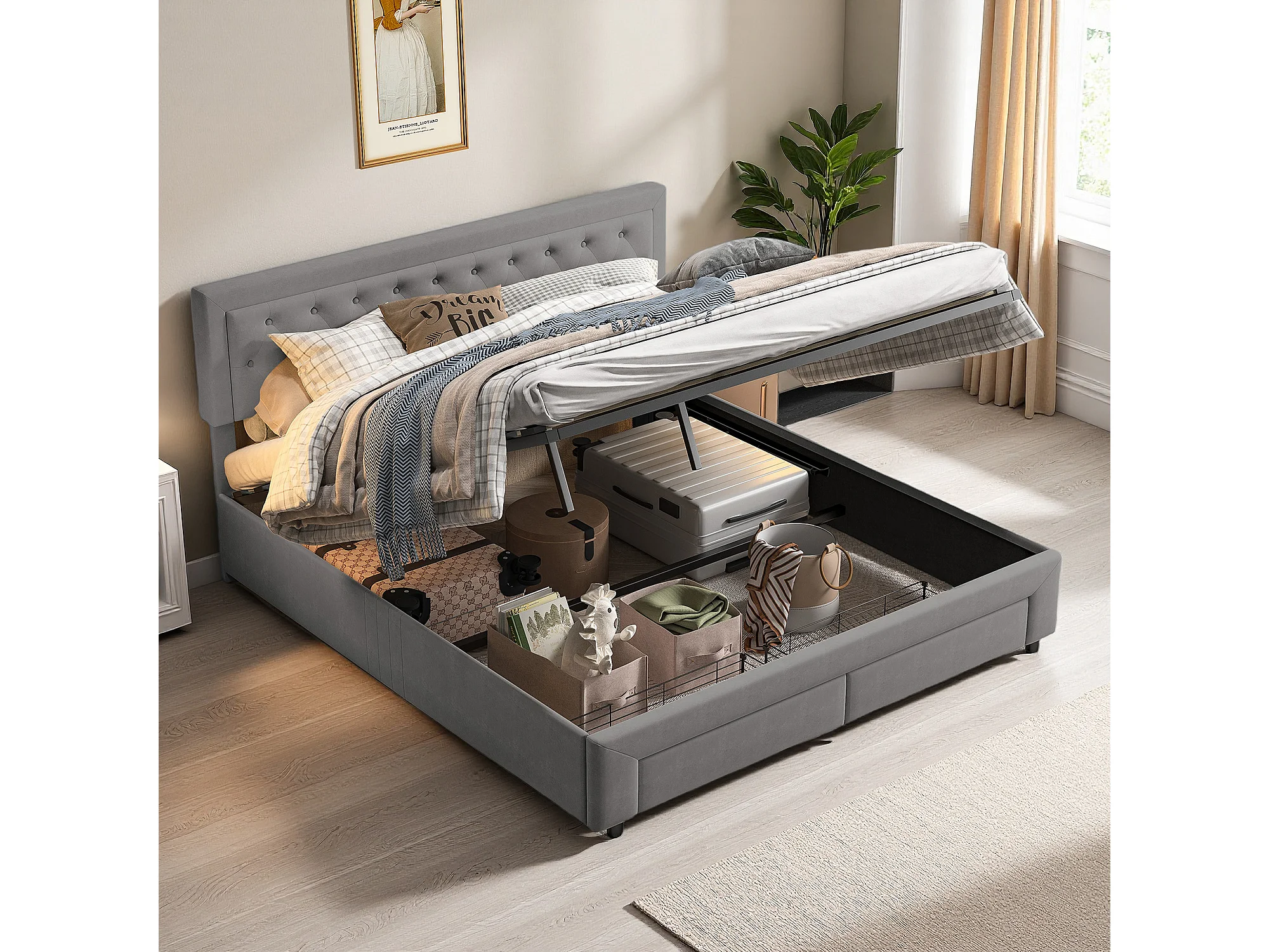 Lit coffre 180x200 cm avec tête de lit - lit adulte 180x200 cm rangements et tiroirs - sommier à Lattes - velours - gris