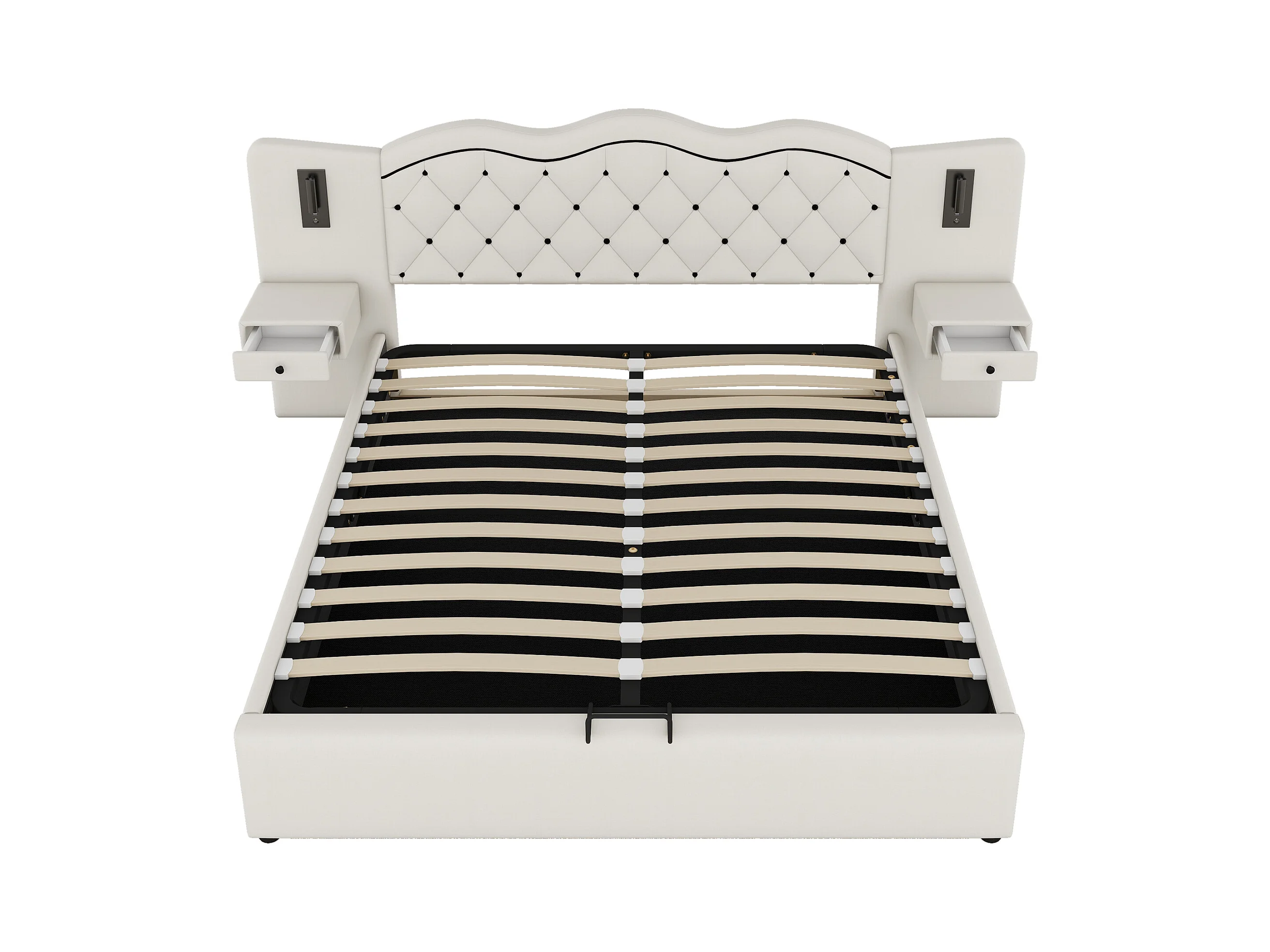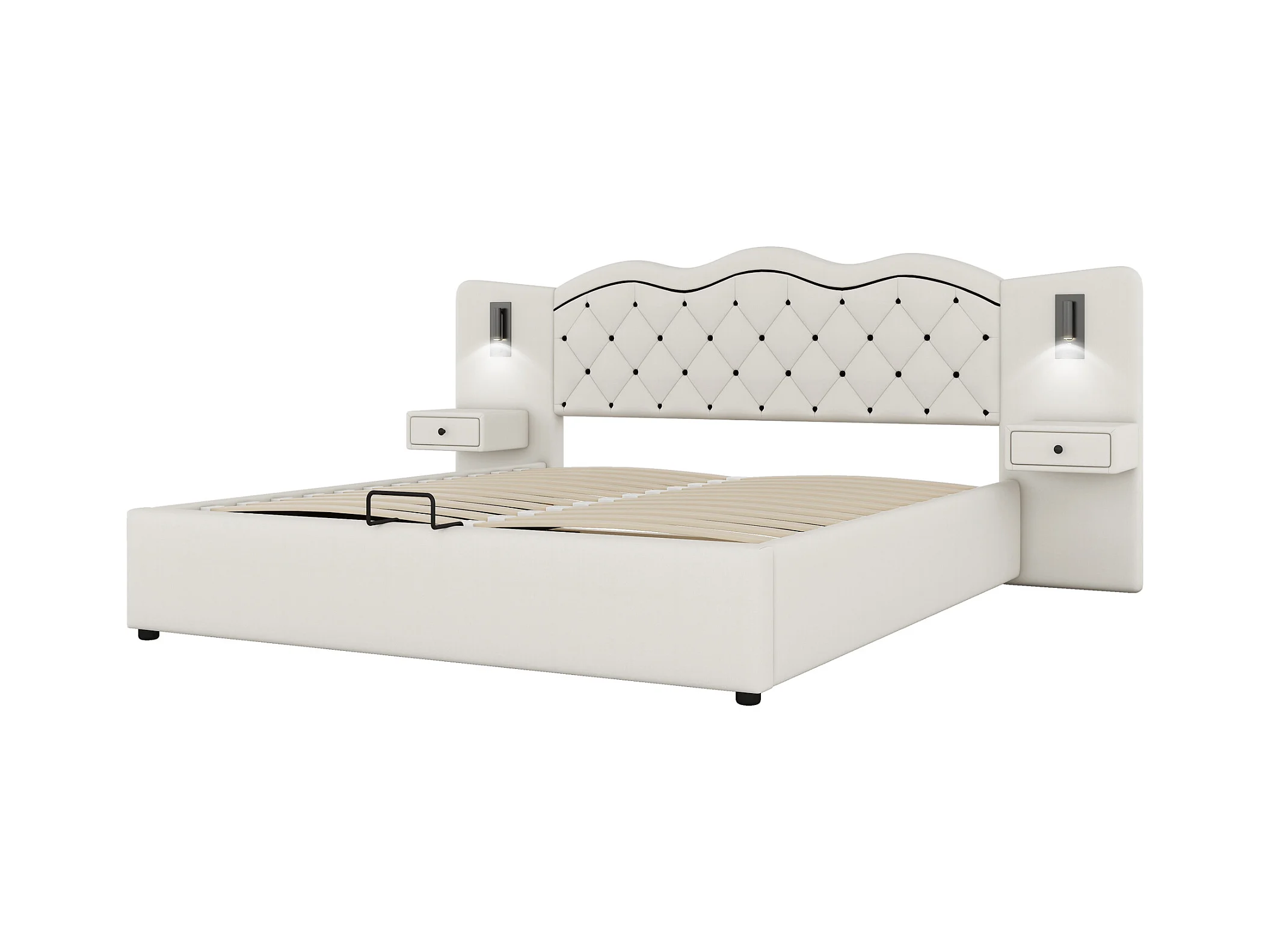 Lit coffre 180x200 cm en lin - 2 chevets de rangement avec prise USB et lampes - Beige