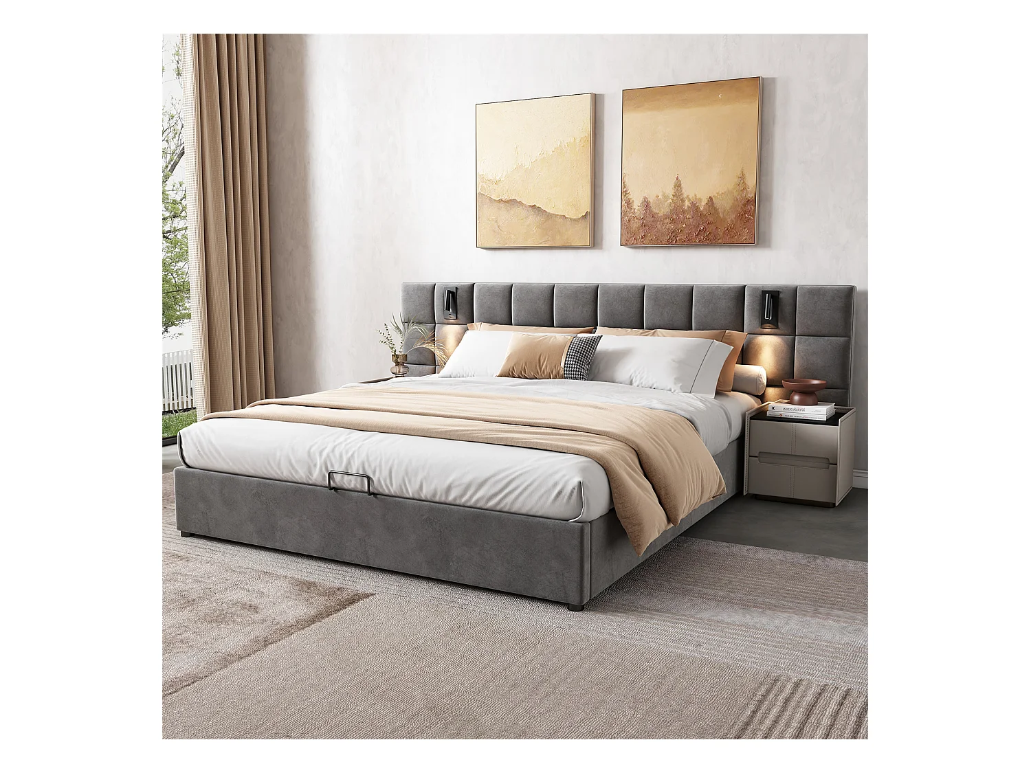 Lit coffre 180×200 cm, lit avec rangement, lampe et charge USB, gris